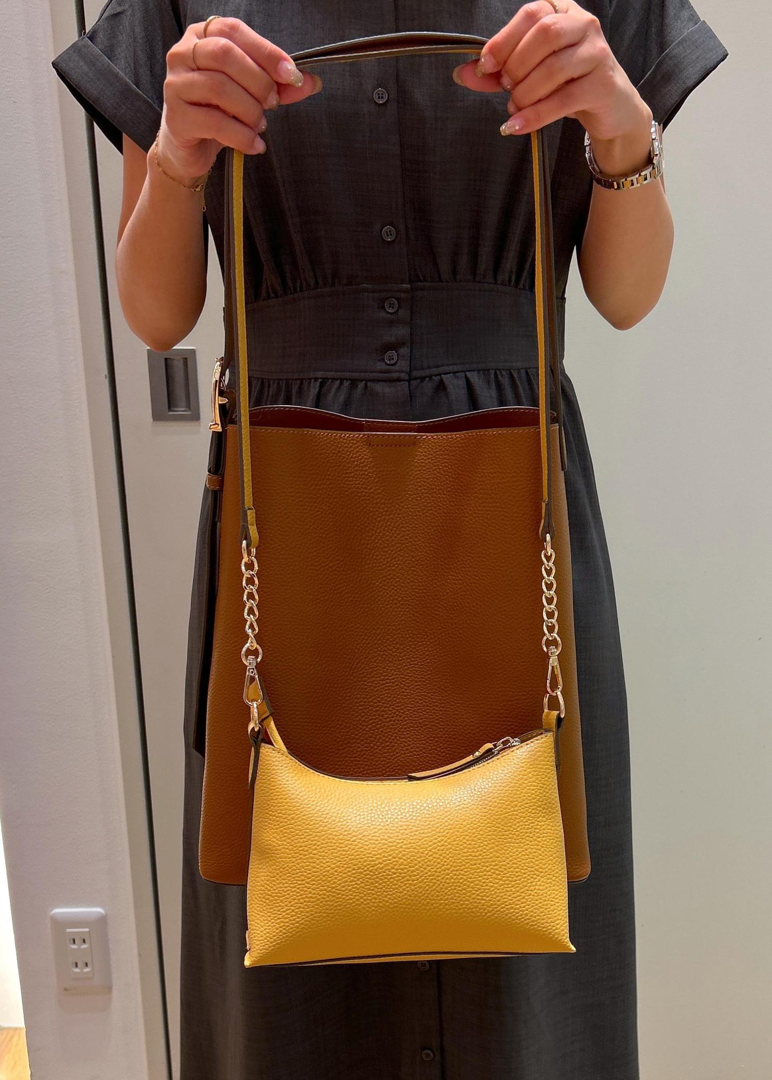 カラーはブラウンの秋カラーでまだまだ暑い時期にも着ていただけます。差し色に黄色のバッグを合わせました!