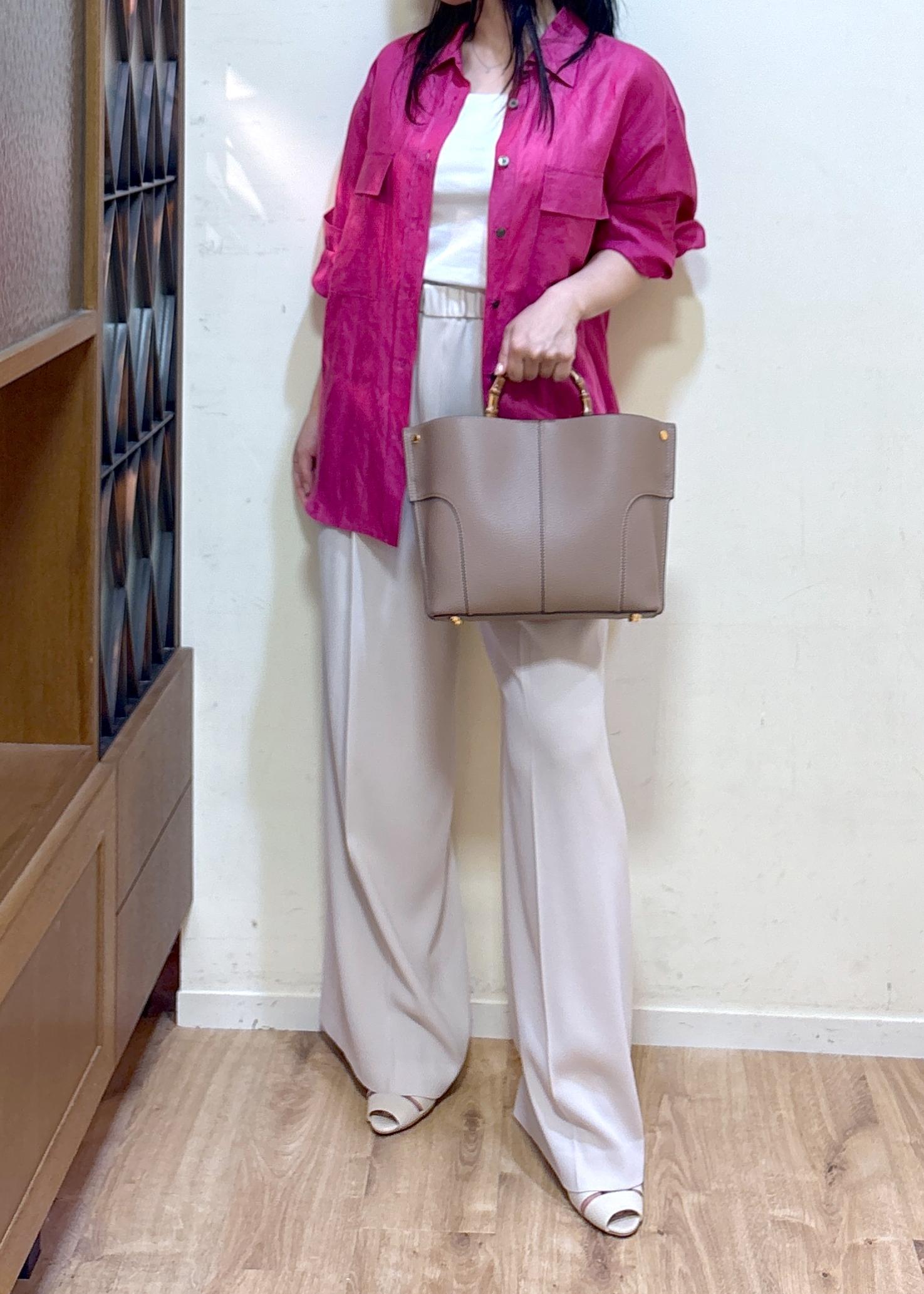 バンブーハンドルが上品で、お仕事からオフのカジュアルスタイルまで幅広く合わせることができます。