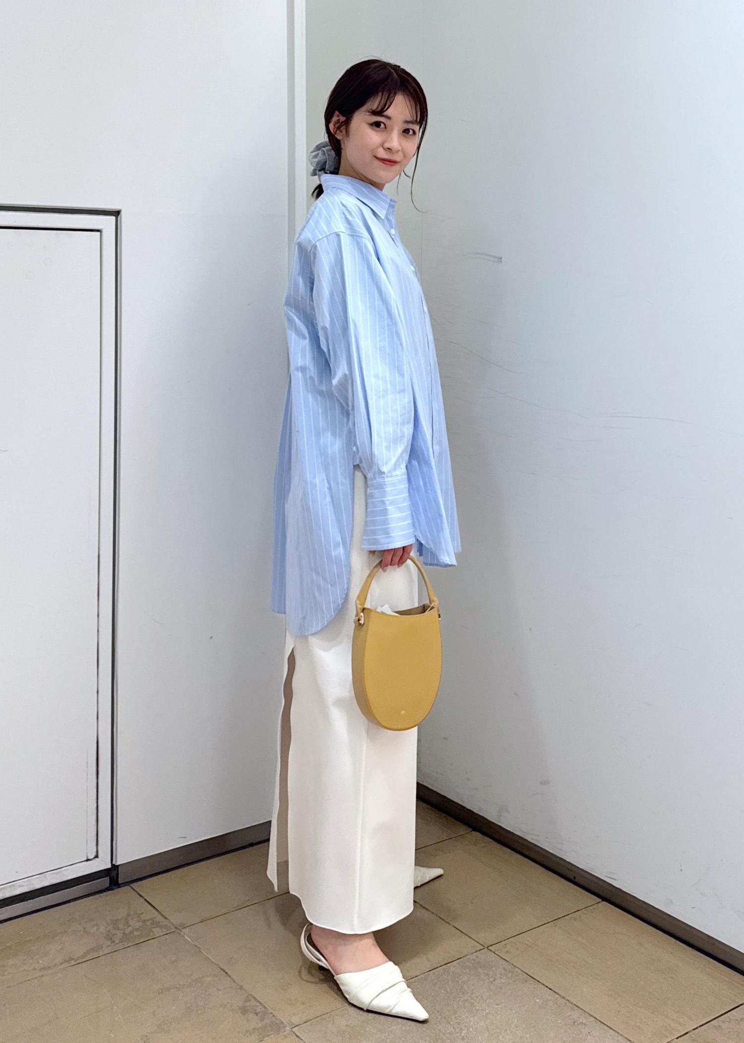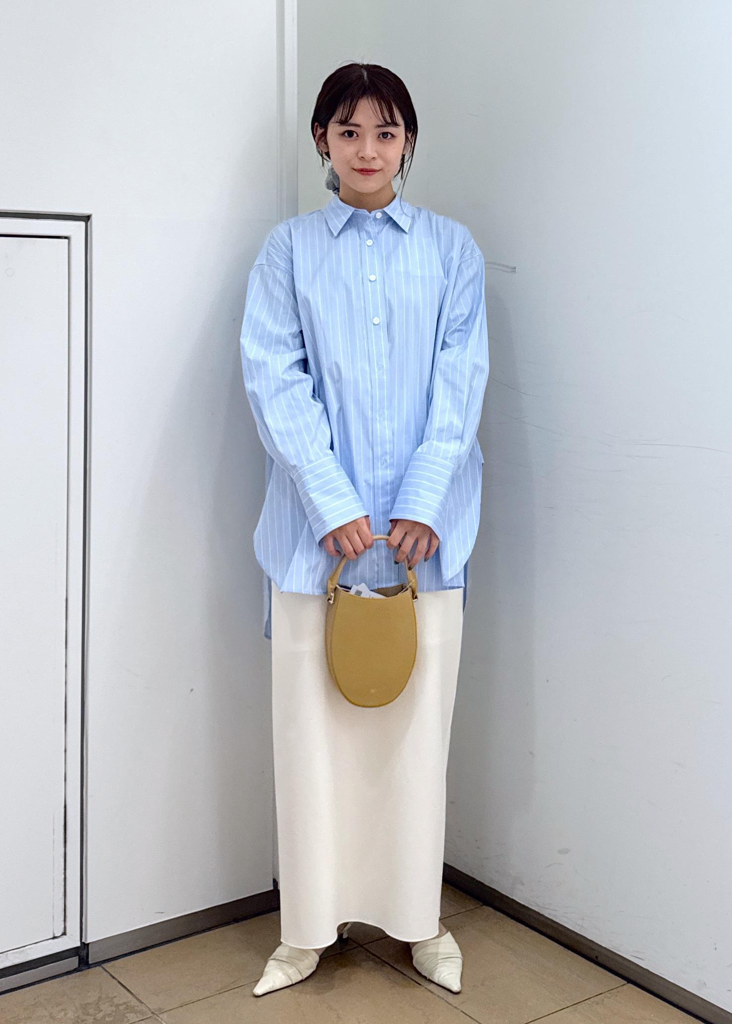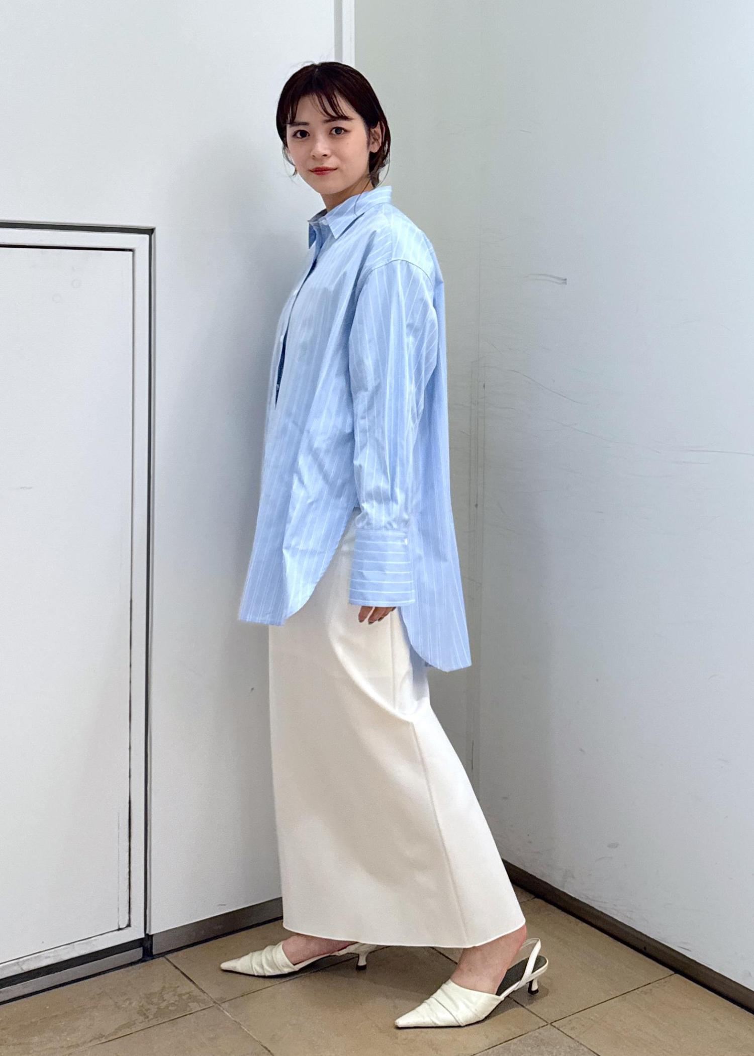 オーバーサイズで丈も長めですが、スッキリとしたスカートのシルエットともバランス◎です。