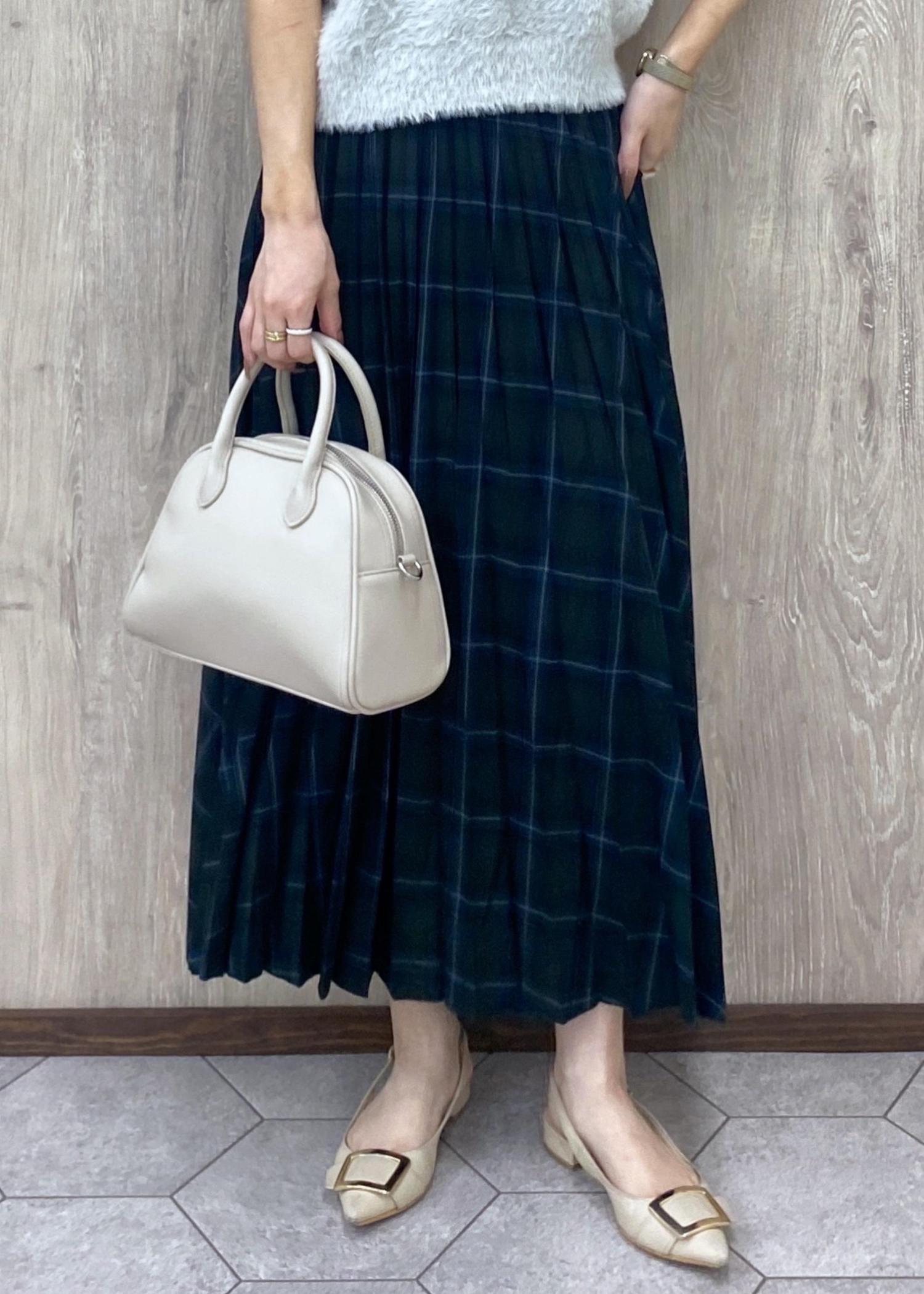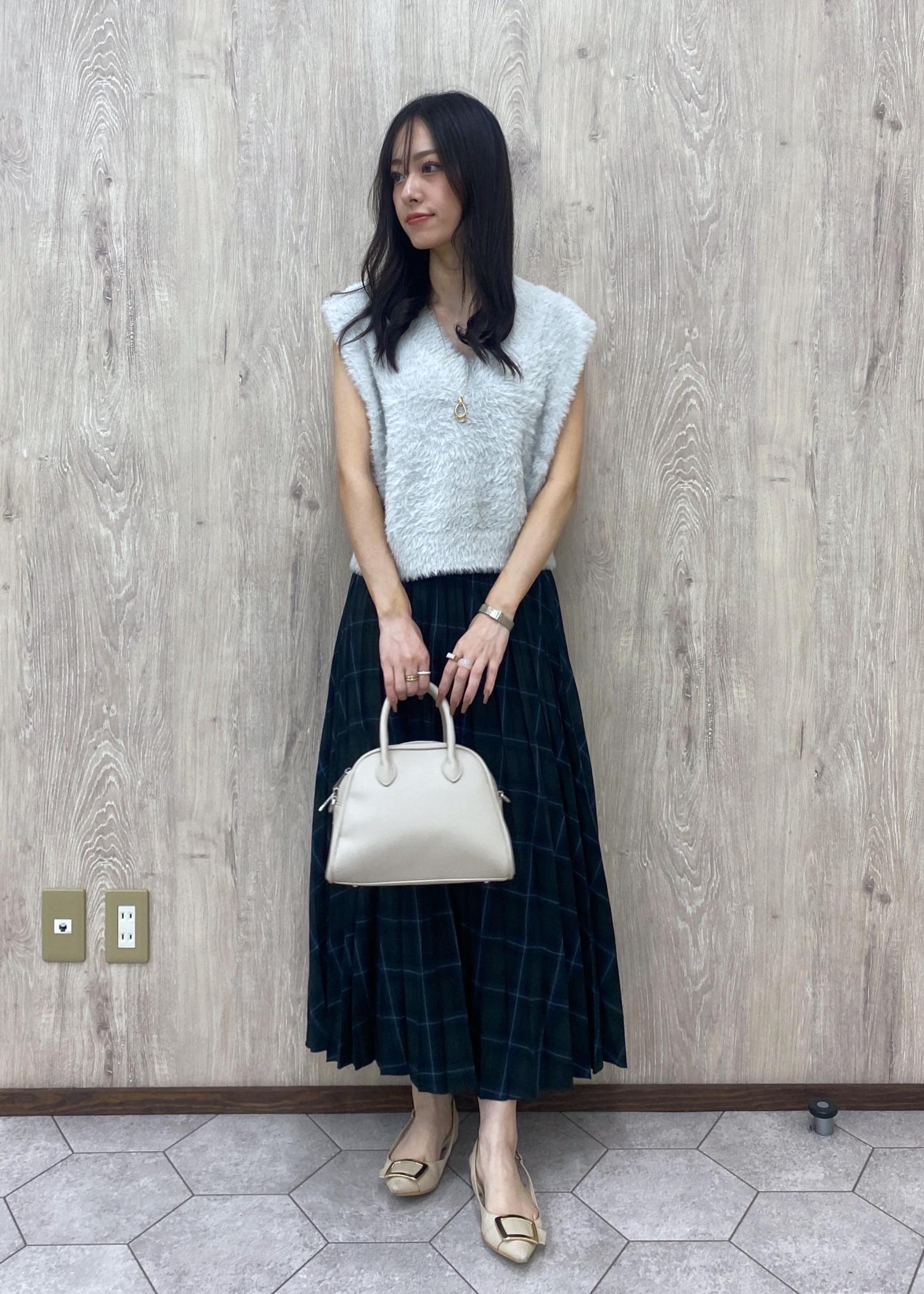 ショートフェザーニット× チェック柄スカートの秋コーデ