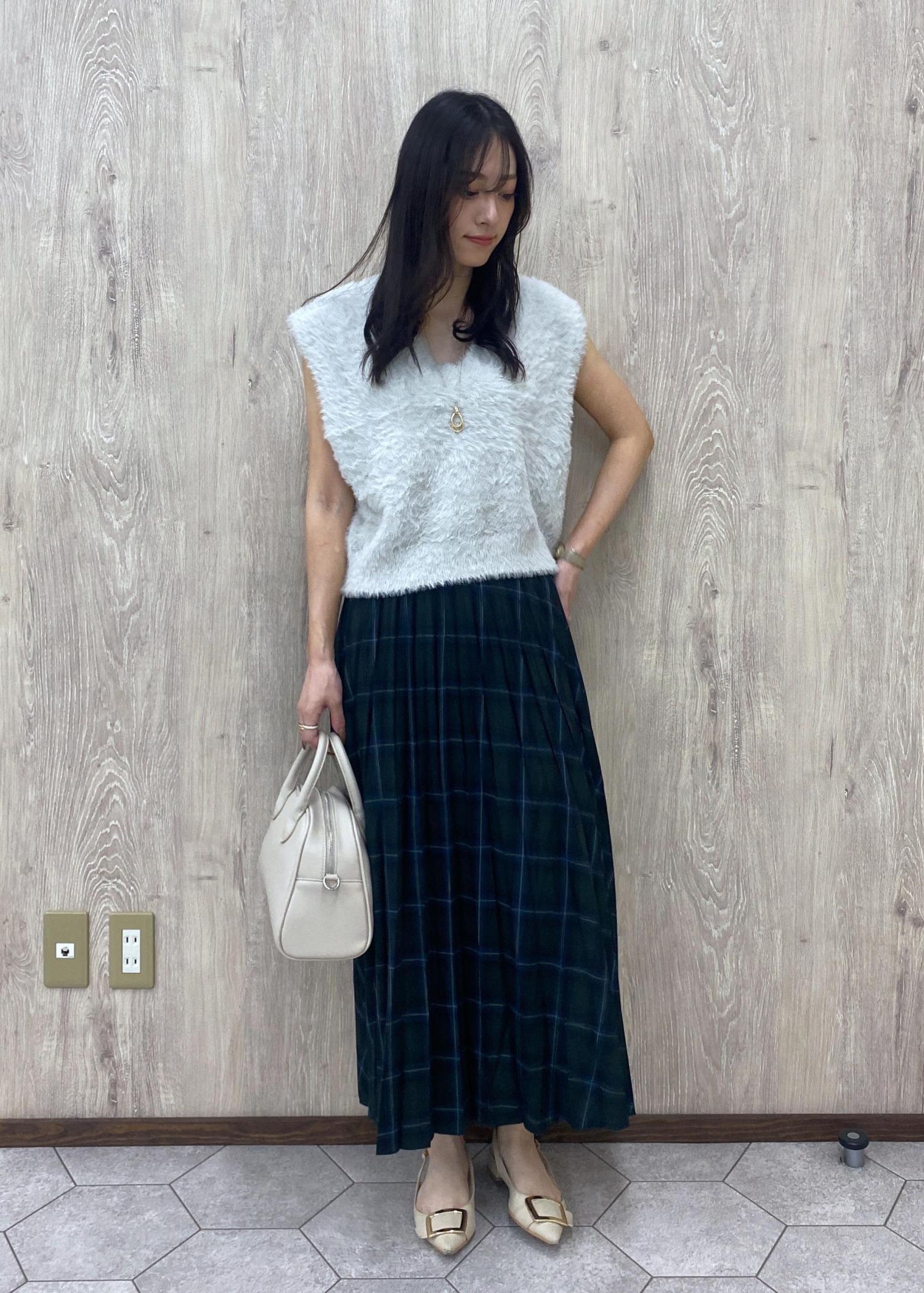 ラメ感のあるショートフェザーニットにチェック柄のスカートを合わせた秋を先取りしたコーディネートです。
