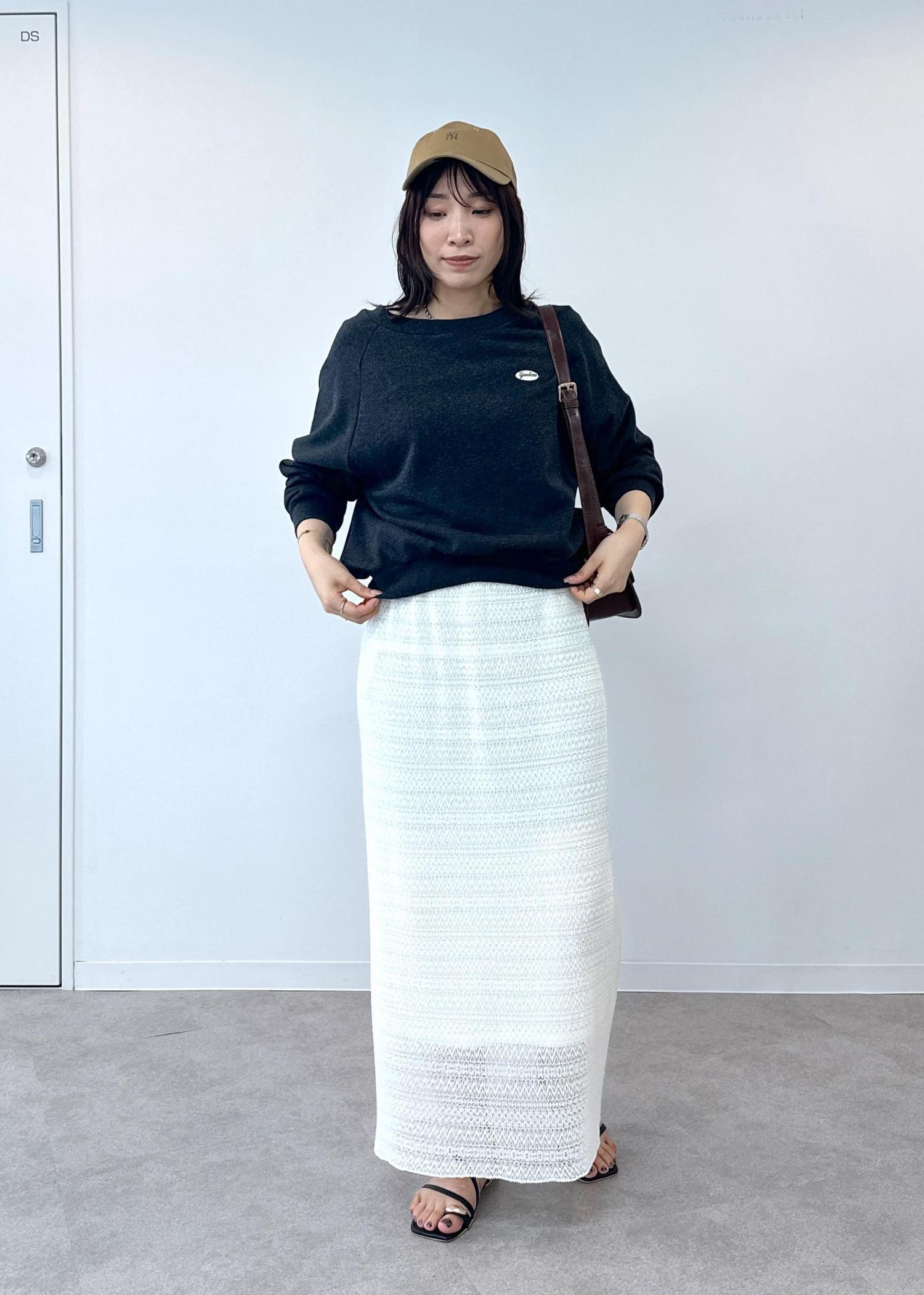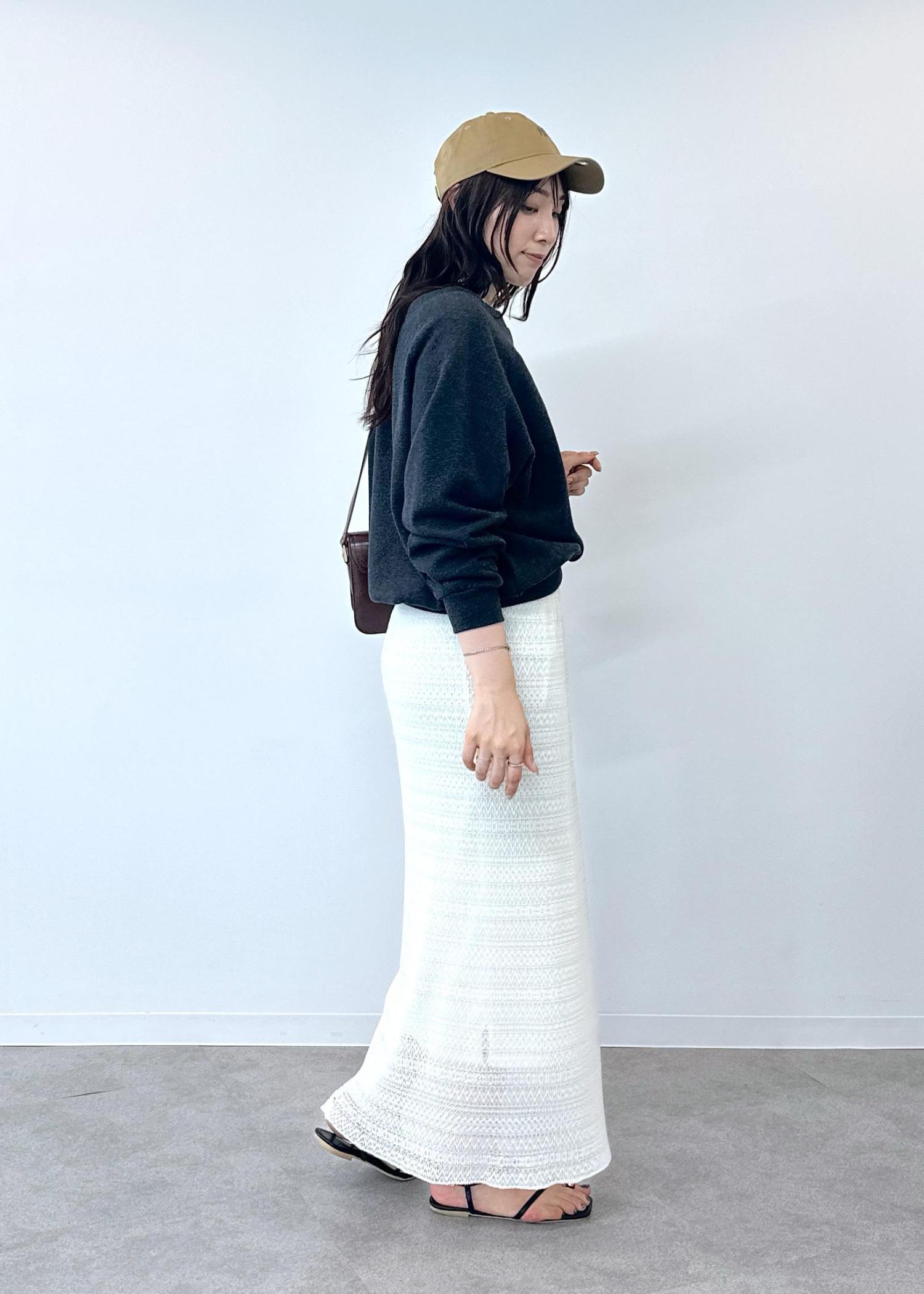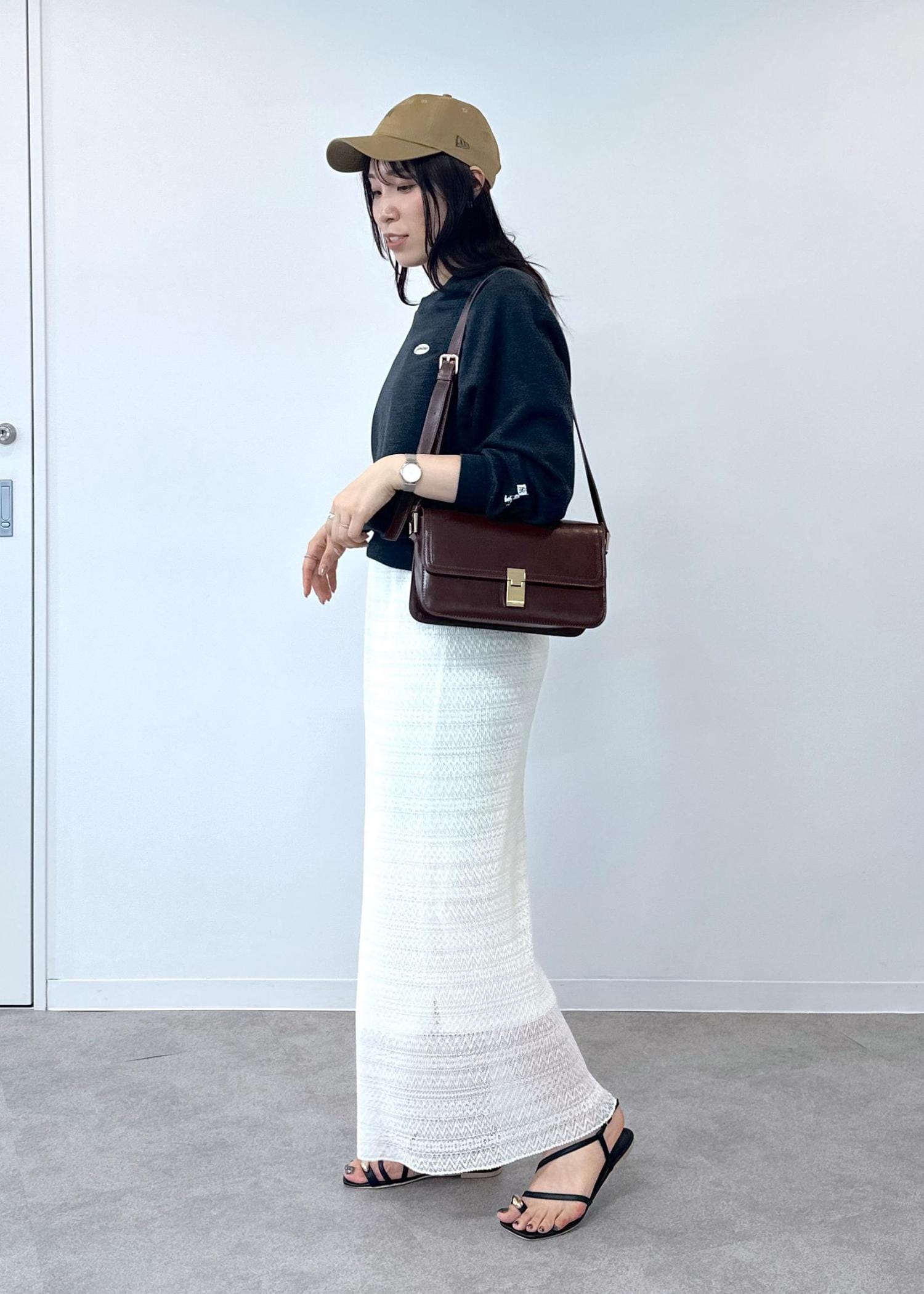 スペシャルコレクションのオフショルダースウェットをスカートで合わせたレディライクなコーデ。