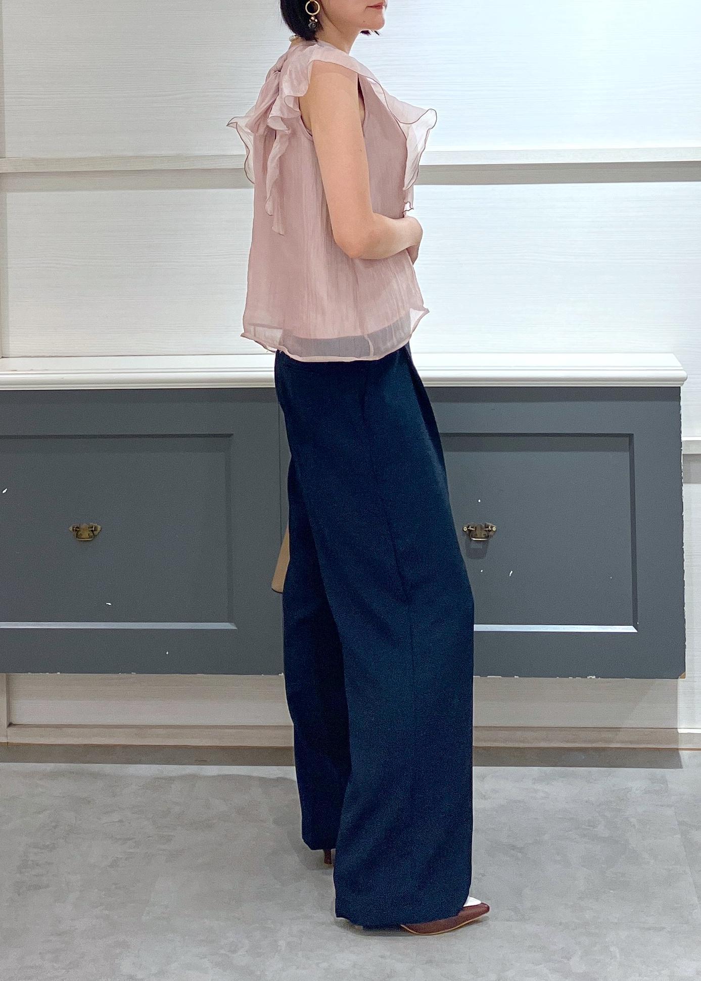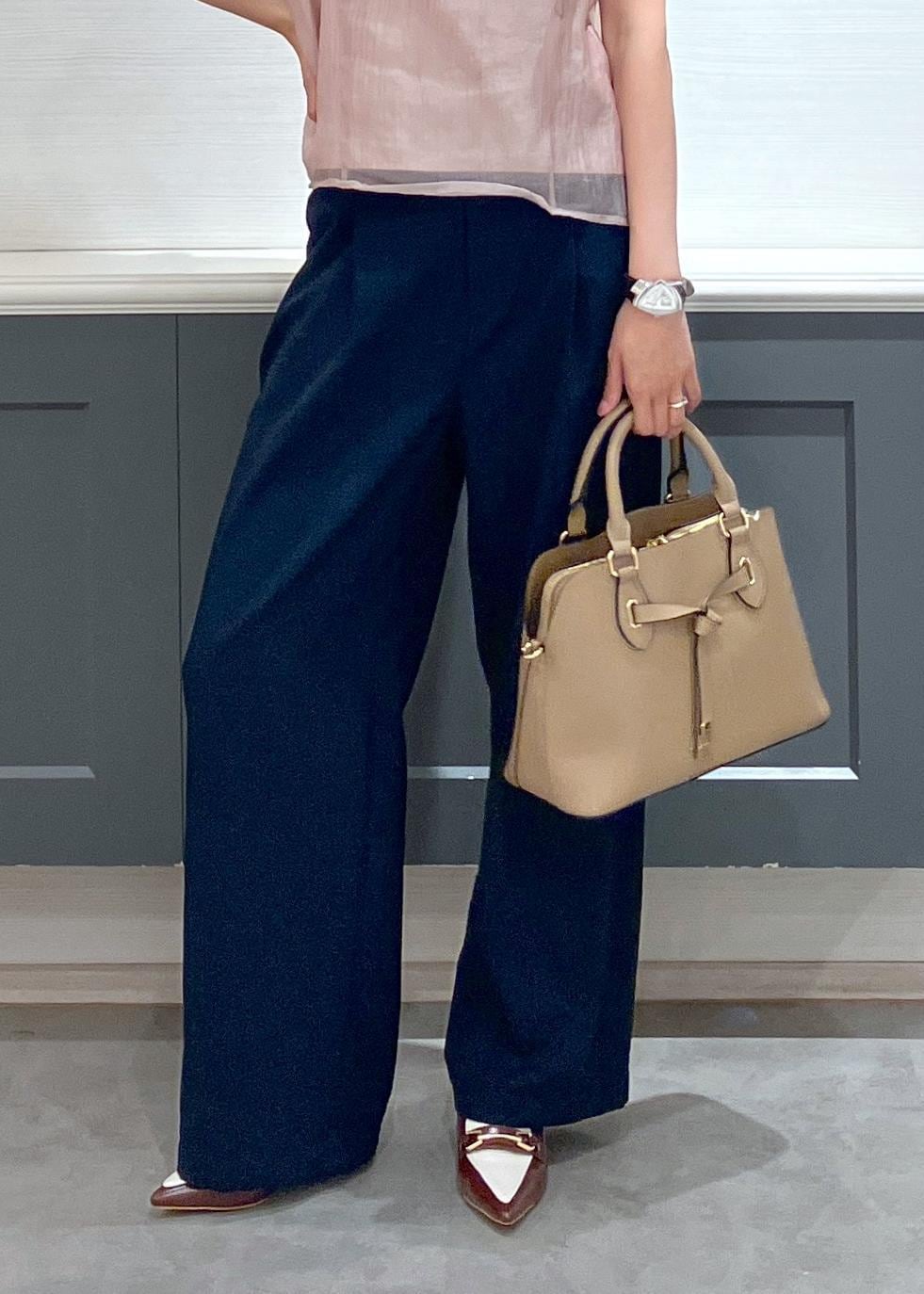ネイビーカラーの美easyのワイドパンツを合わせると可愛くなり過ぎず、