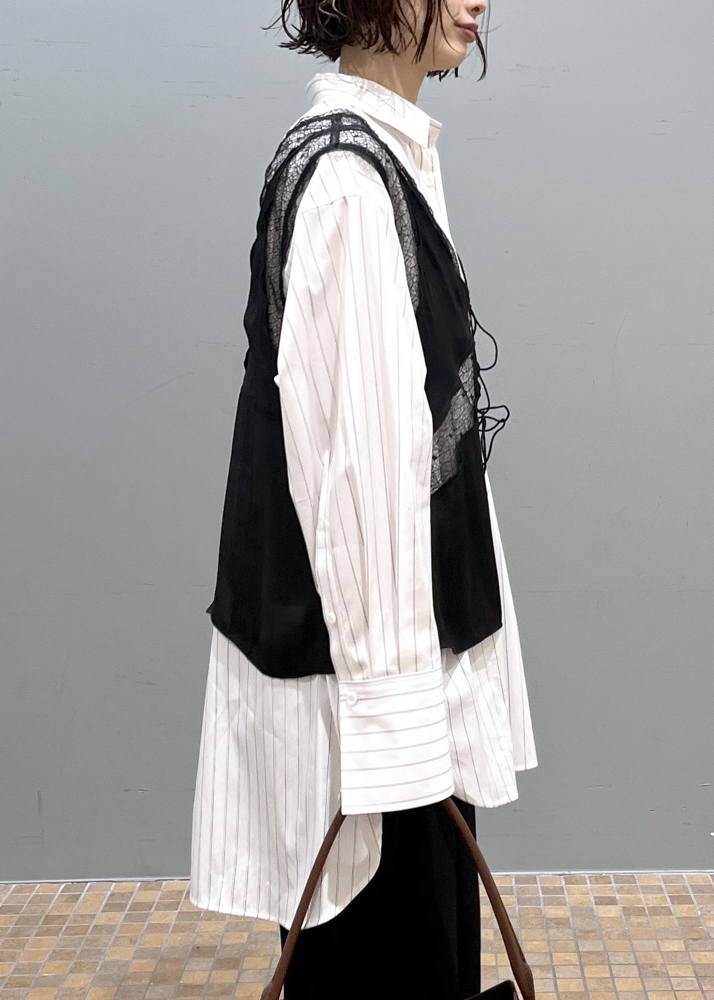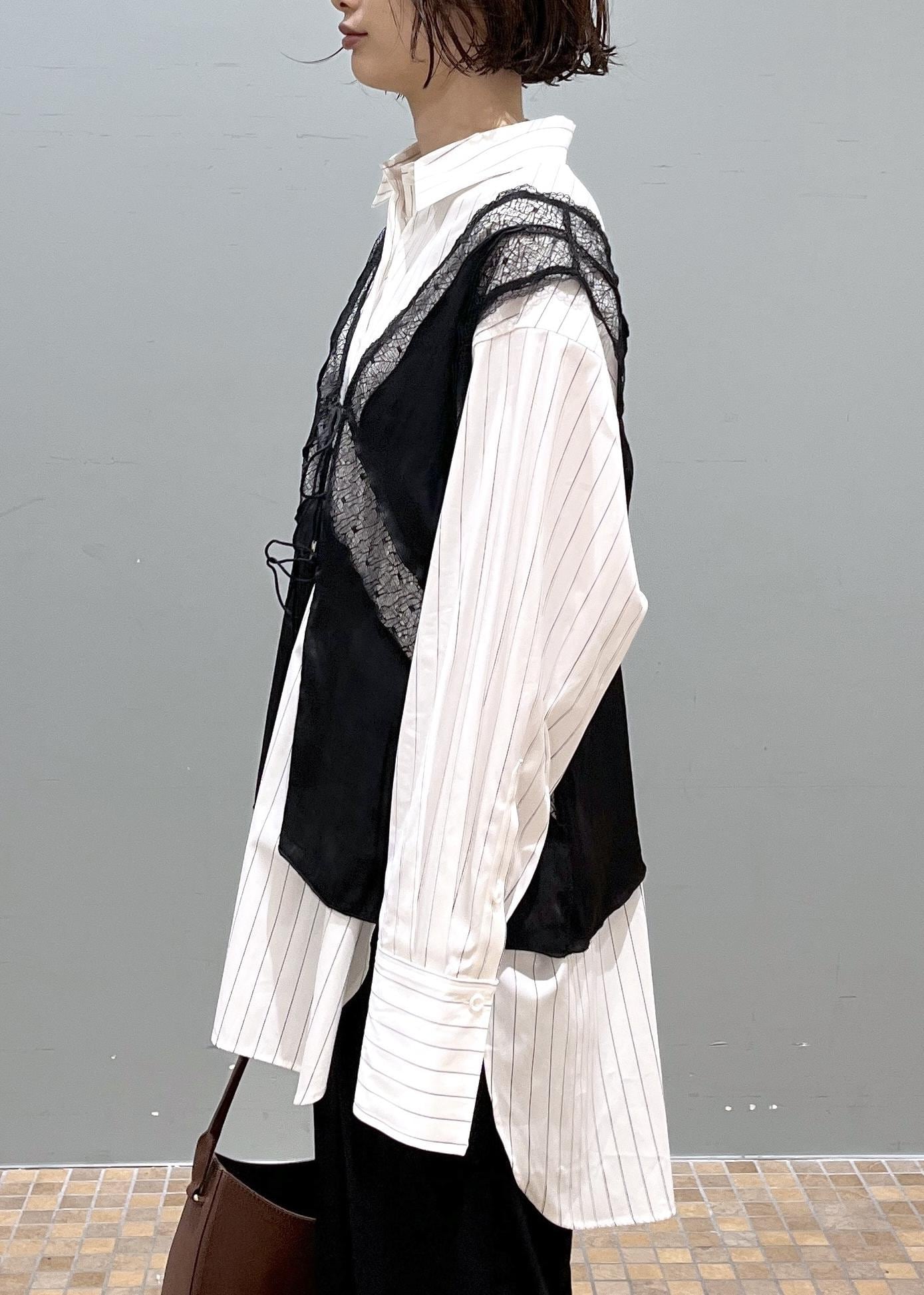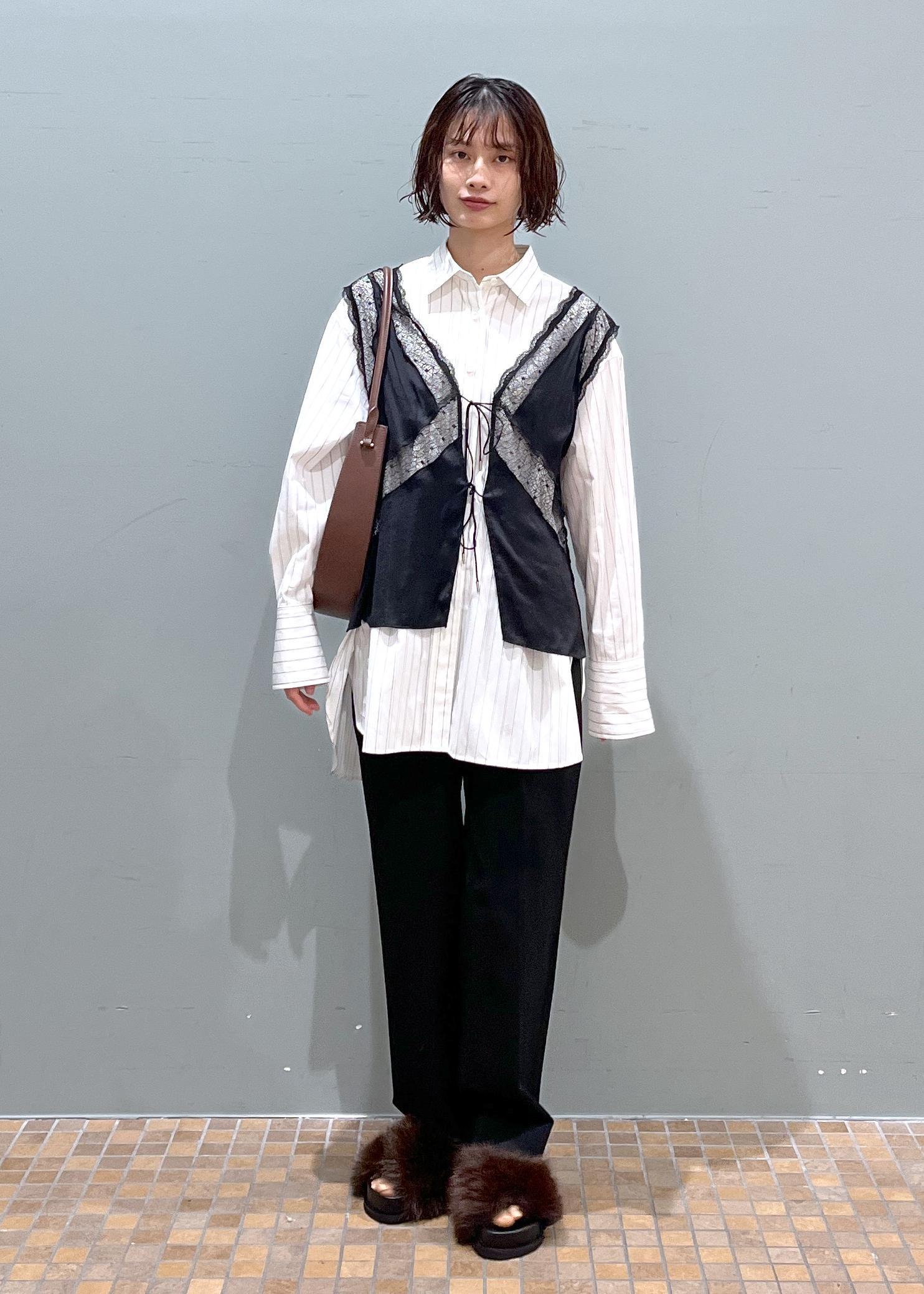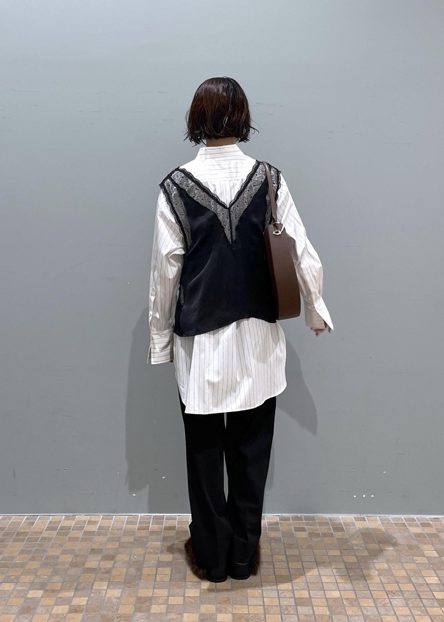 オーバーサイズのシャツだとメンズライクに寄ってしまうことがありますが、レイヤードなどをしたりサテン生地やレース生地のものと合わせると一気にフェミニンに着こなせるのでおすすめです!♡