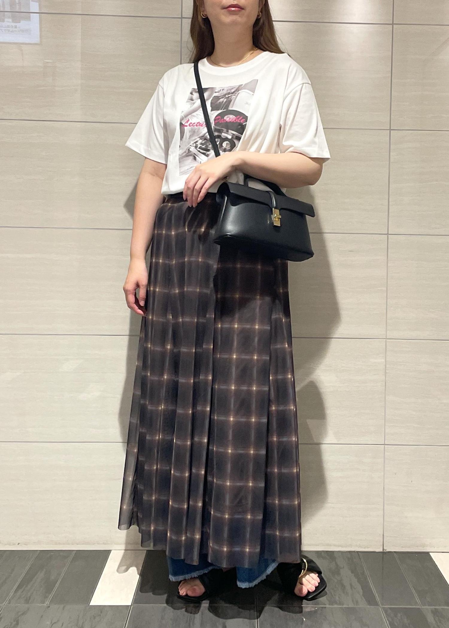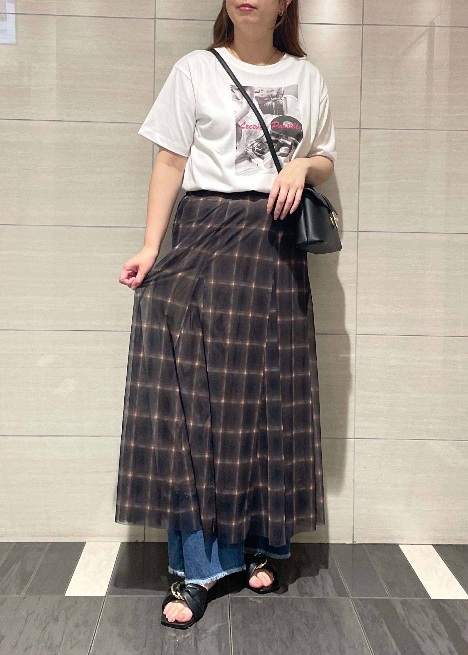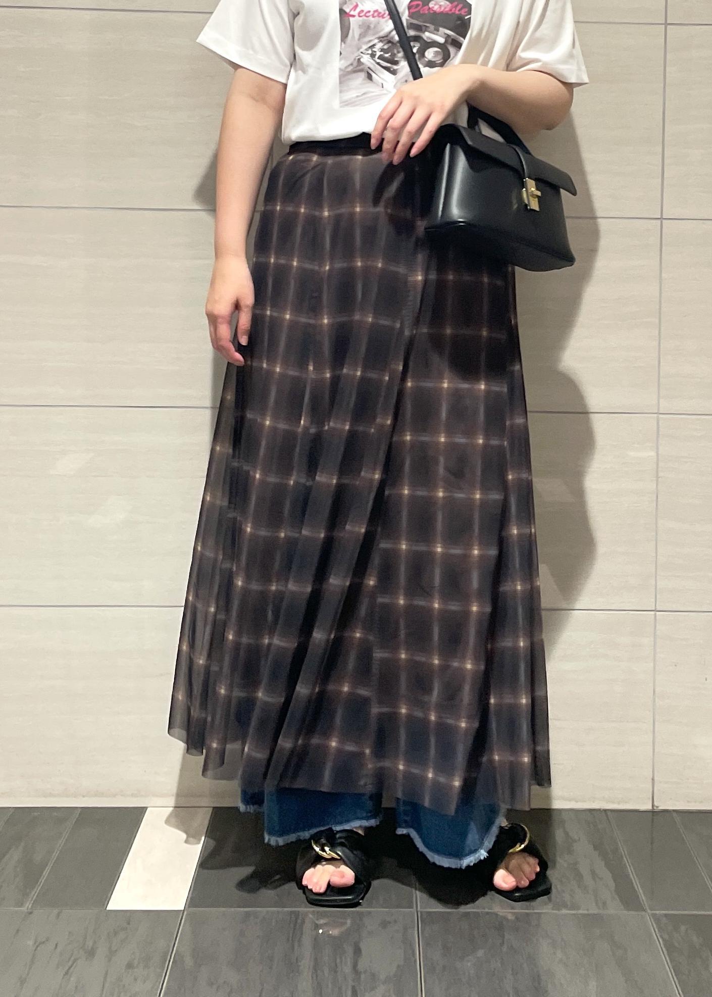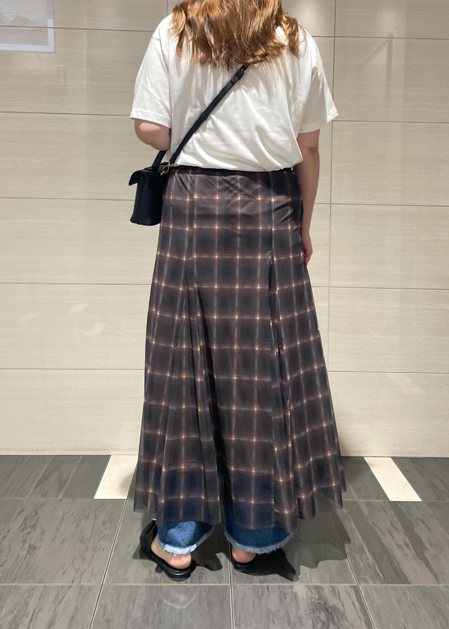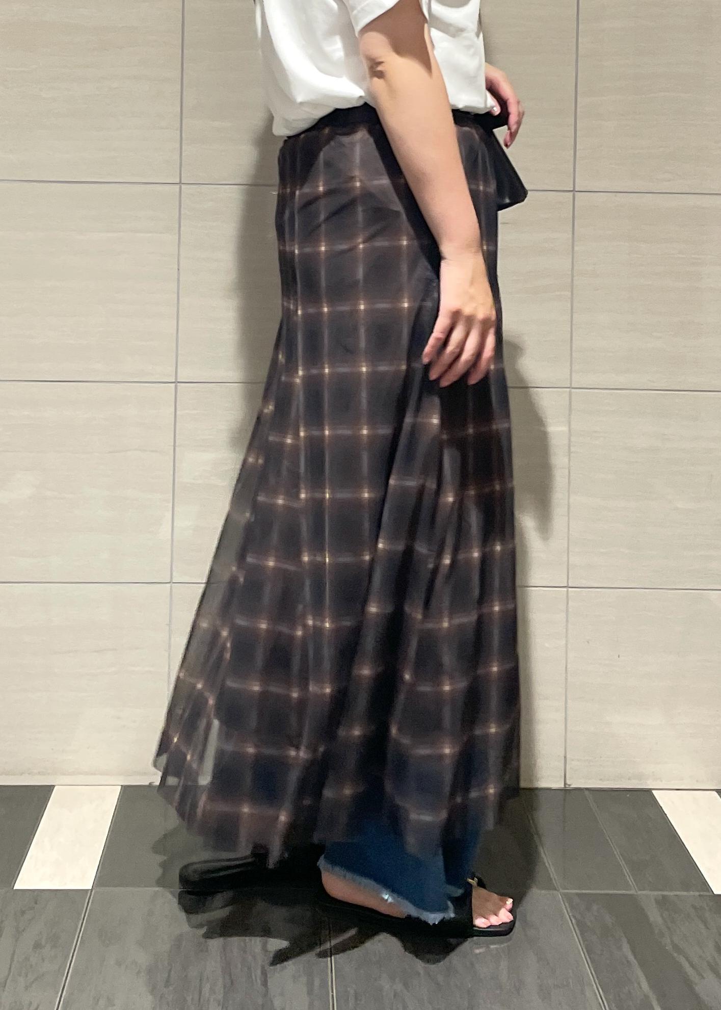VIS【洗える】チュールプリントチェックスカートダークブラウン系 / F¥4,612レビュー後ろがゴムになっており柔らかいゴムなので締め付け感がなく楽に履いていただけます。