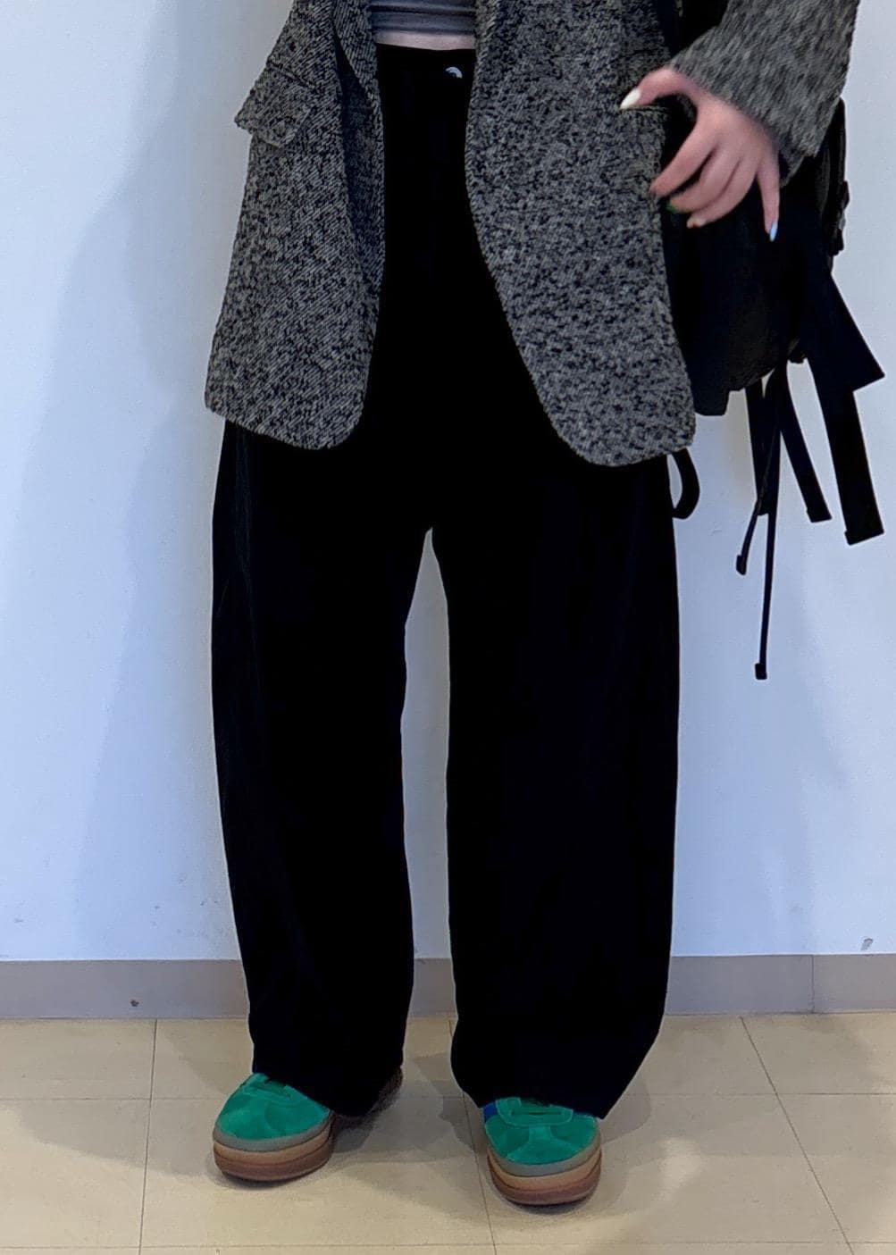 ADAM ET ROPÉ FEMME【新色追加】ガーメントダイコーデュロイパンツブラック / 36¥19,800レビュー160cm ウエストもゆったりなサイズ感ですが、紐で絞ることができます。着丈も高めの位置で履けば擦らない丈感です。