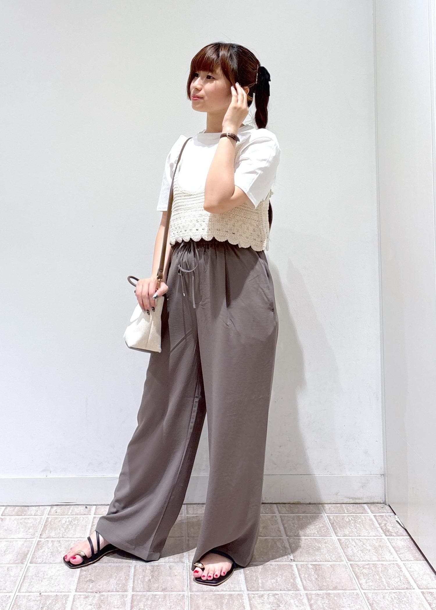 ROPÉ PICNICジョガーイージーワイドパンツ/セットアップ対応カーキ / 36¥5,489レビュー柔らかい素材感になっていて動いたりする時にとても最適なアイテムです。足のラインが拾いにくいアイテムなので太ももなど気になる方におすすめです。150cmの私で、ヒールのない靴ですと地面についてしまう長さですので少し厚みのある靴と合わせていただくと良いです。