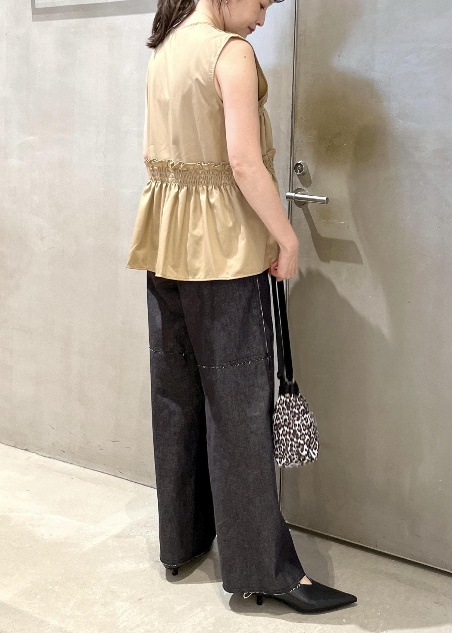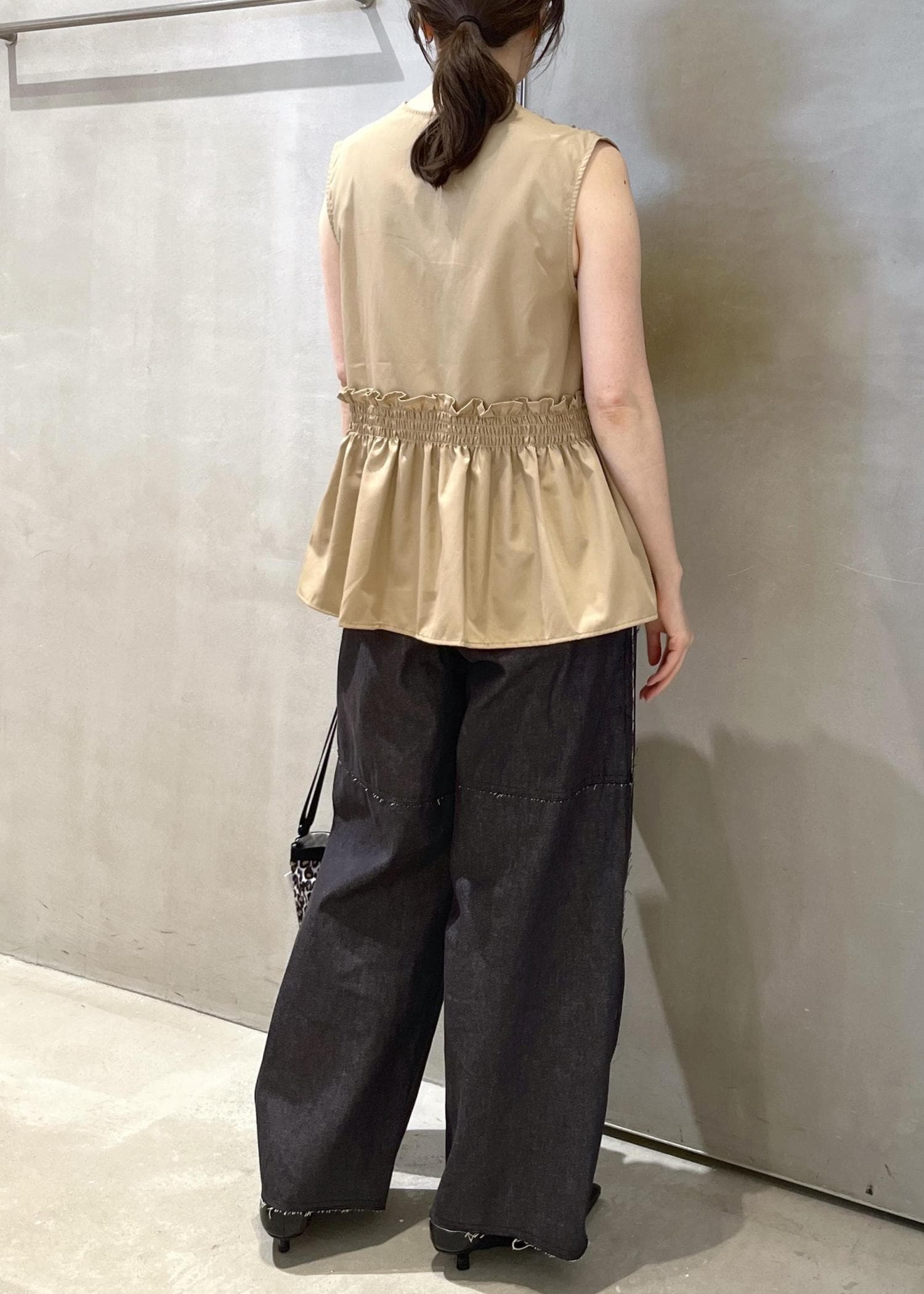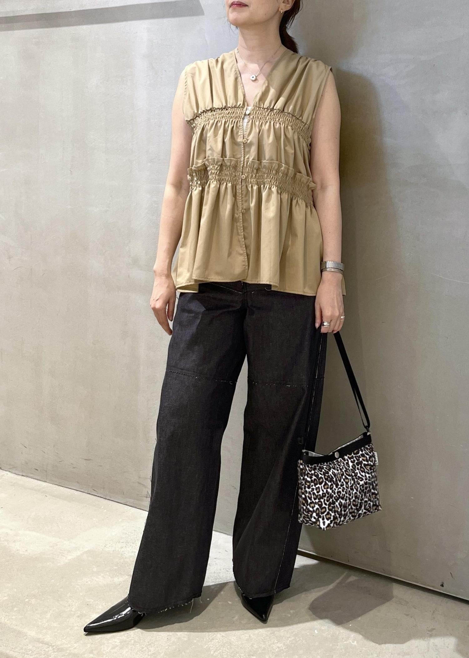 フリルギャザーシャツを使ったコーディネート。