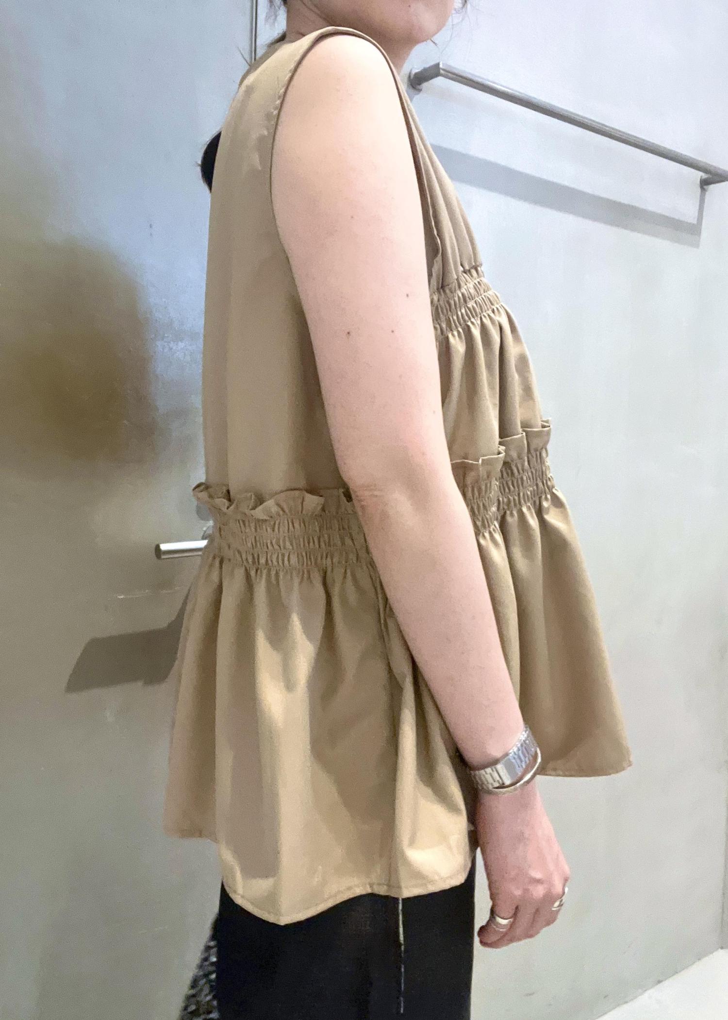脇は大きく開きますので、一枚でというよりはキャミやTシャツの上にジレ感覚で羽織っていただくアイテムです。