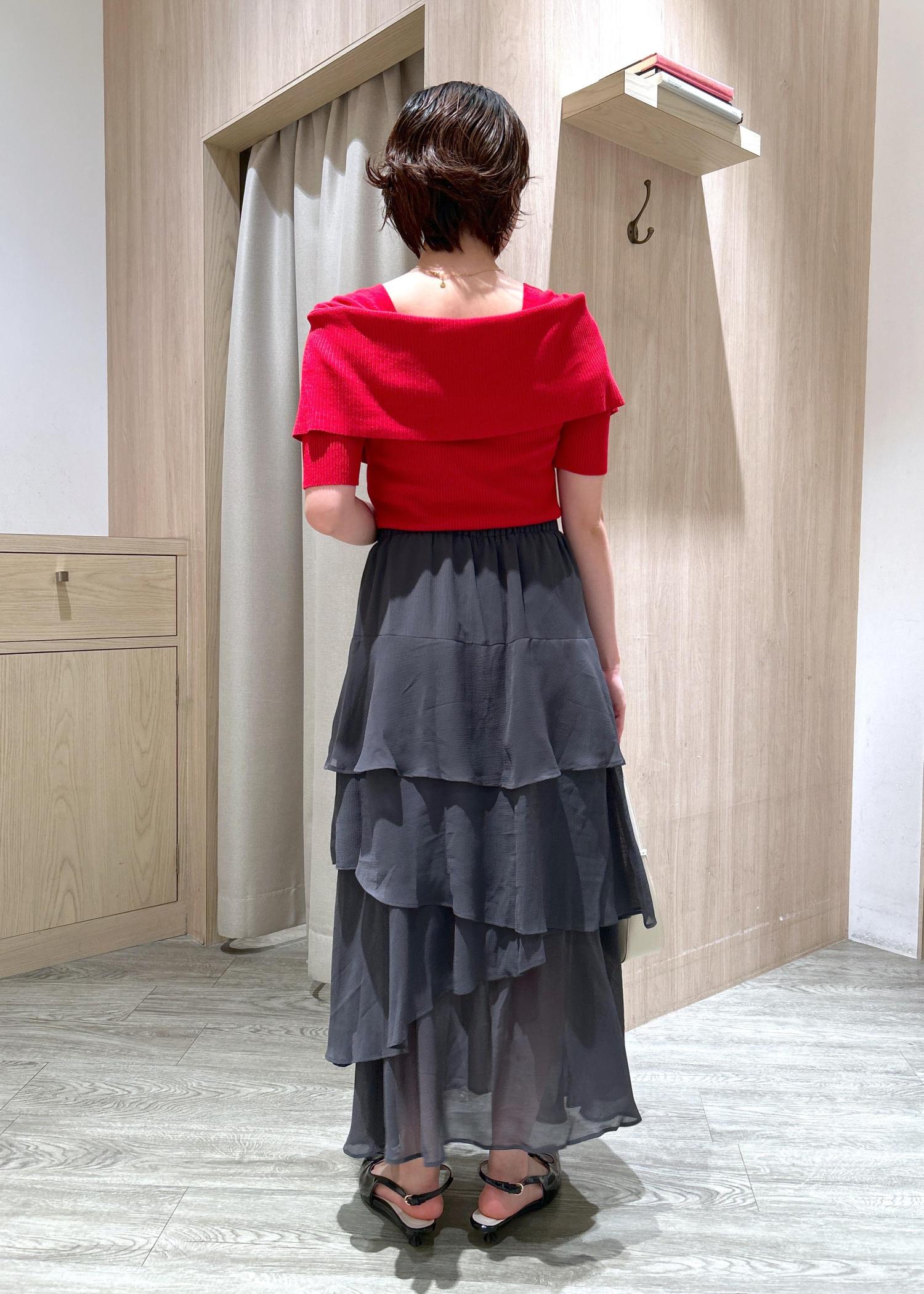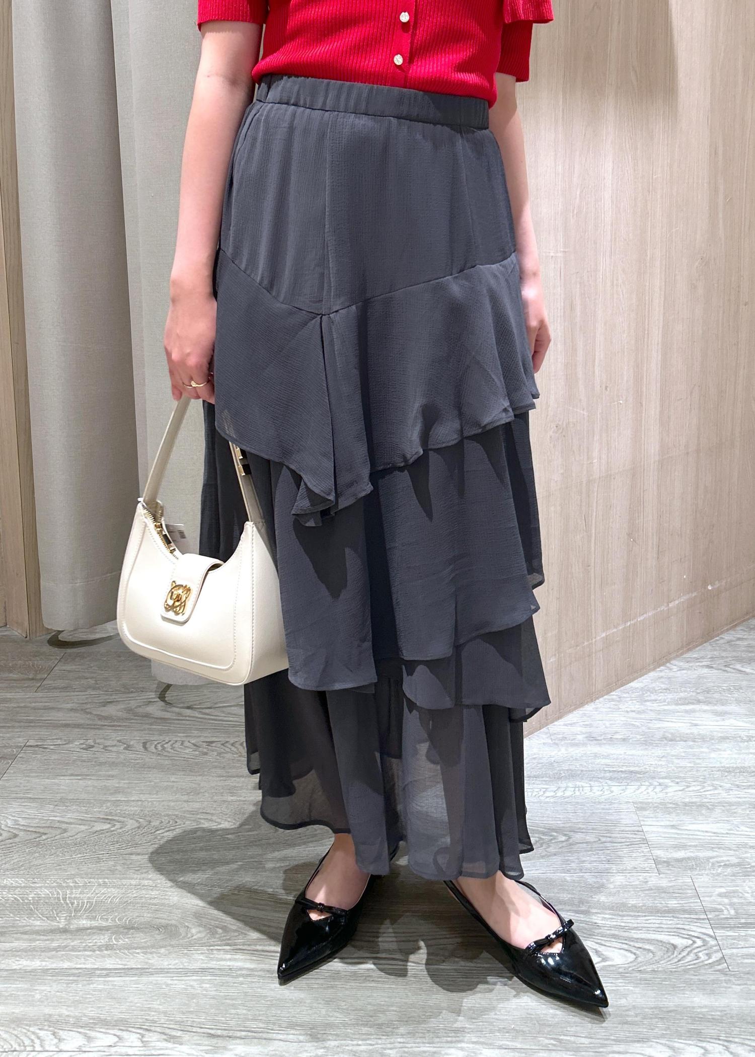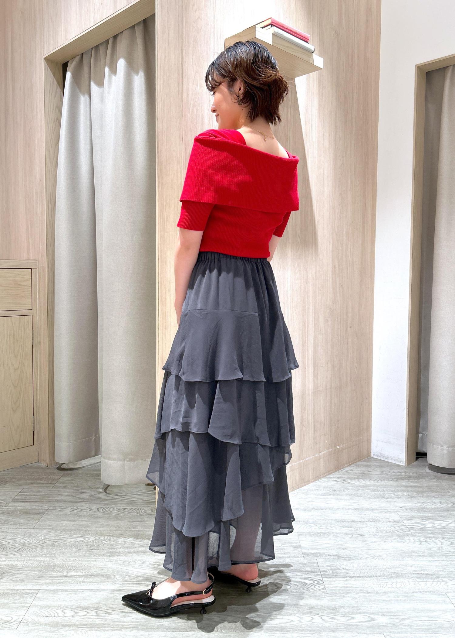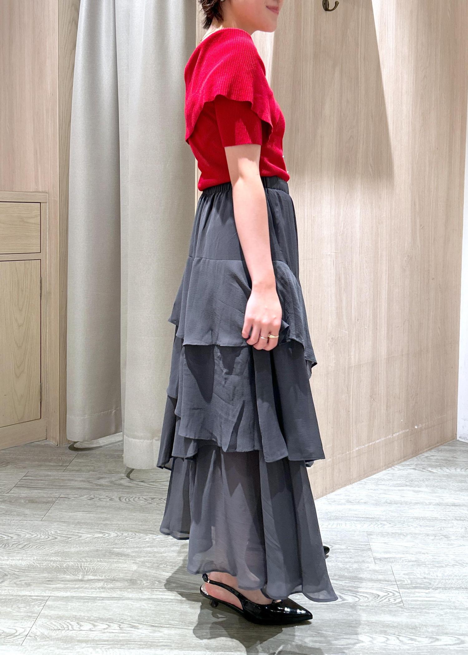 グレーのスカートを合わせることで強すぎなく柔らかい印象に◎