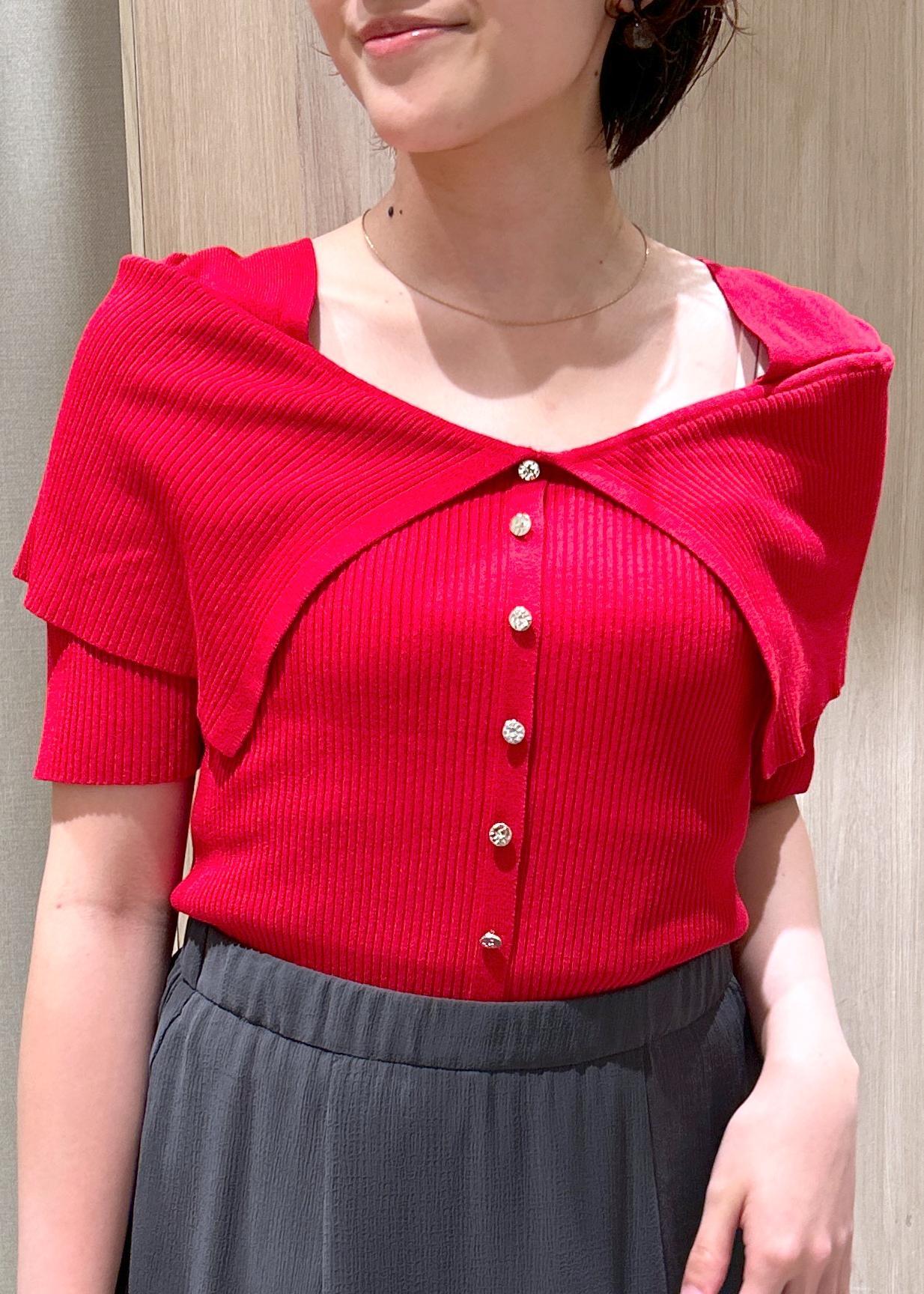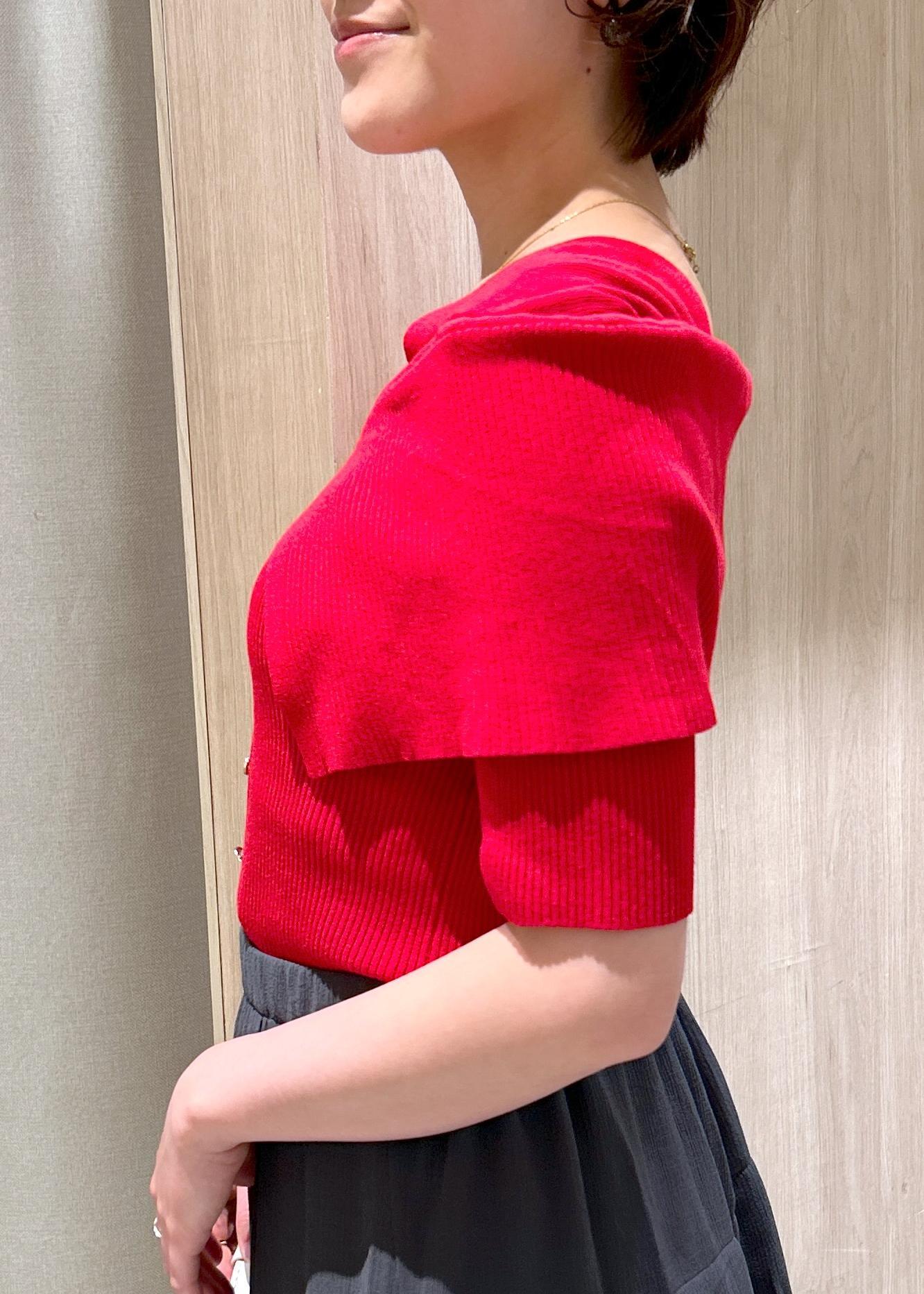 パキッとしたレッドのトップスを主役にしたコーデです!