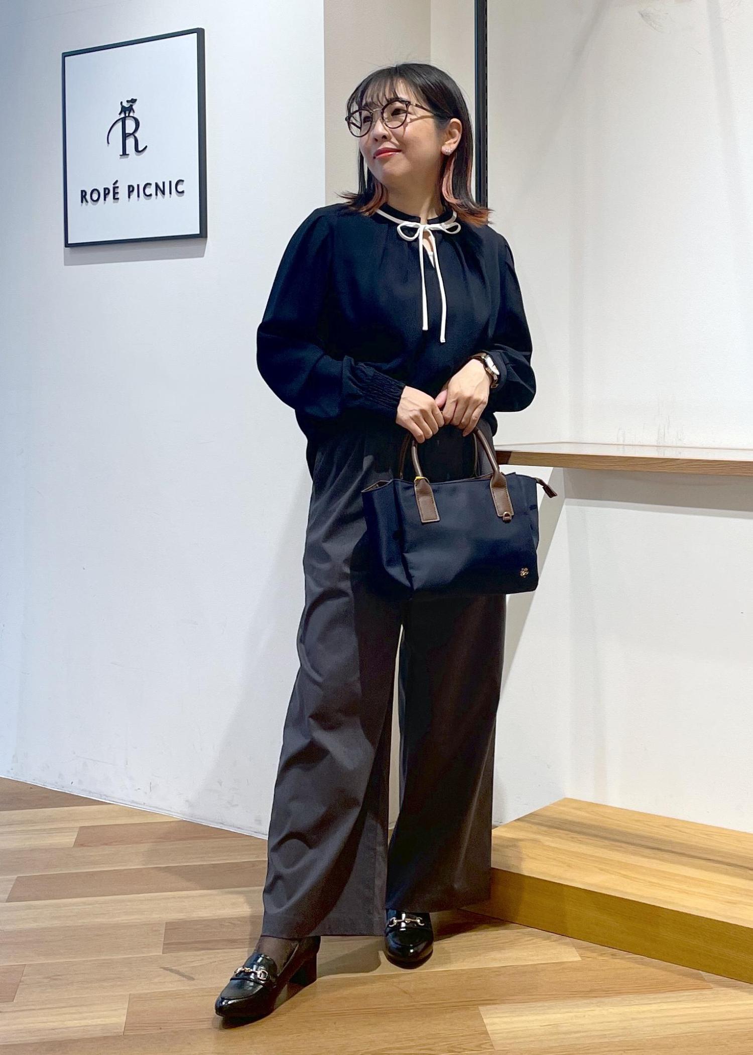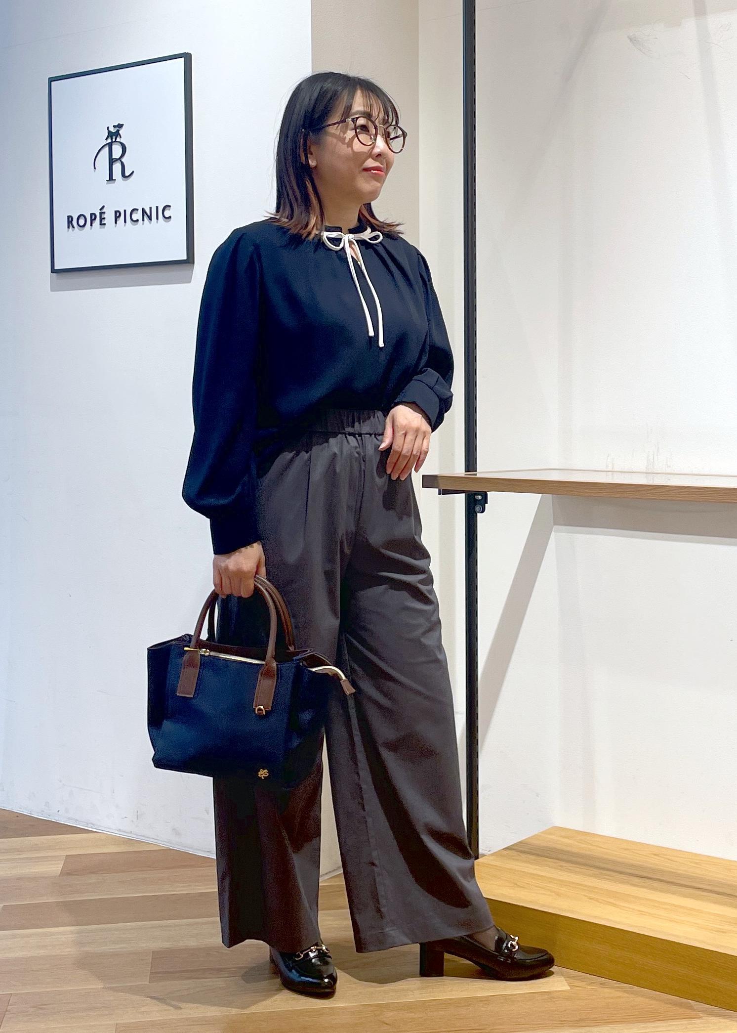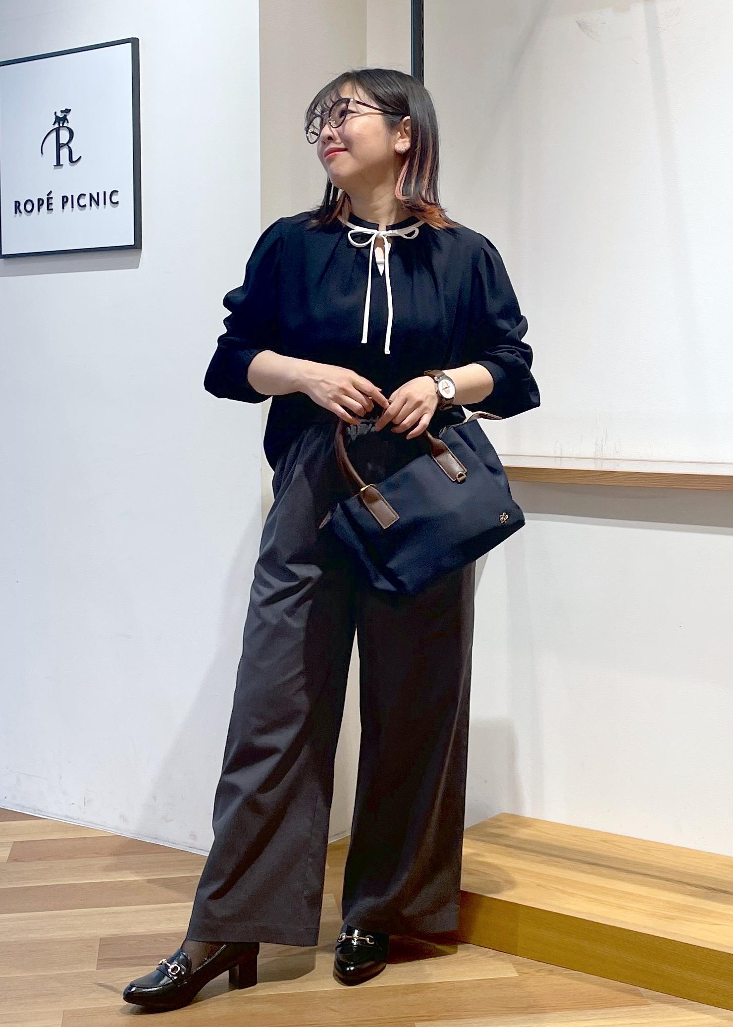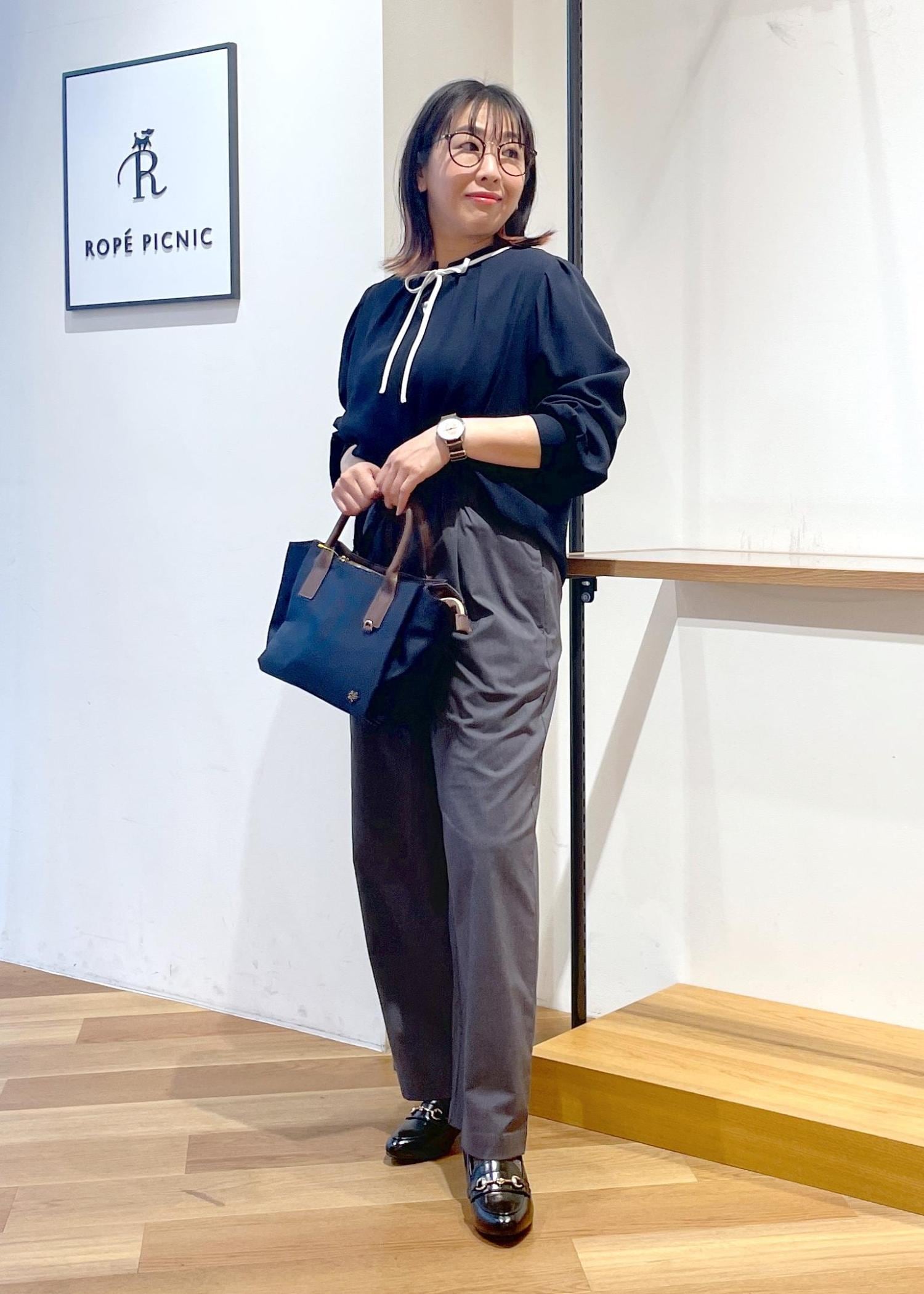 ROPÉ PICNIC【前後2WAY】【WEB限定カラー】配色リボンブラウス/通勤対応ネイビー系 / M¥3,993レビュー前後2WAYブラウスです。身幅、お袖幅はゆったりしており、ふんわりと着用できました。お袖にはゴムが入っていてシャーリングになってますので袖捲りもできちゃいます○