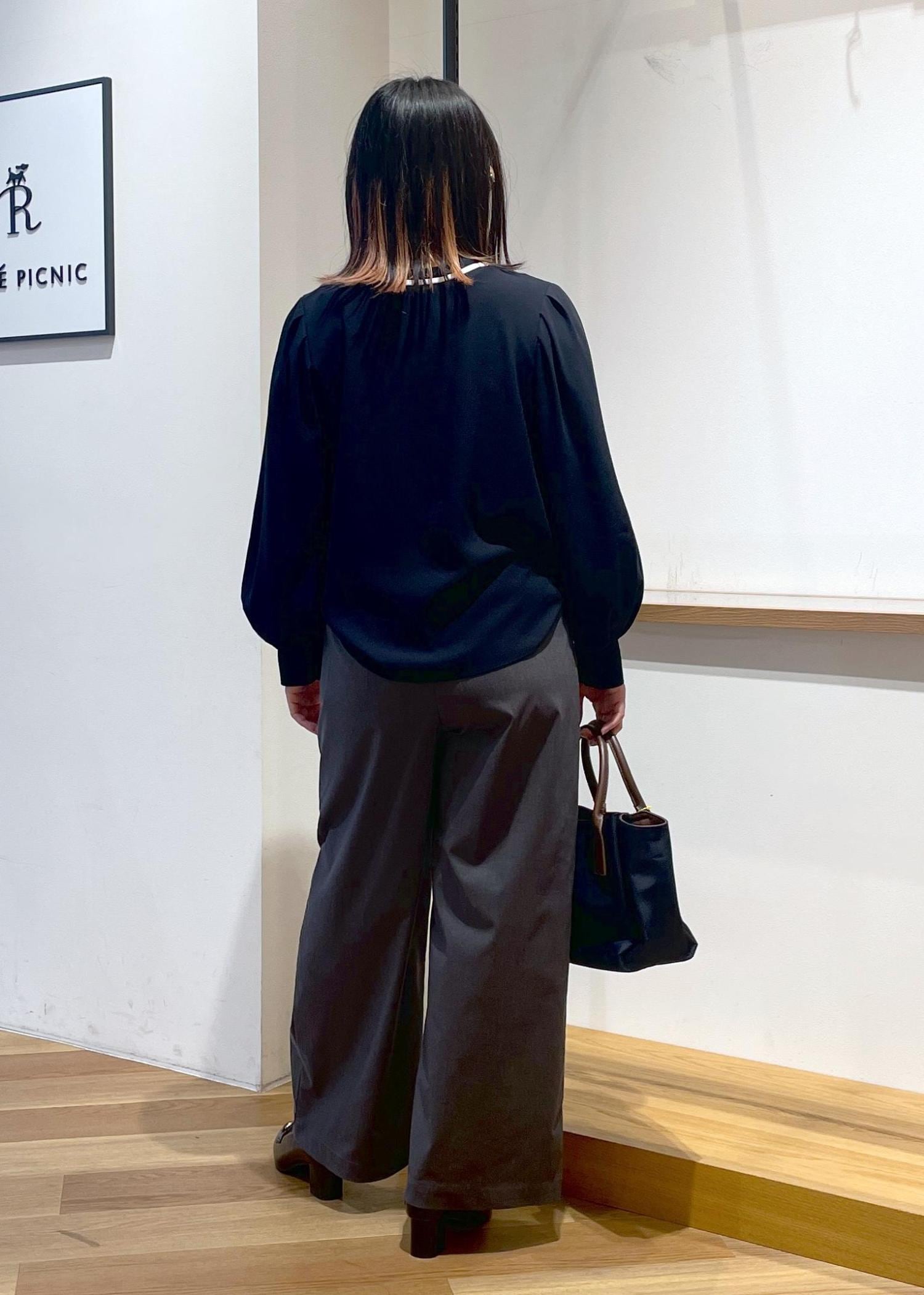 前後2WAYブラウスです。身幅、お袖幅はゆったりしており、ふんわりと着用できました。お袖にはゴムが入っていてシャーリングになってますので袖捲りもできちゃいます○