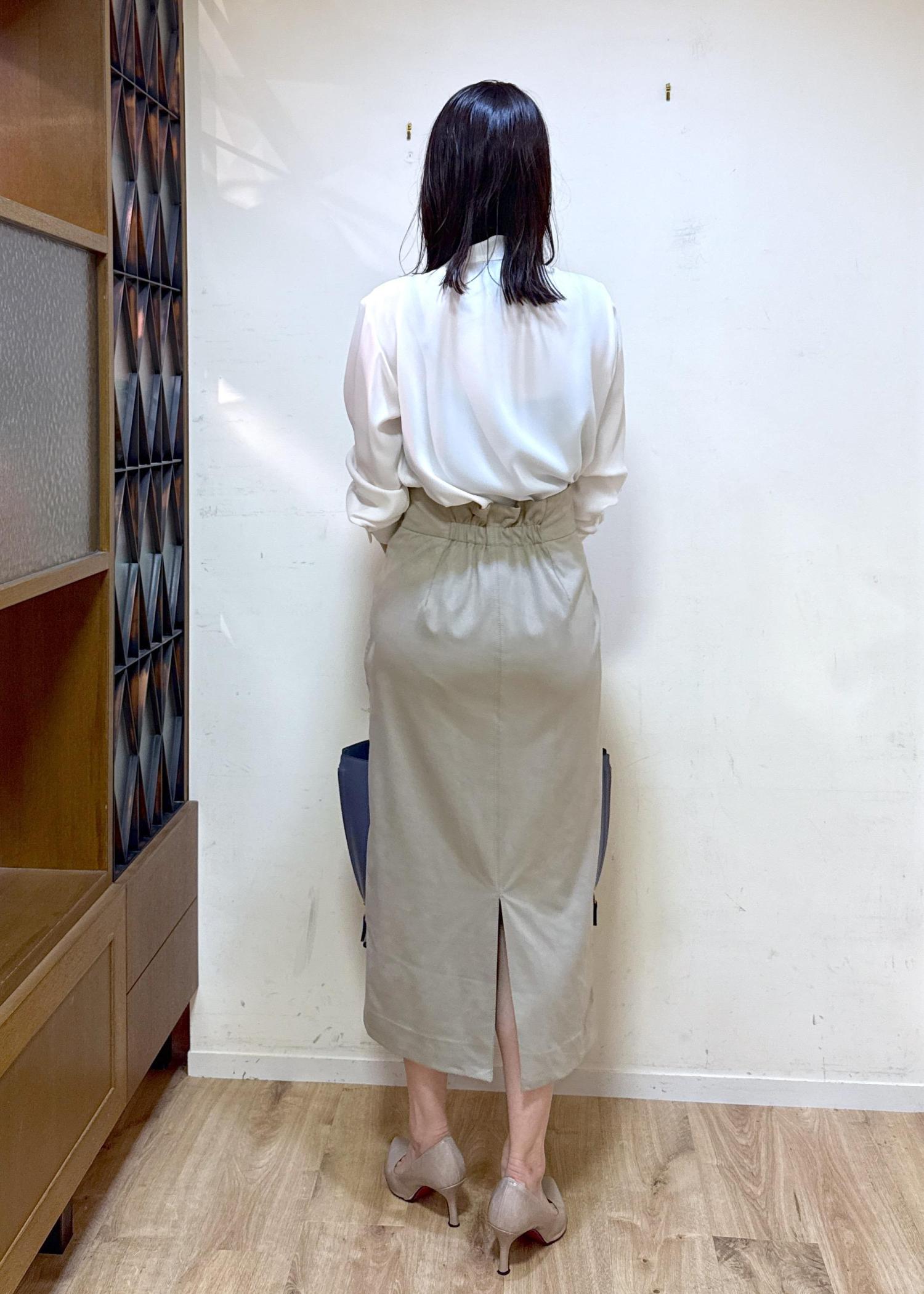 ウエストの後ろはゴムになっており、ポリエステルスエード素材。ストレッチもあるので履き心地は良く、ヒップのラインも拾いにくいのでおすすめです。 -