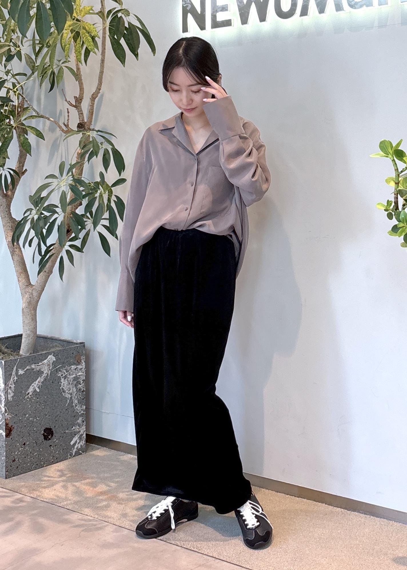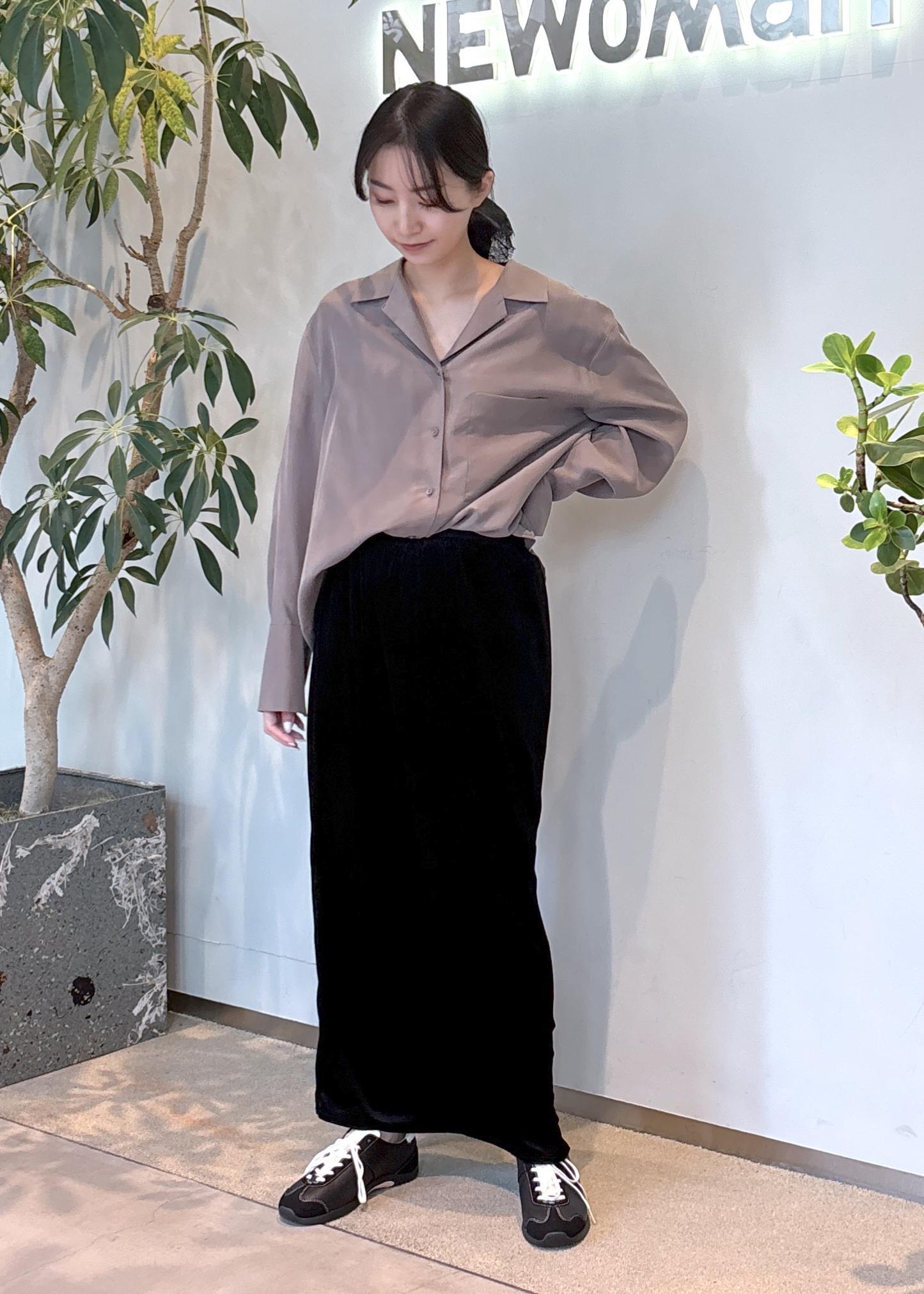 落ち感のあるシャツとストレートシルエットのスカートを合わせた、抜け感のある大人カジュアルコーデにしました。リラックス感のあるシャツをインすることで、全体をすっきりまとめ、縦のラインを強調させました。足元はスニーカーを合わせてほどよくカジュアルダウンしました。