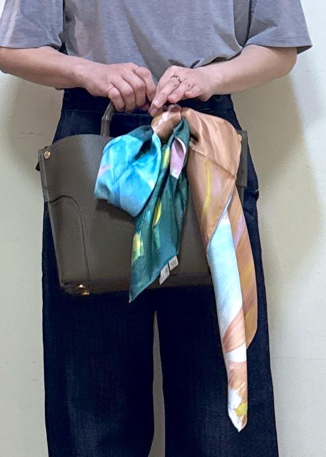 バッグにはイラストレーター佐伯ゆう子さんコラボのスカーフをポイントに。