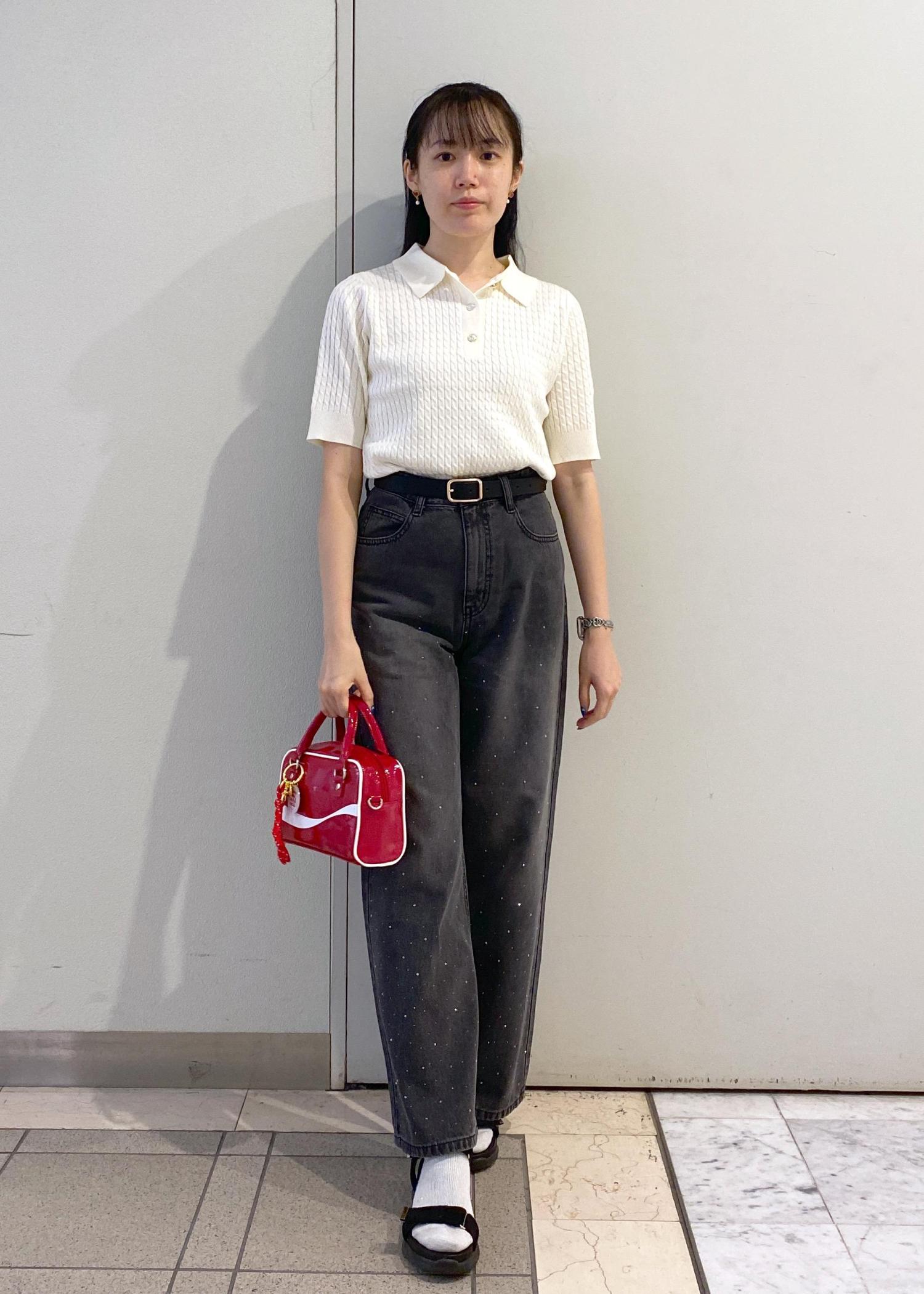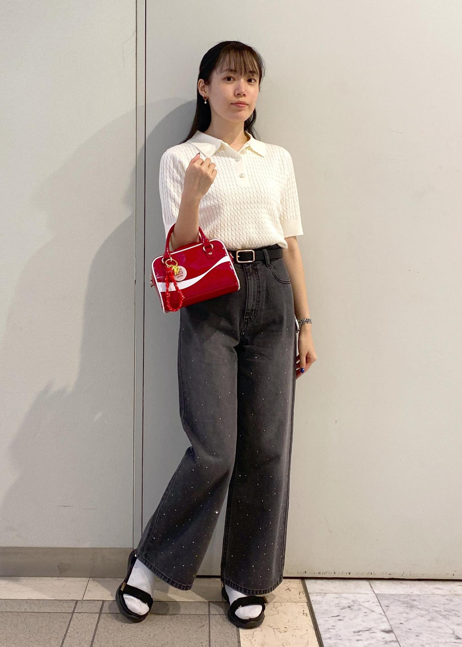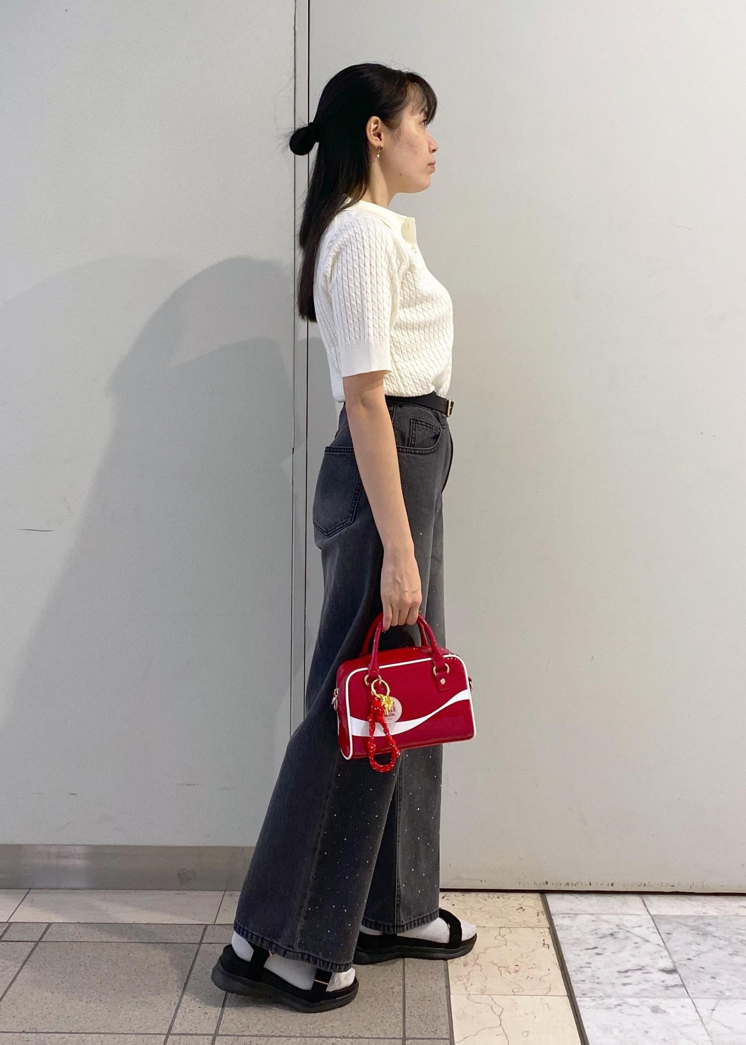 パンツがワイドめのデザインなのでトップスはウエストインですっきりとした着こなしに。