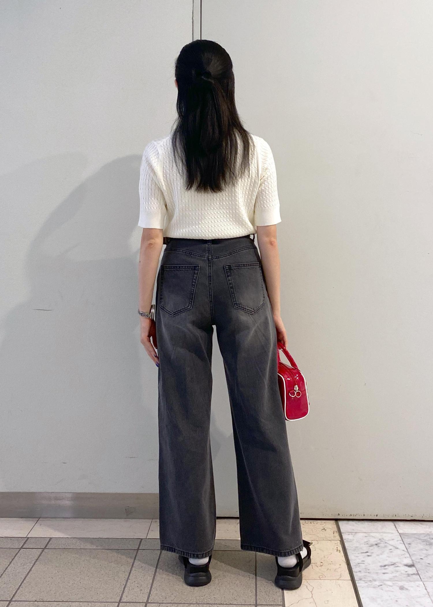 ワイドめのシルエットなので、トップスはスッキリまとめるのがおすすめです。