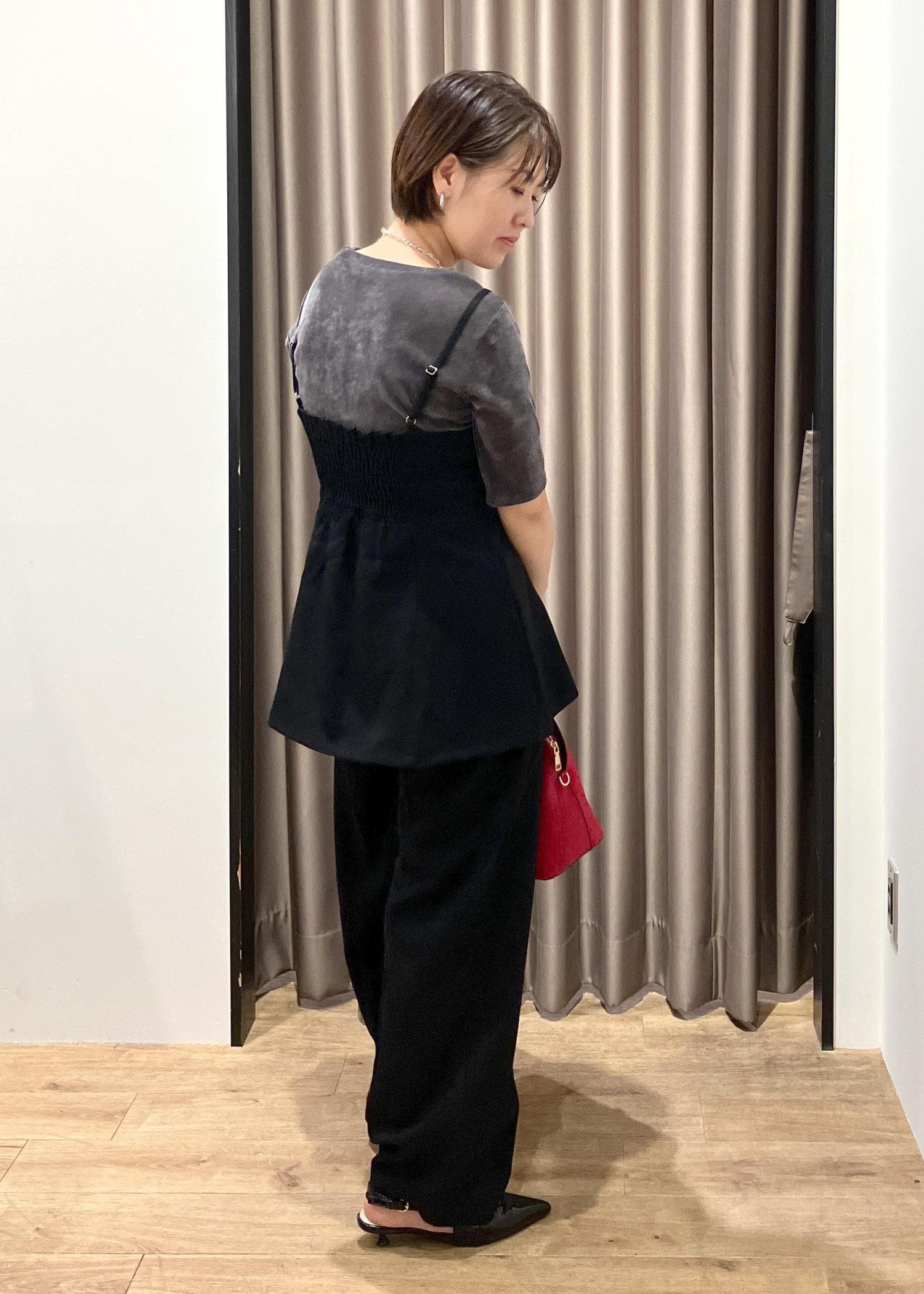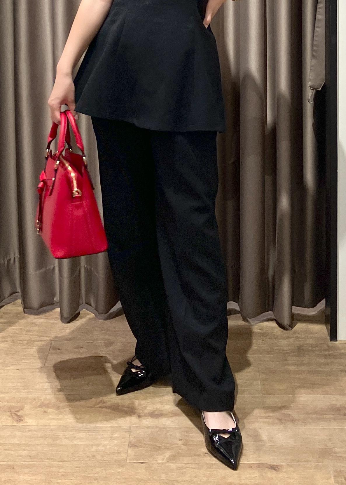 モノトーンでまとめたコーディネートはベロア素材のカットソーを取り入れ素材に変化を出しました!赤のバッグが差し色でポイントに!大人ぽくシックな印象をイメージしました!お出かけから食事、少し特別なシーンにもおすすめです!