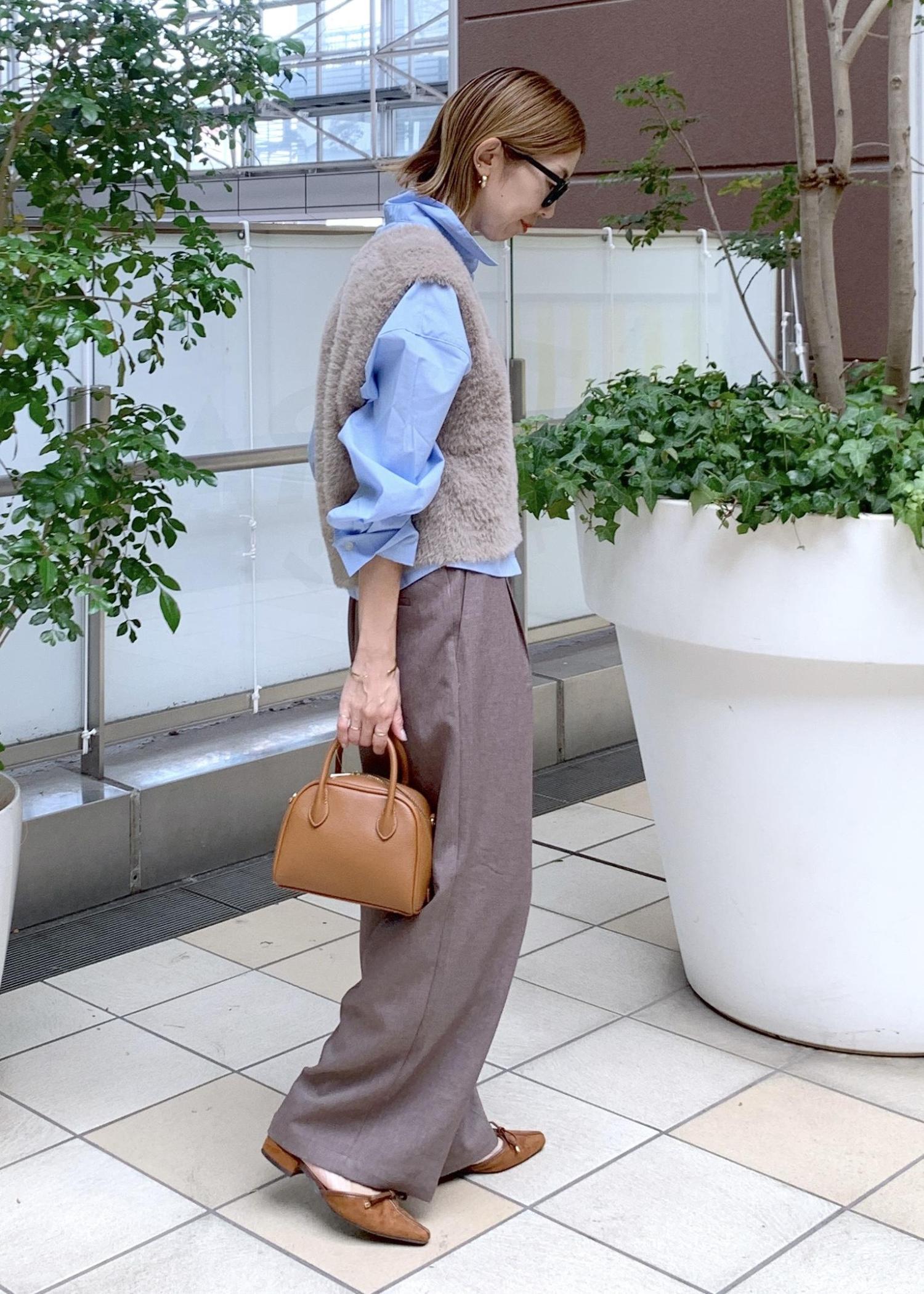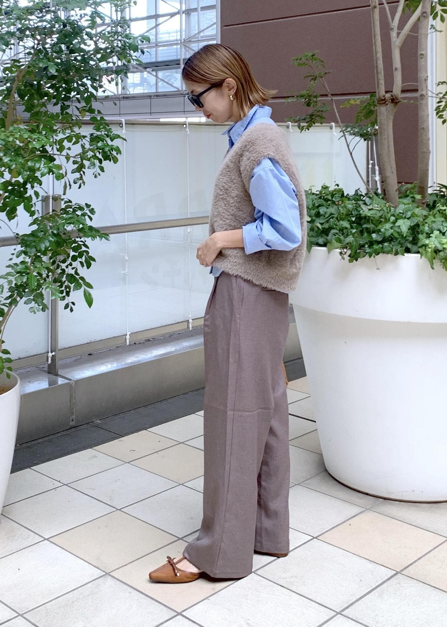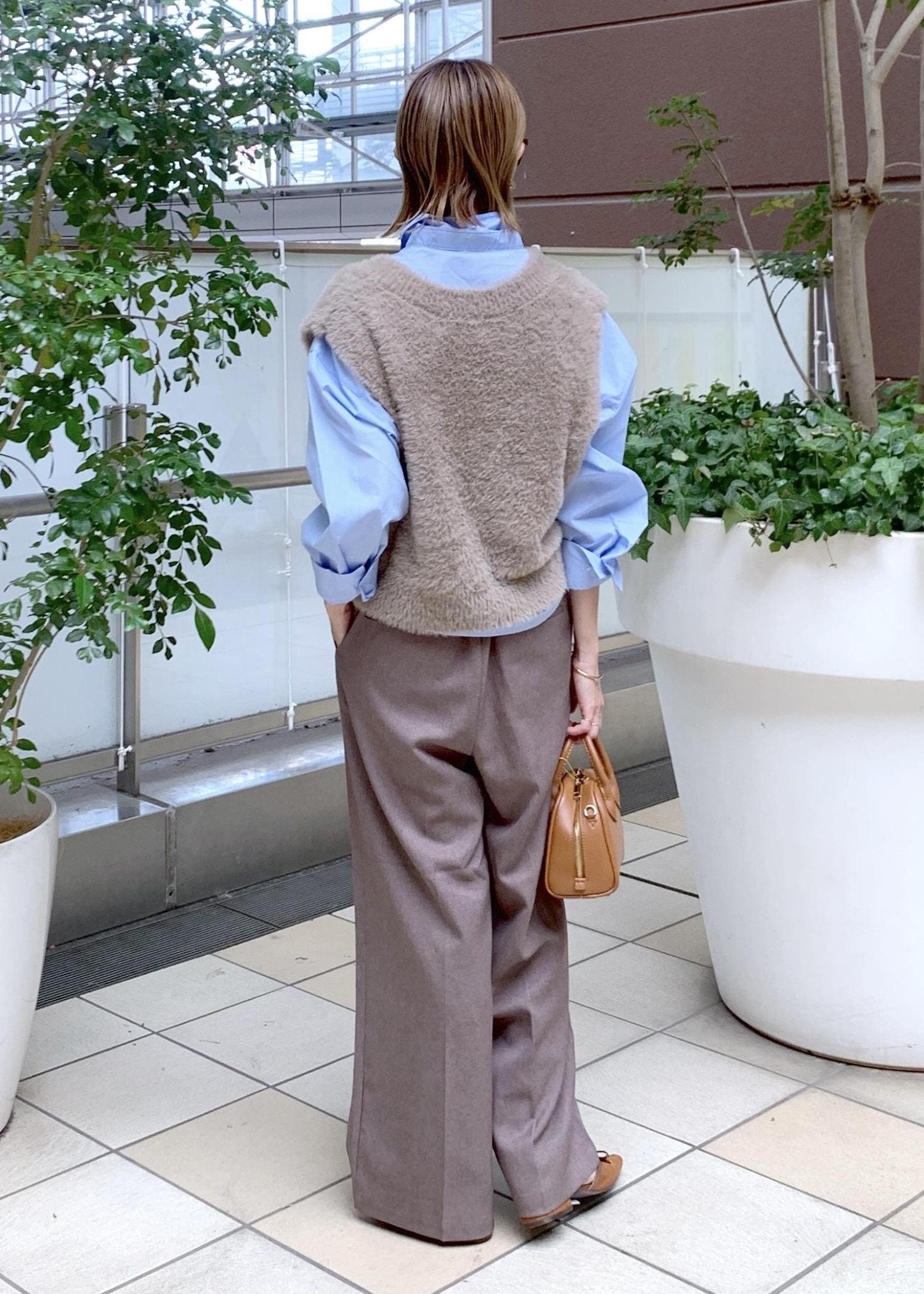 ワントーンの中にショートフェザーニットベストのインナーに合わせたブルーのシャツの差し色がポイント。