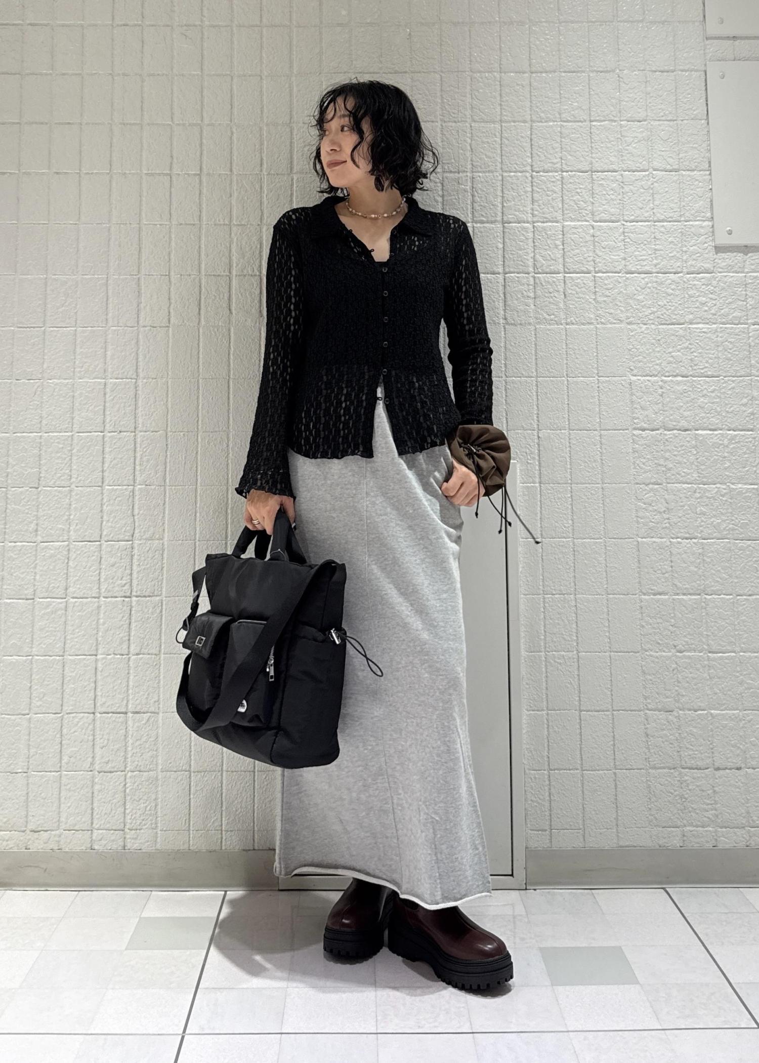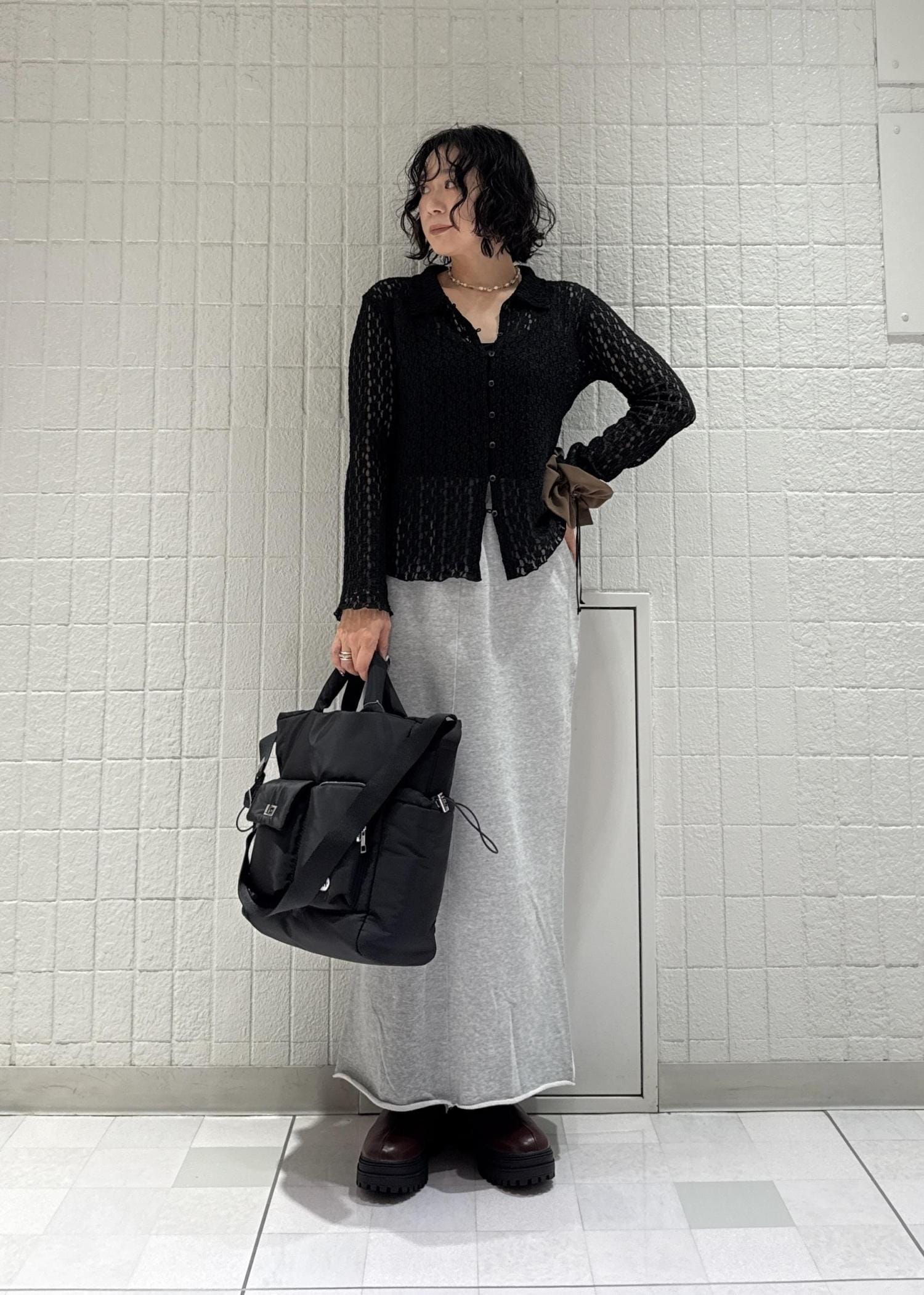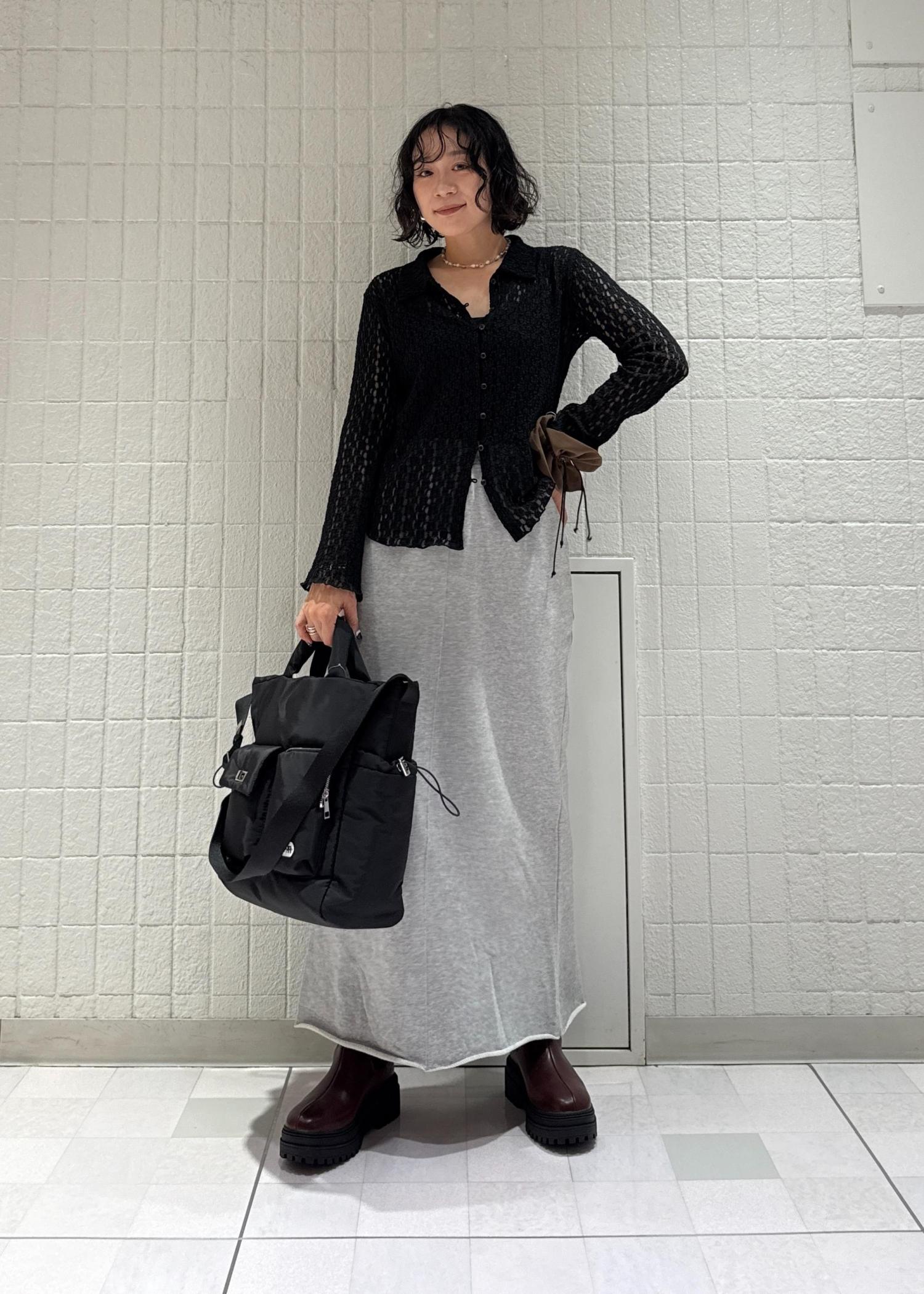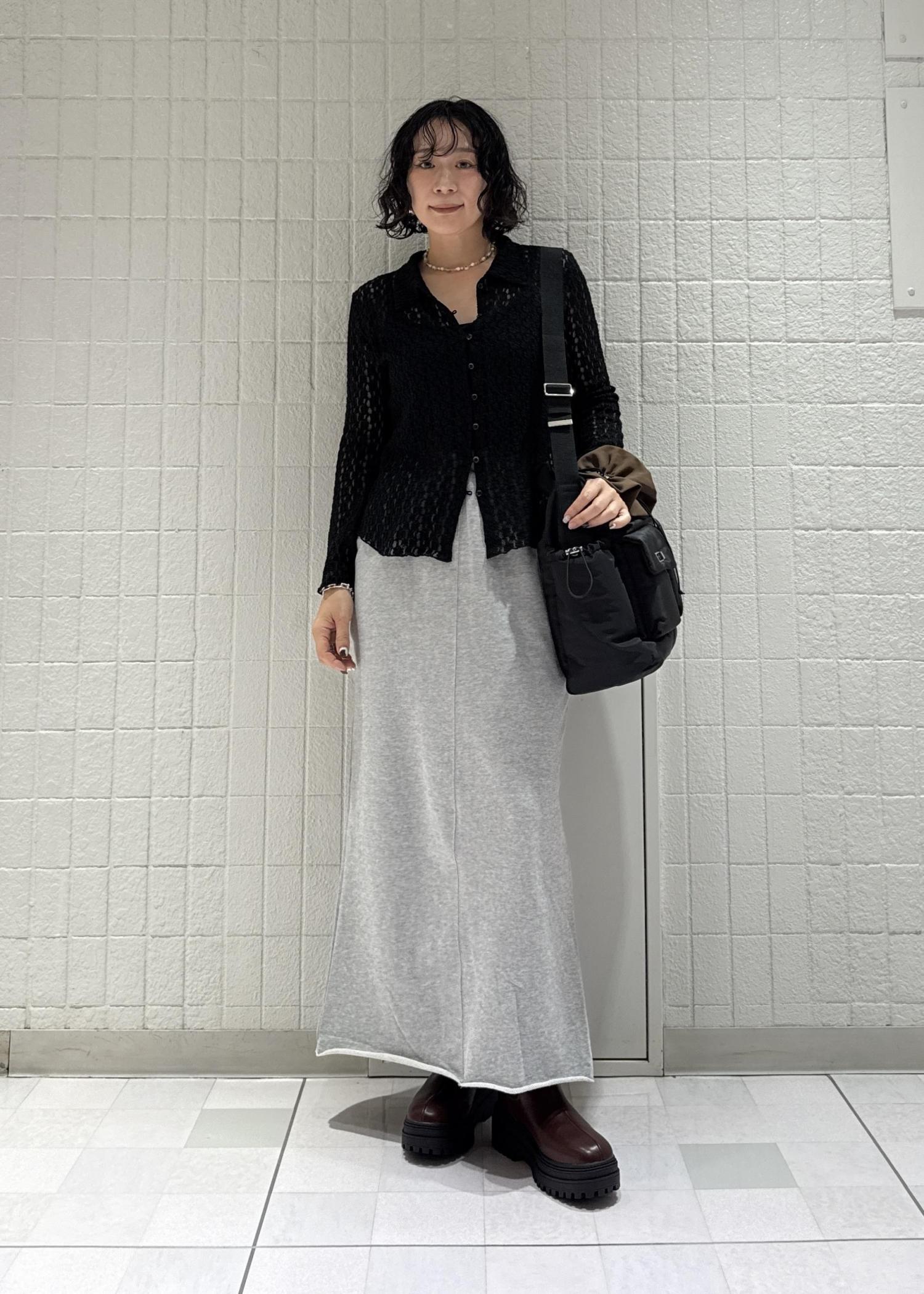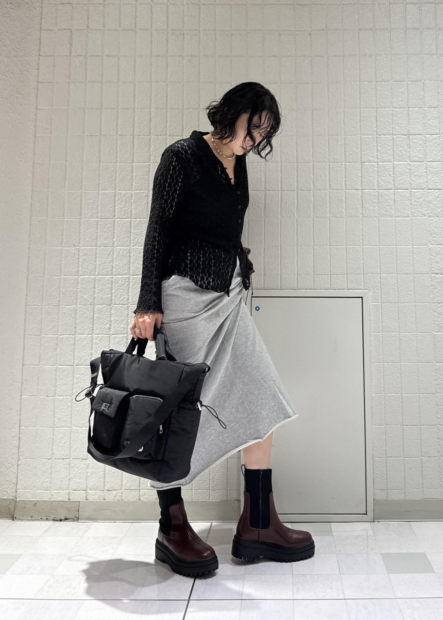 シンプルな合わせだけど、花柄シアーのカーディガンやスエットスカート、ブーツで合わせた事で一気に秋コーデに◎