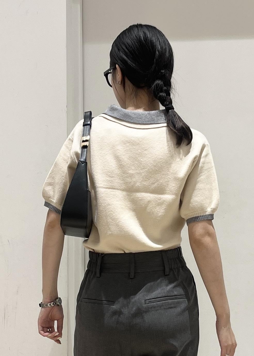シンプルながらも、ダブルカラーになってるデザイン性のあるトップスを選ぶことでおしゃれ見え。