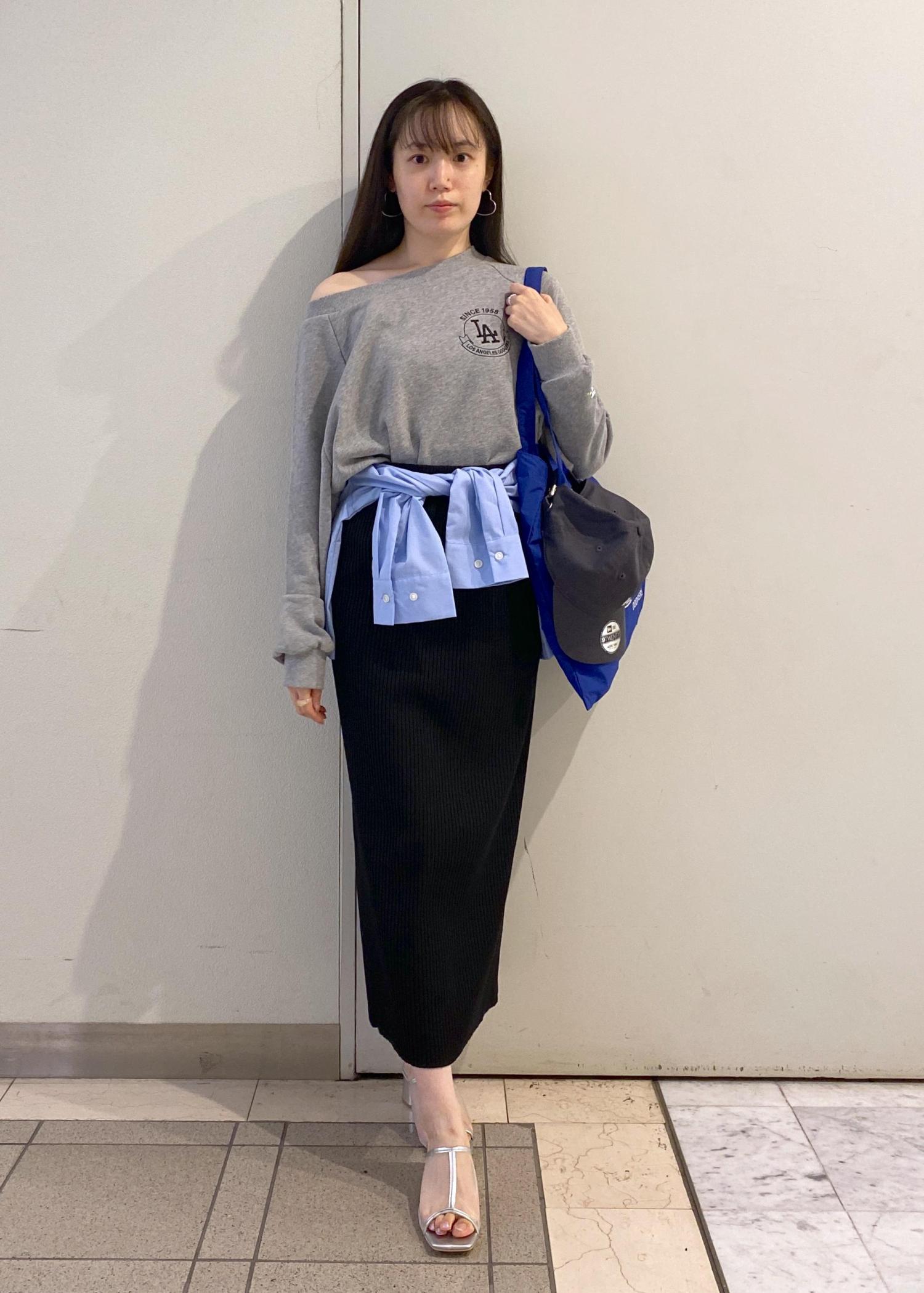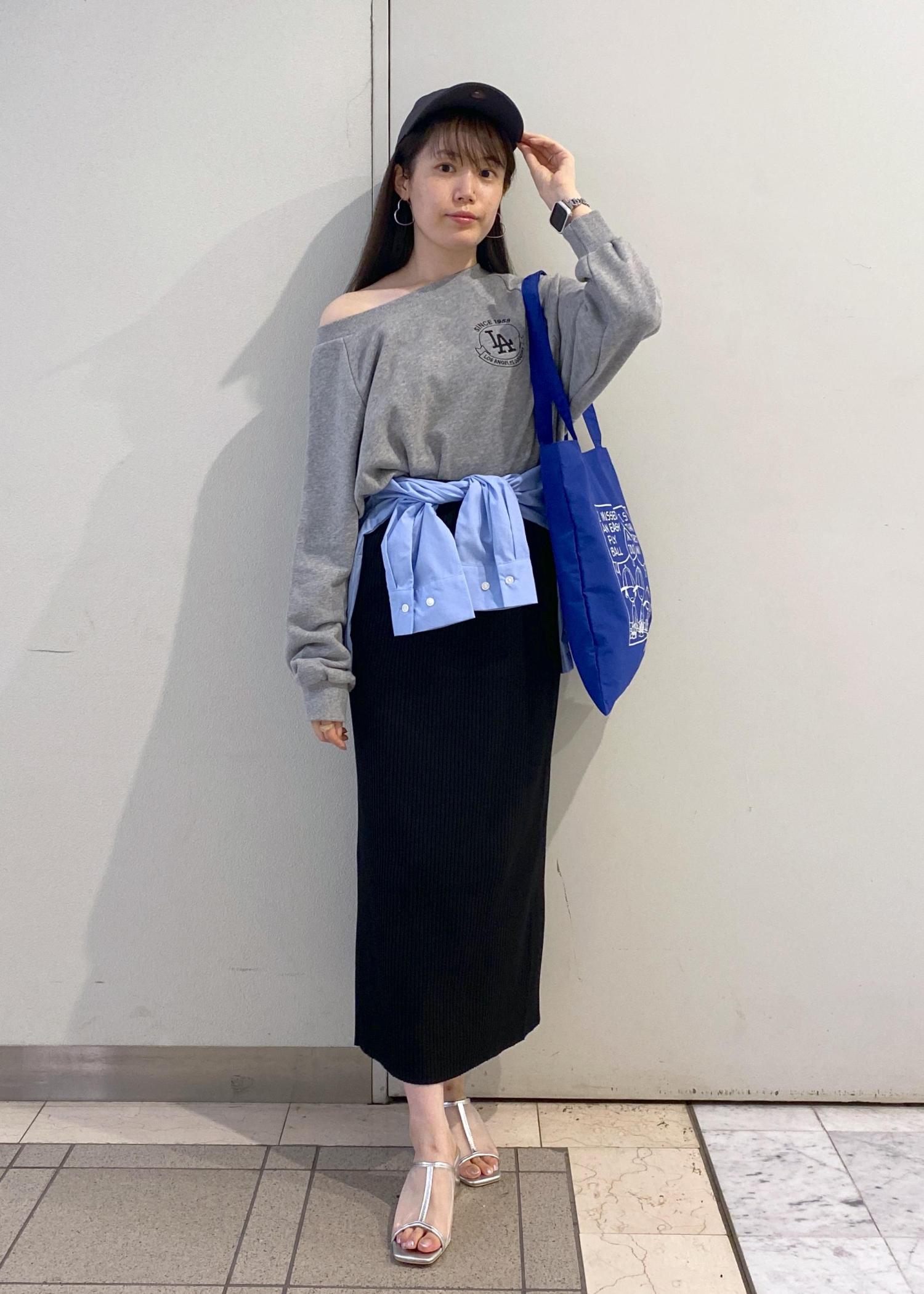 腰にはシャツを巻いてアレンジ。バッグと同じブルー系で揃えました。