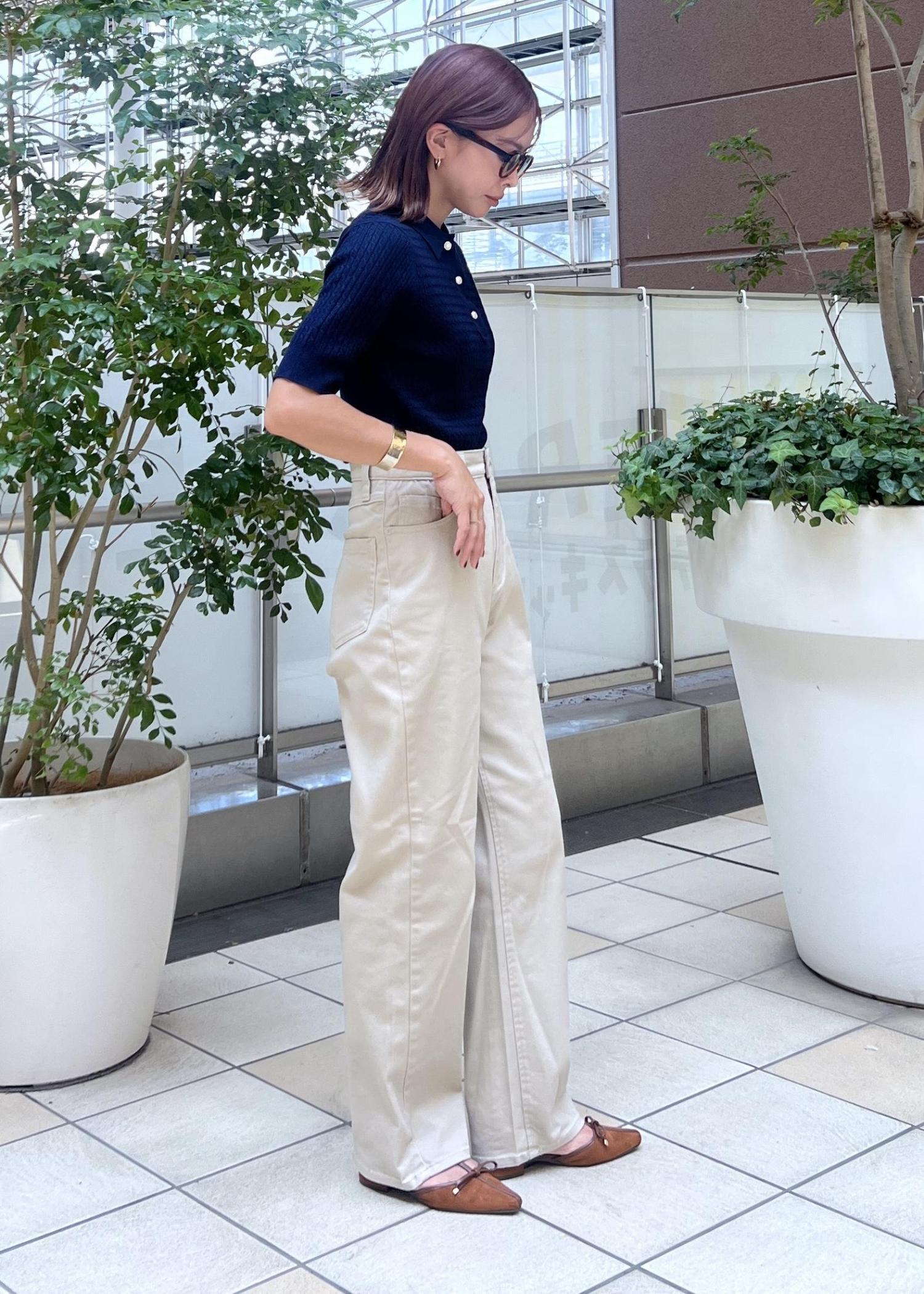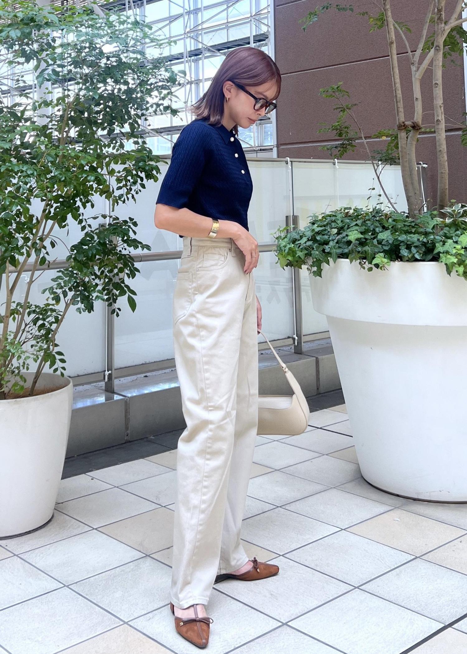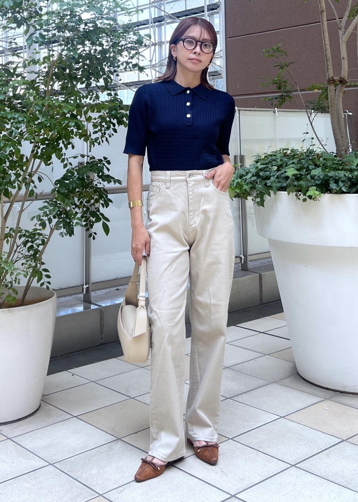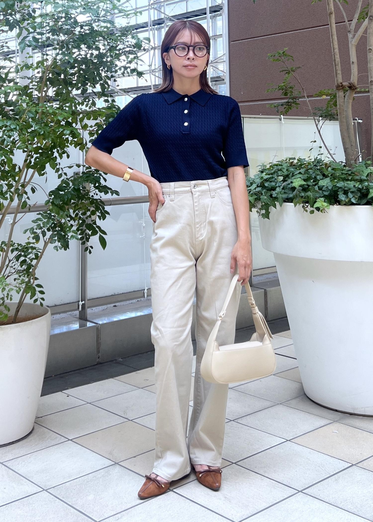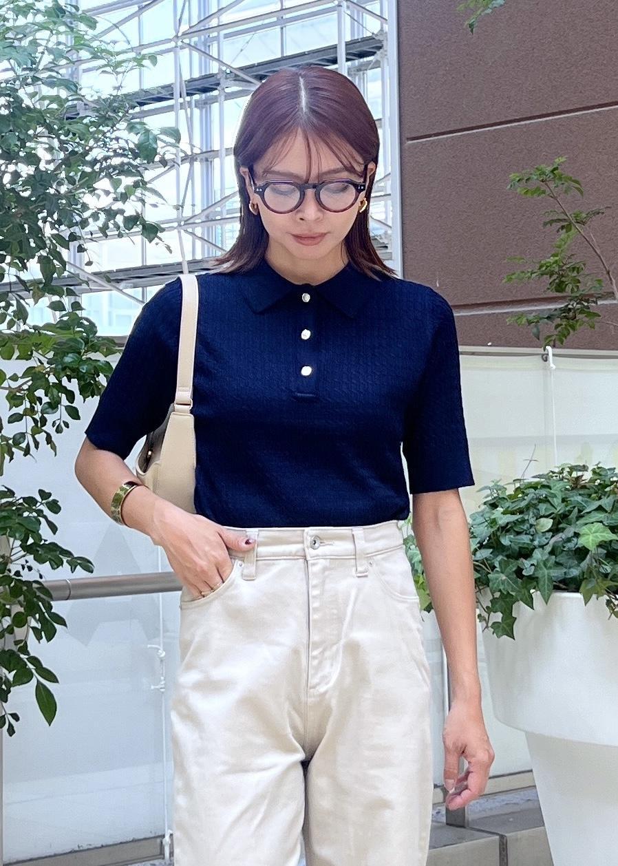 トレンド感のあるポロニットは、ネイビーなら大人カジュアルなコーデにぴったり。
