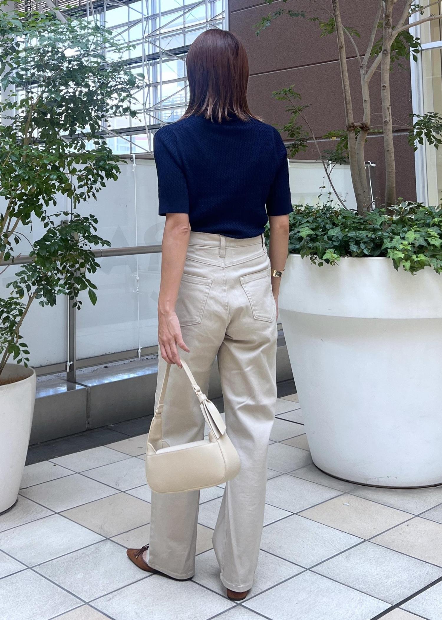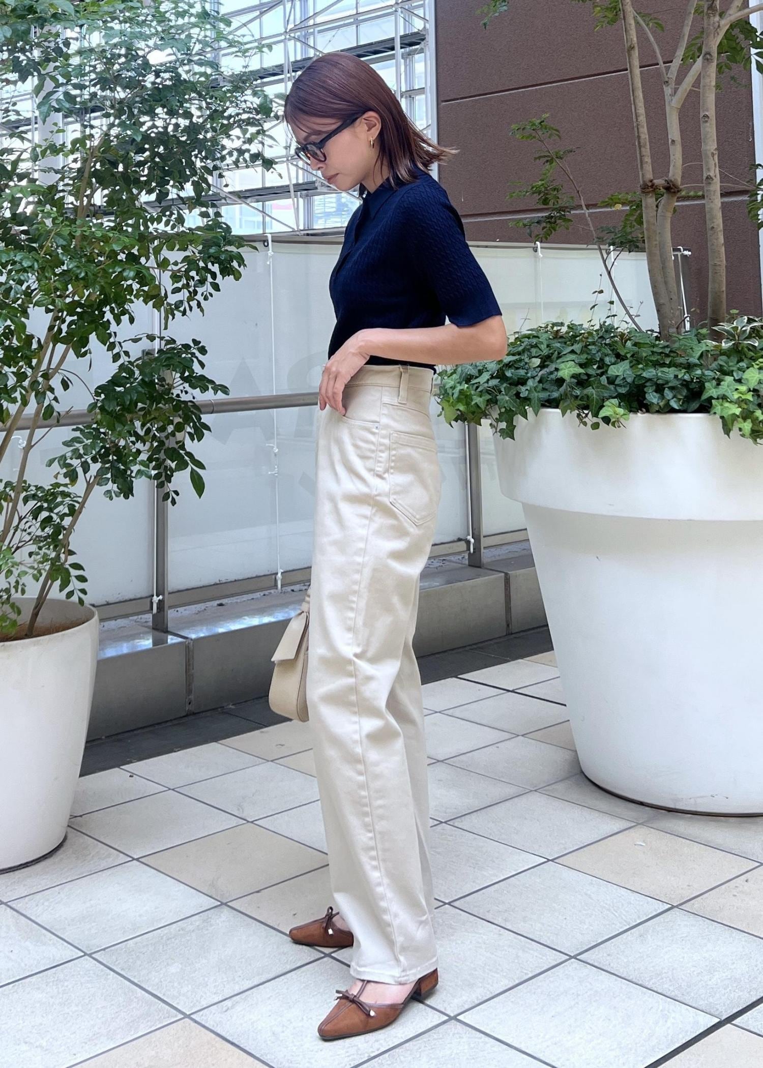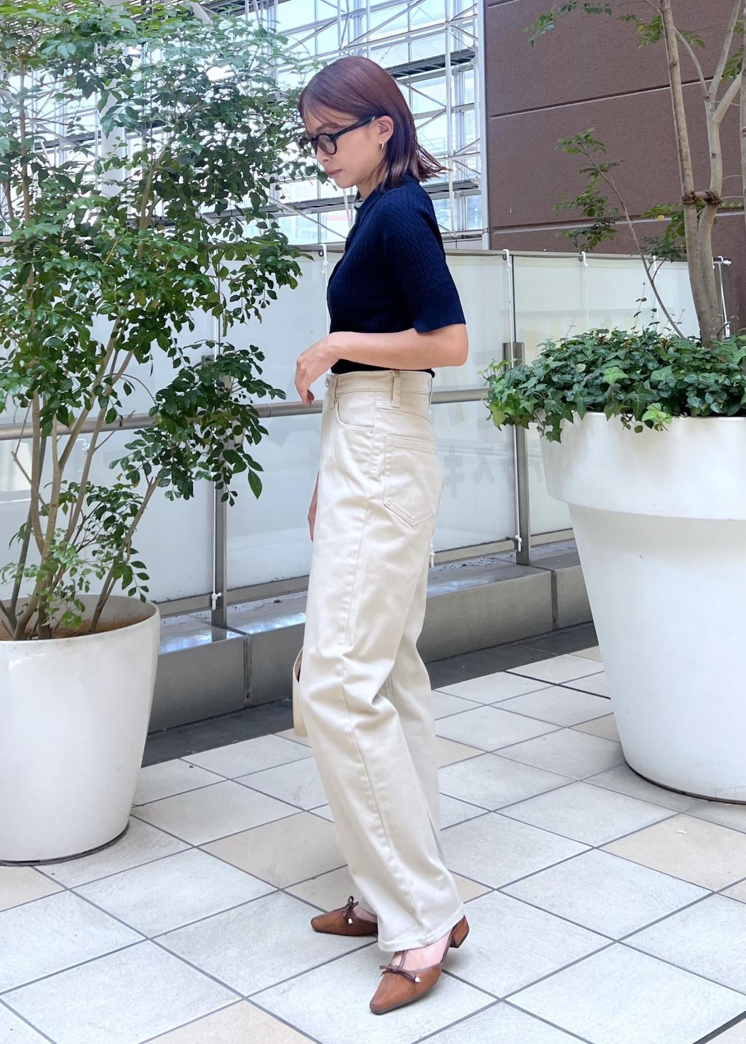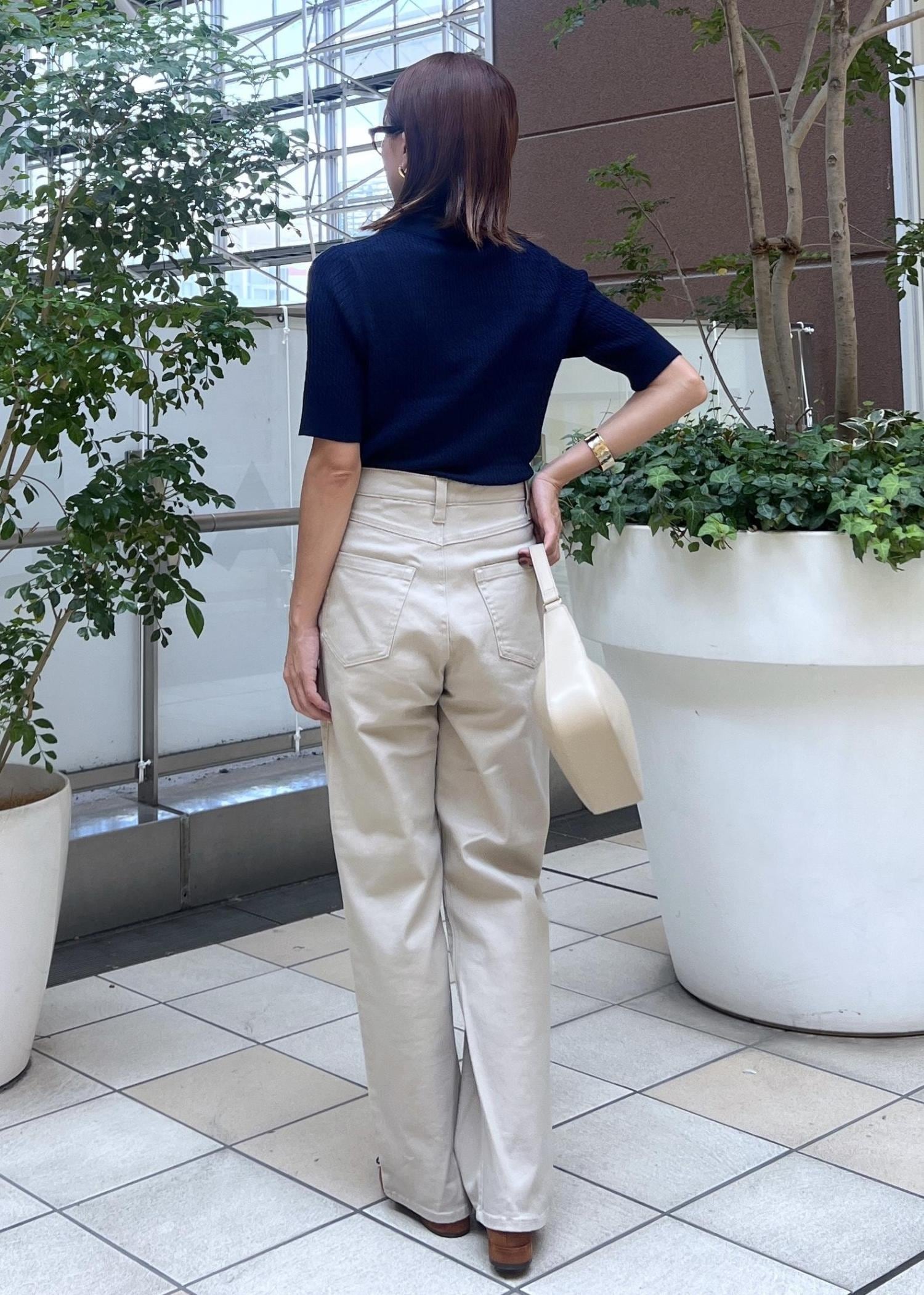 ジャストの着丈なのでボトムを選ばず合わせやすいです。 -