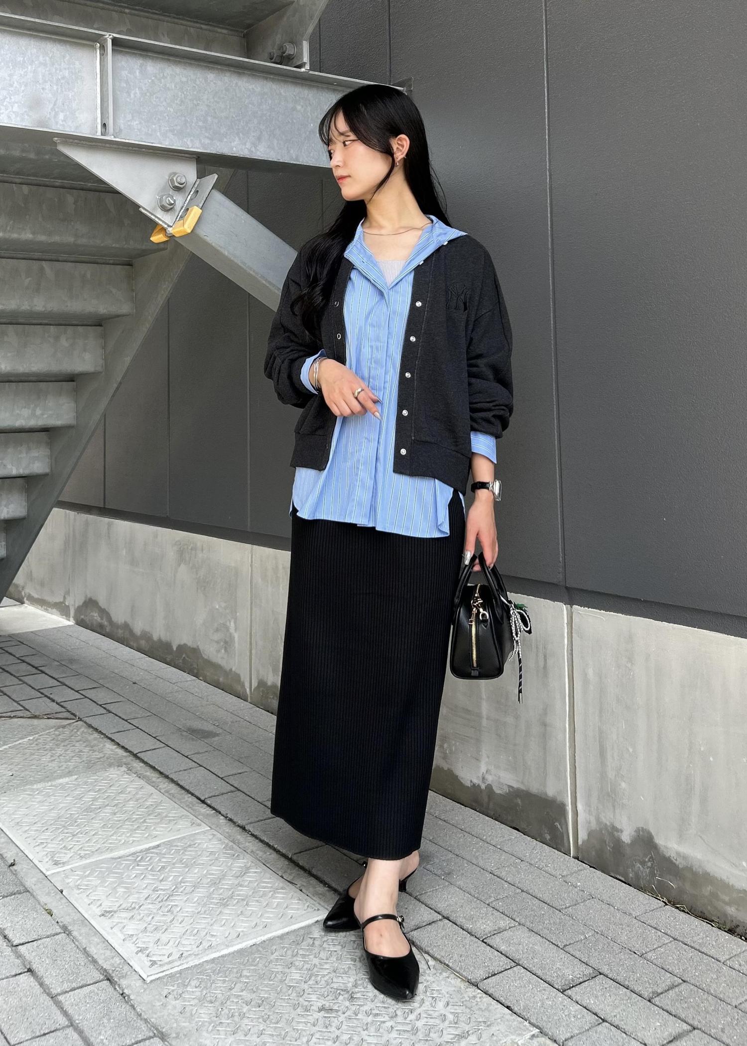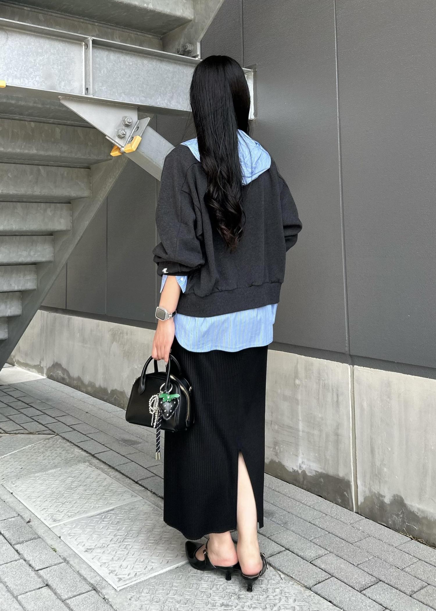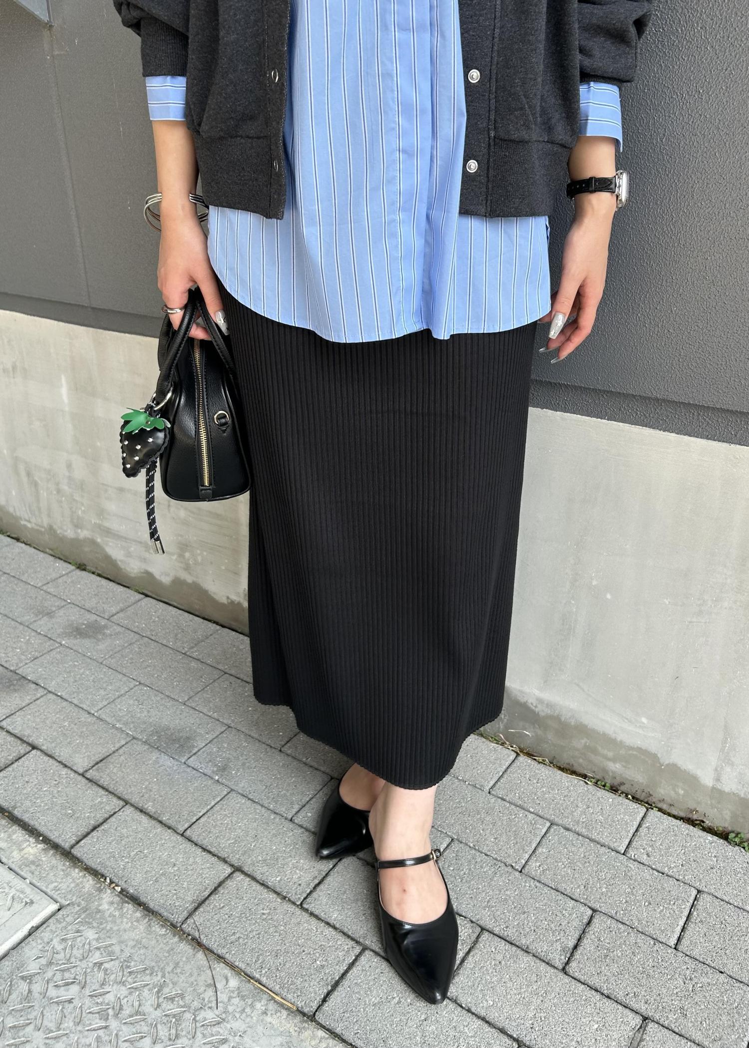 縦ラインが強調されるリブのロングスカートを合わせることで全体がすっきりまとまります。