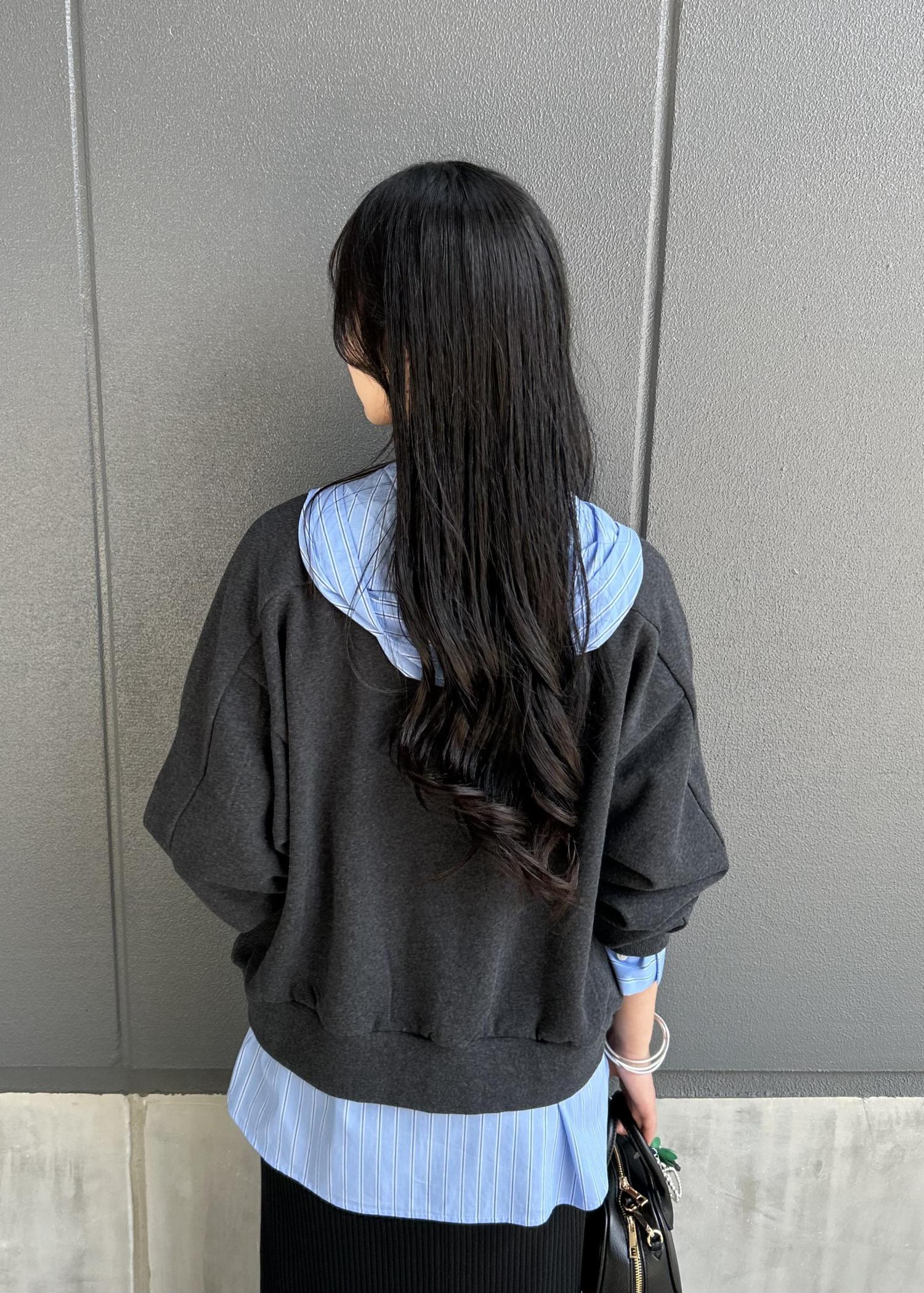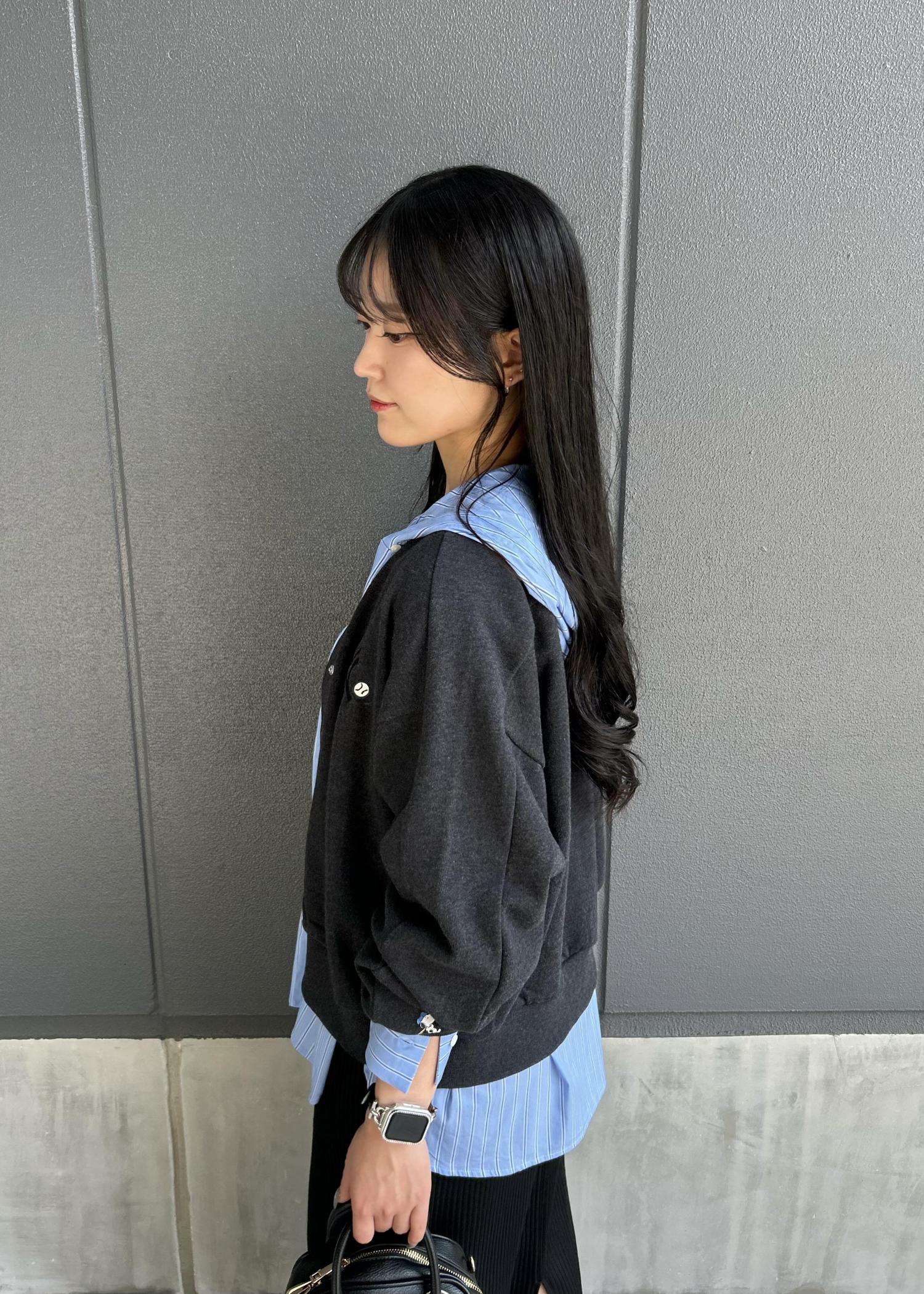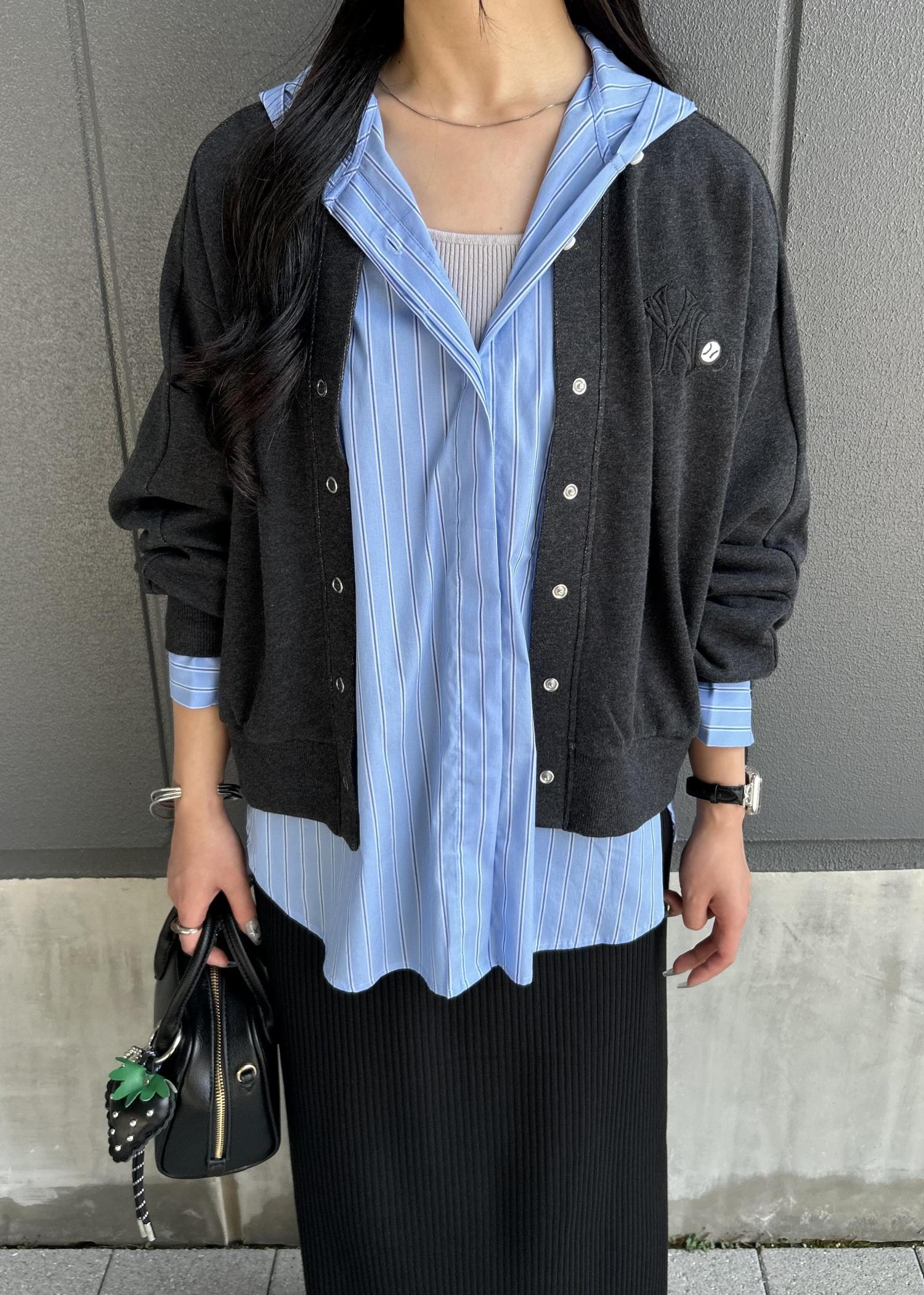 ブルーのストライプシャツにゆとりのあるカーディガンを重ねて、軽さのあるレイヤードにしました。