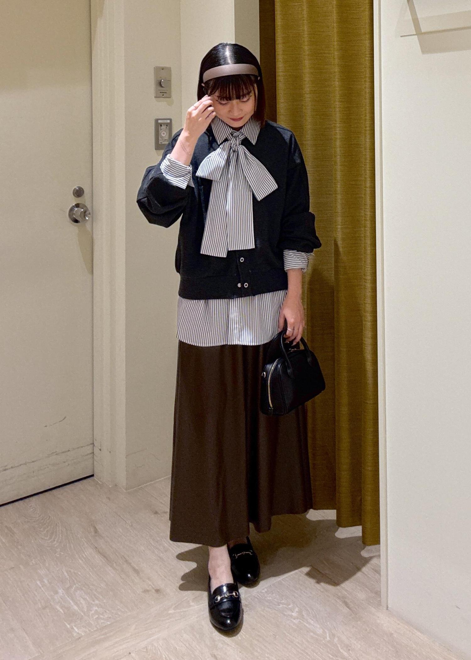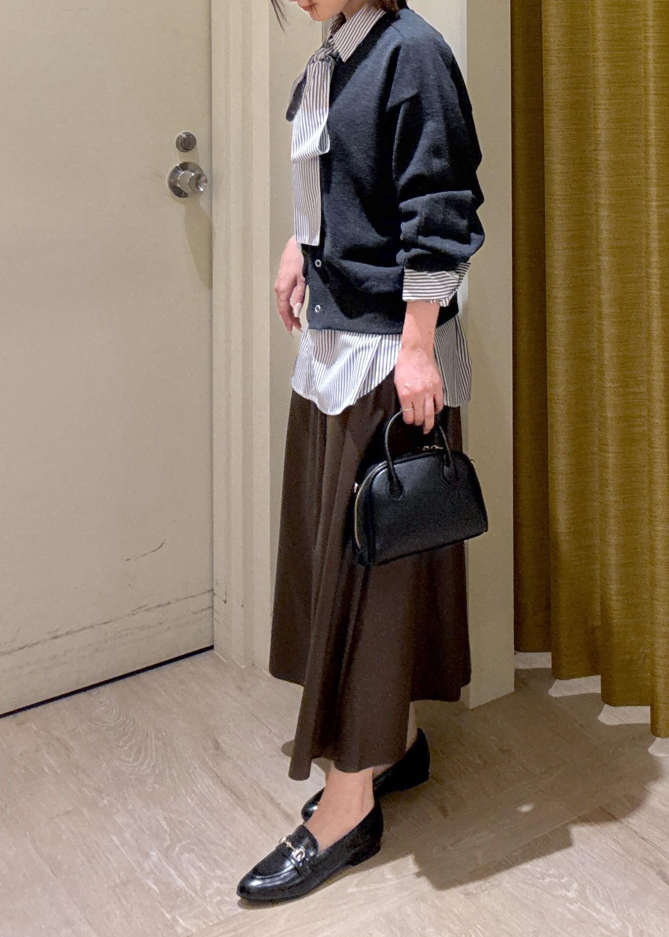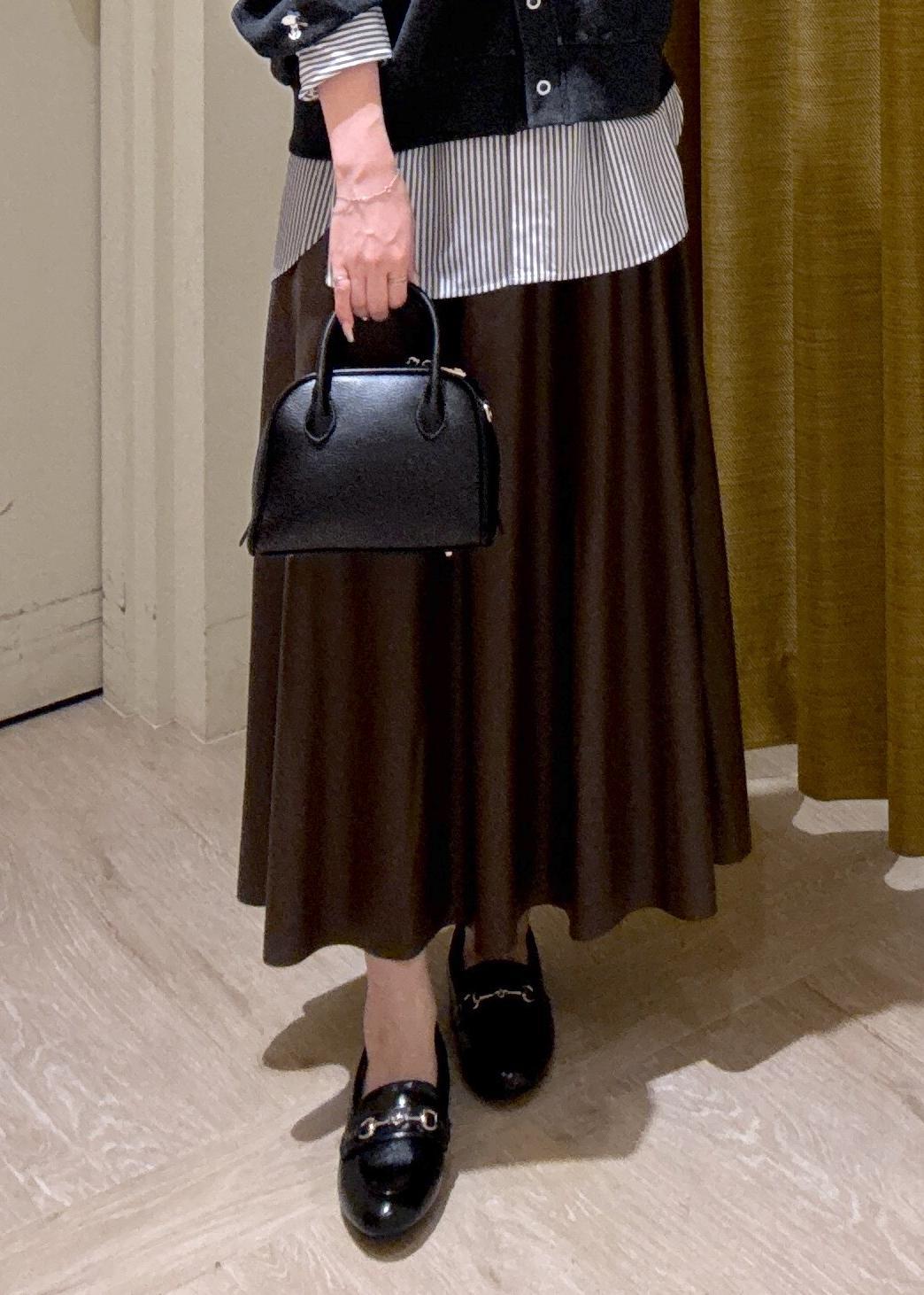 見た目よりボリュームのあるフレアスカートでレザーのデザインが秋っぽく高みえ◎ -
