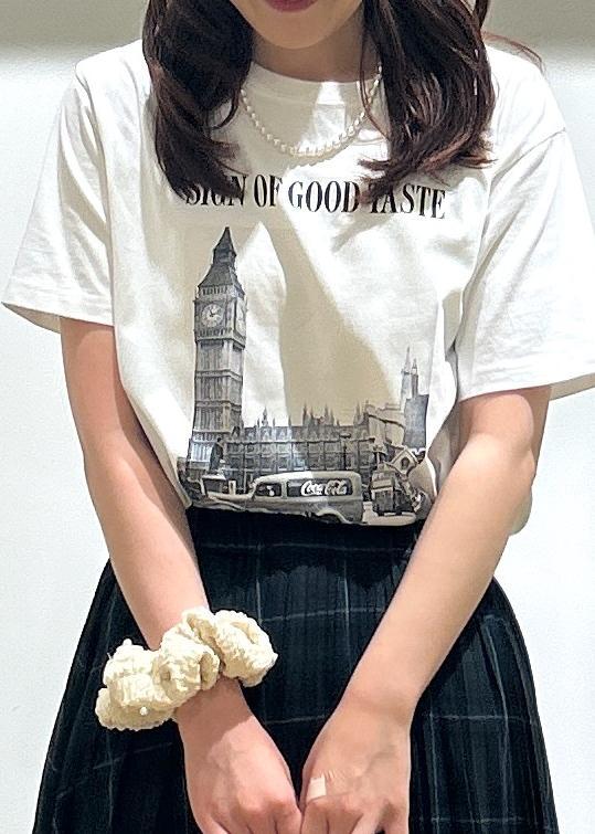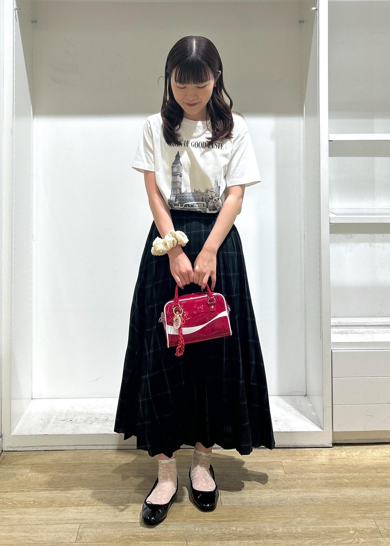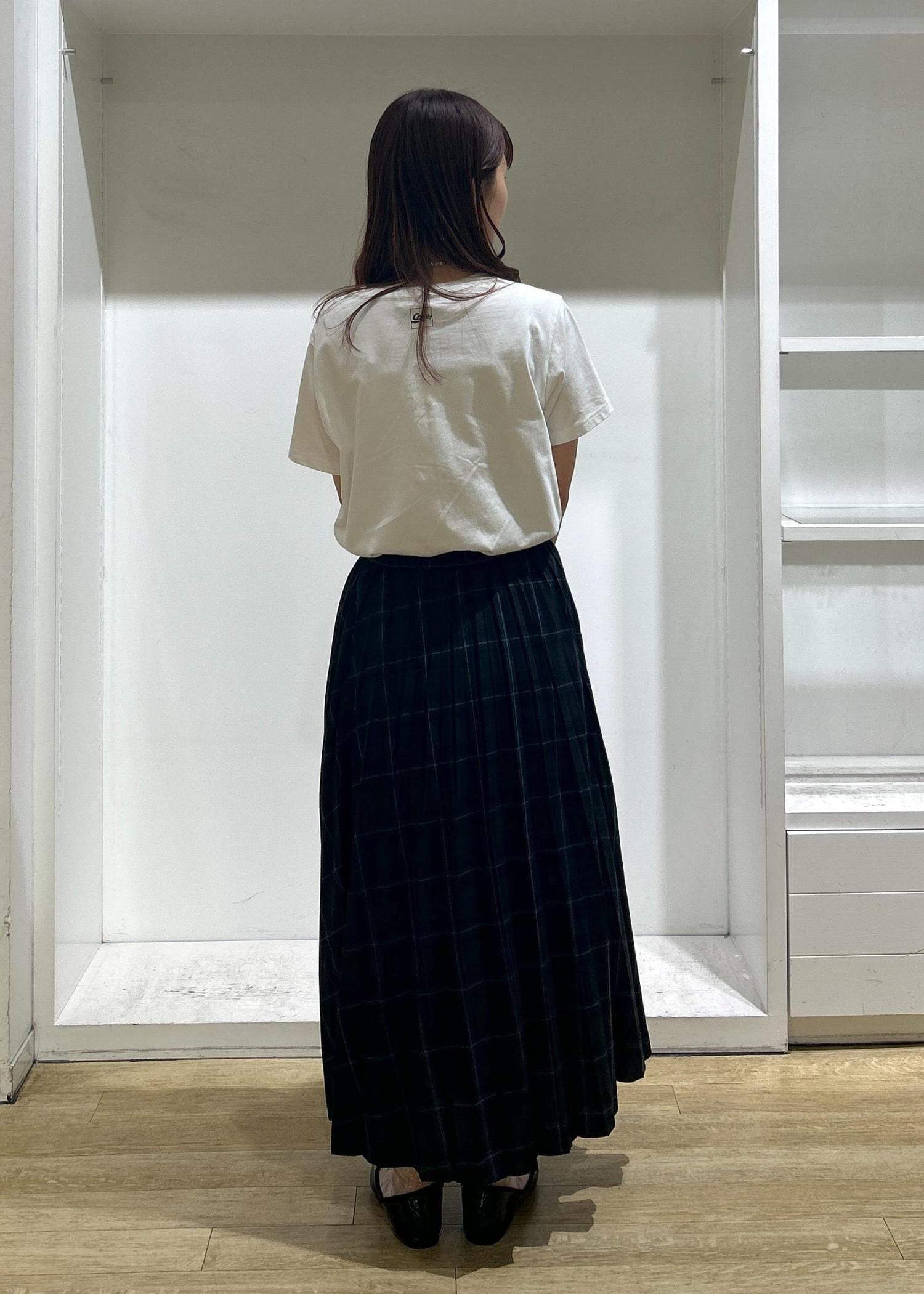 チェックスカート×Tシャツを合わせた、レトロ感のあるコーディネートにしました。