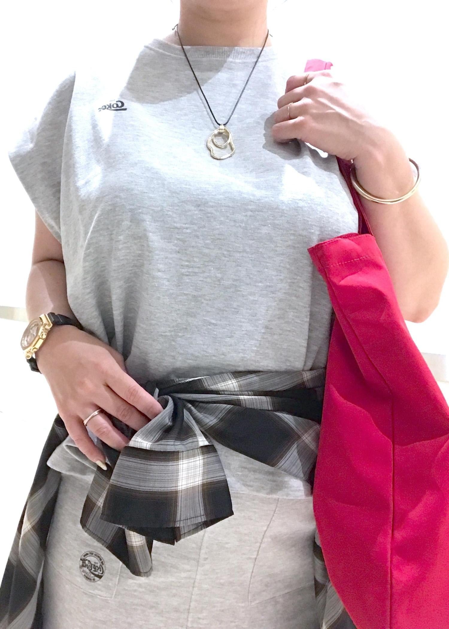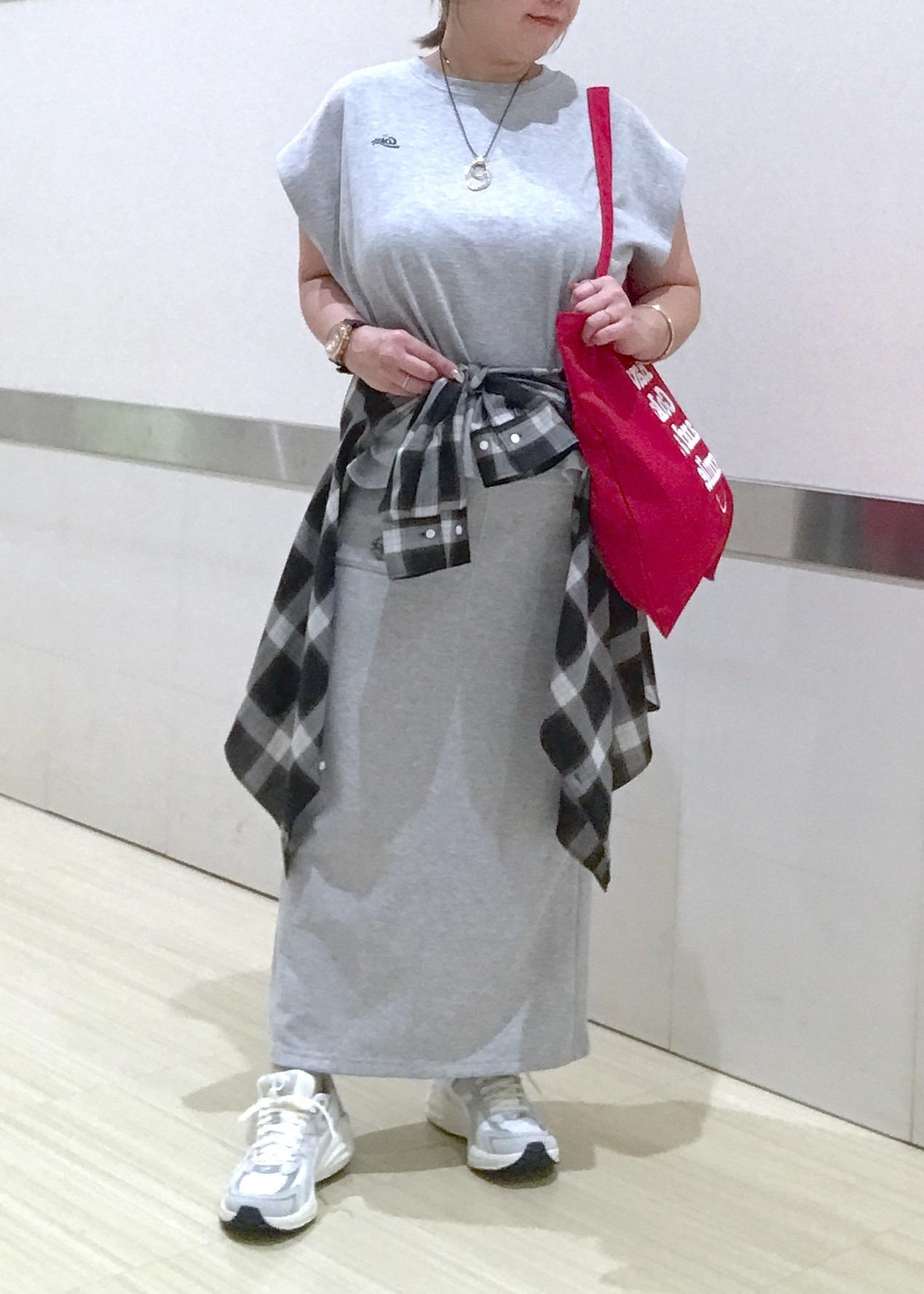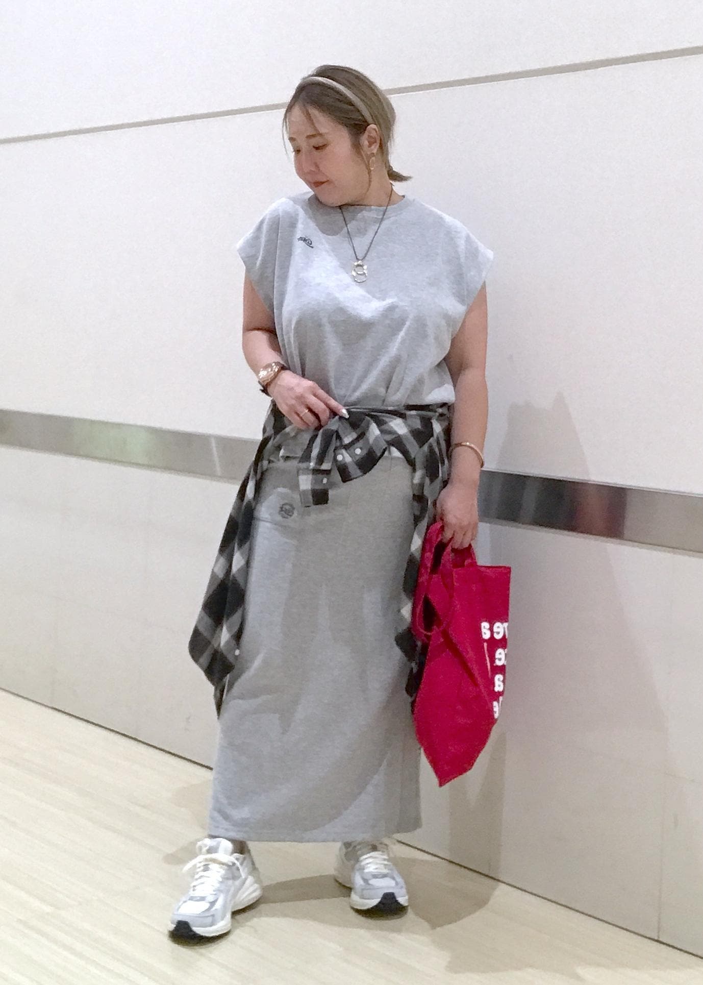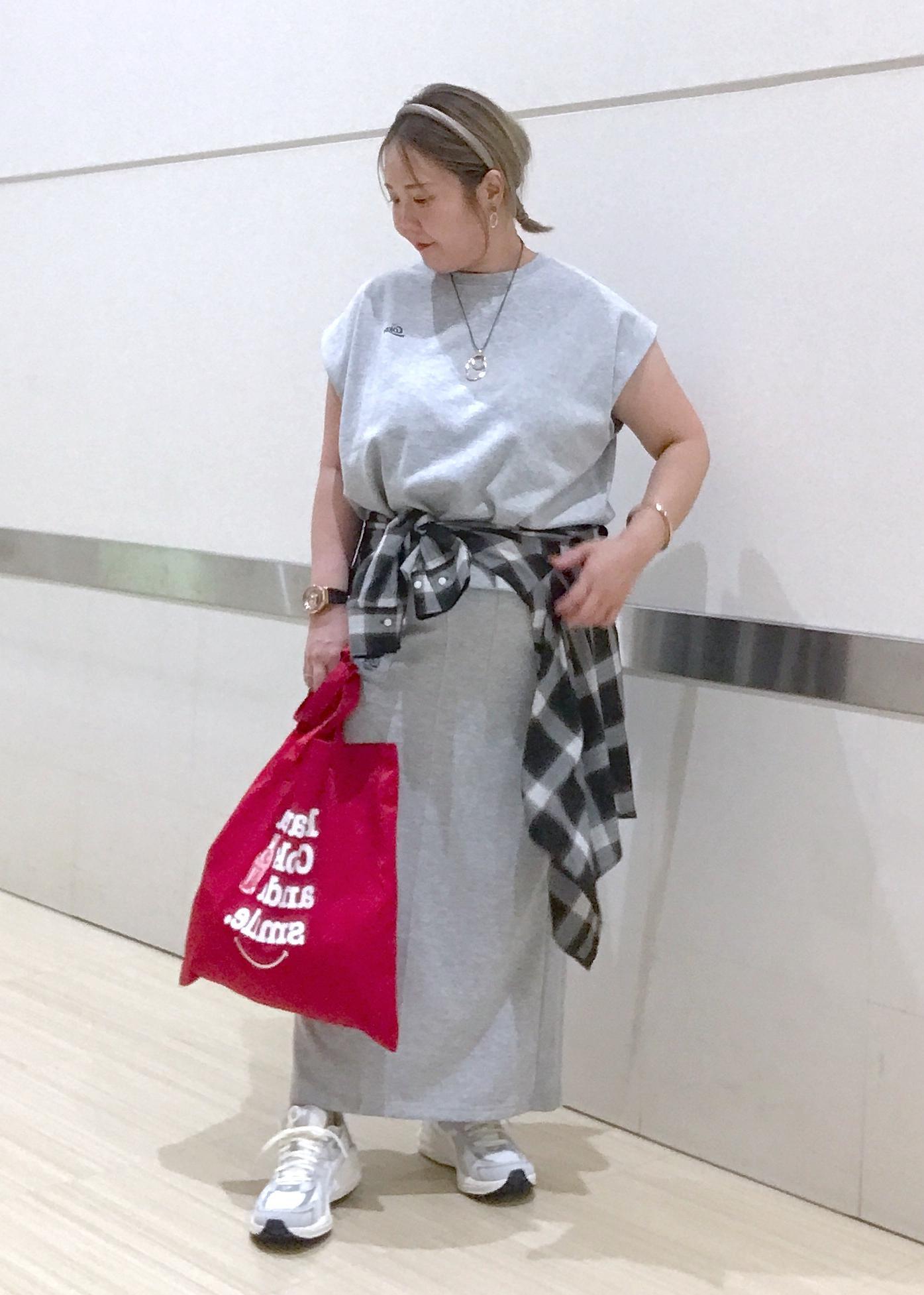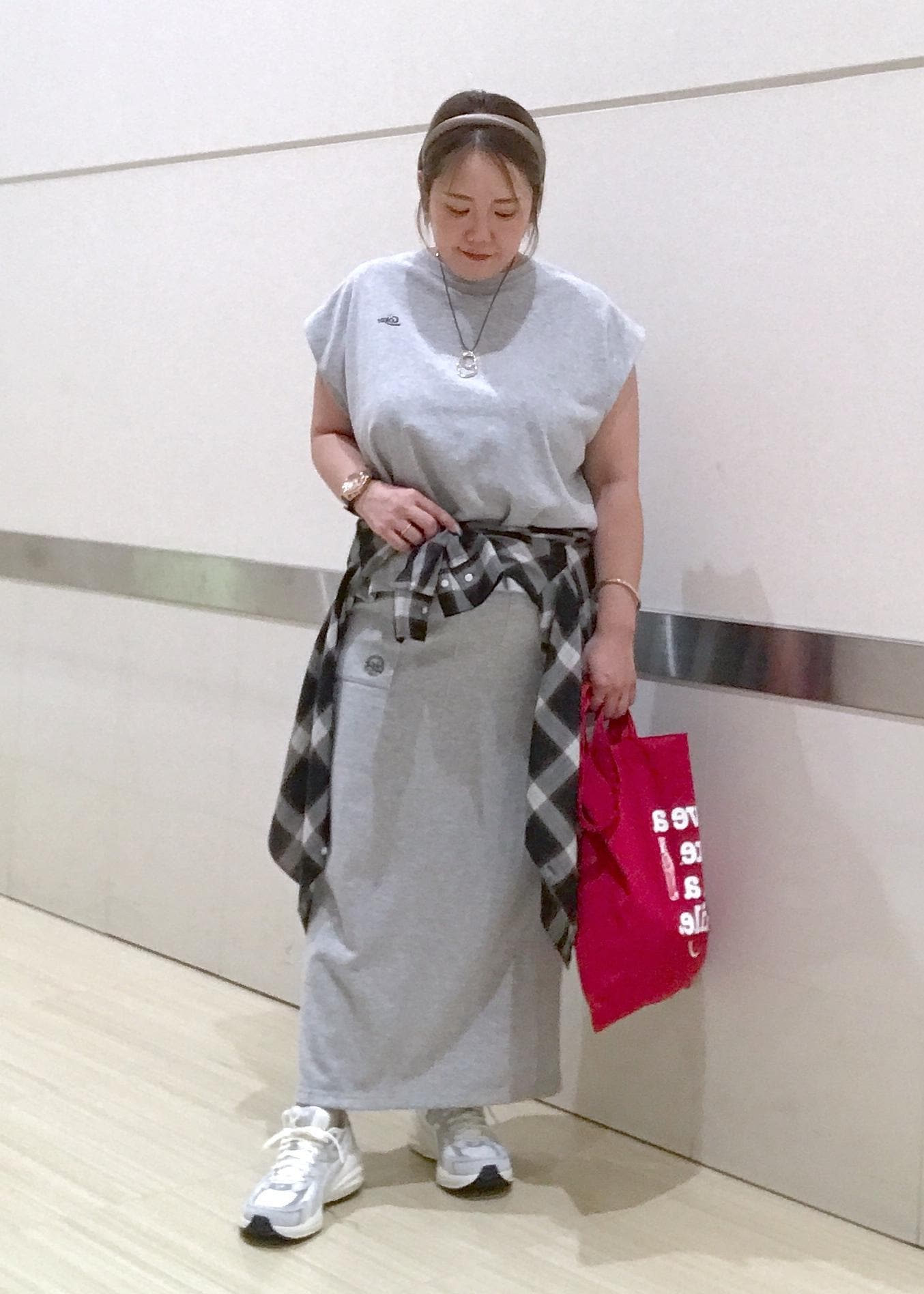 チェックシャツを腰巻きにして、秋らしさをプラス♡スニーカーを合わせてリラックスコーデにしました。