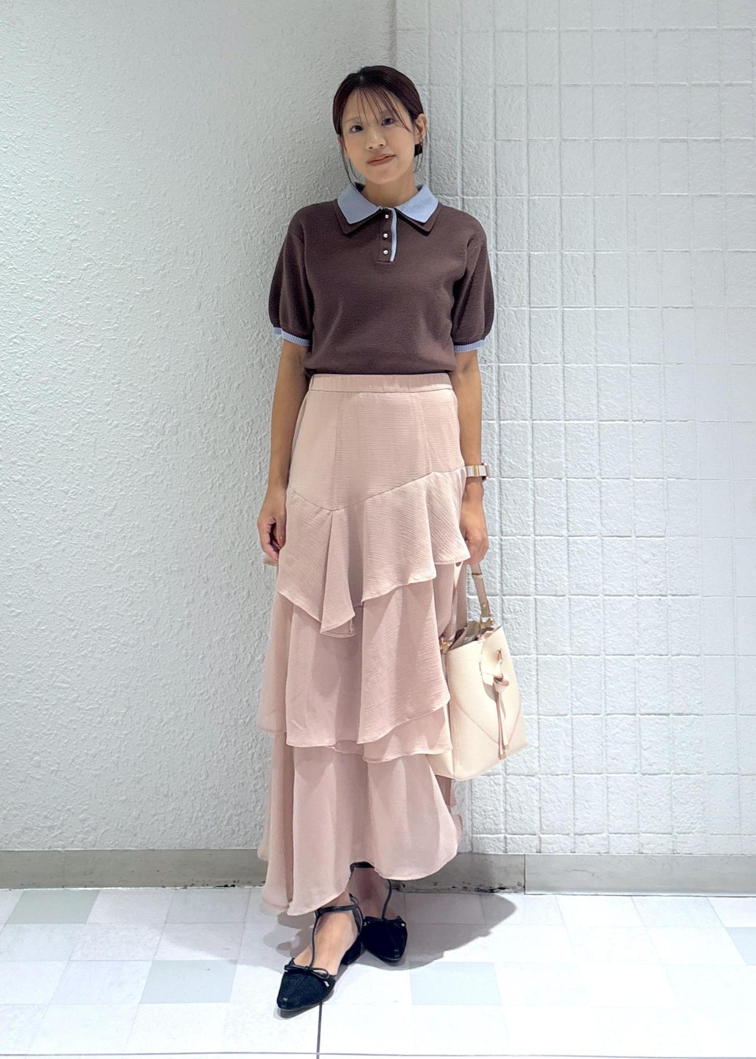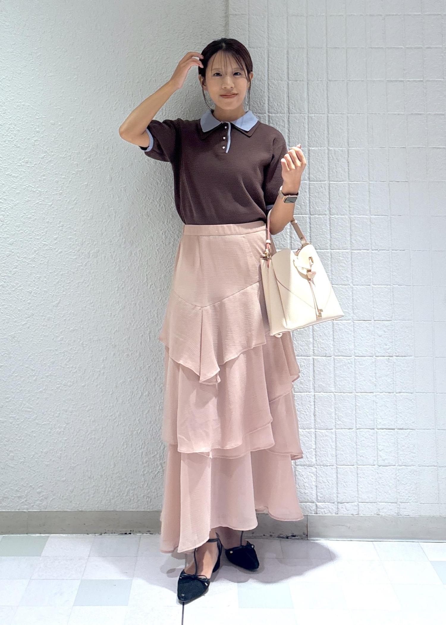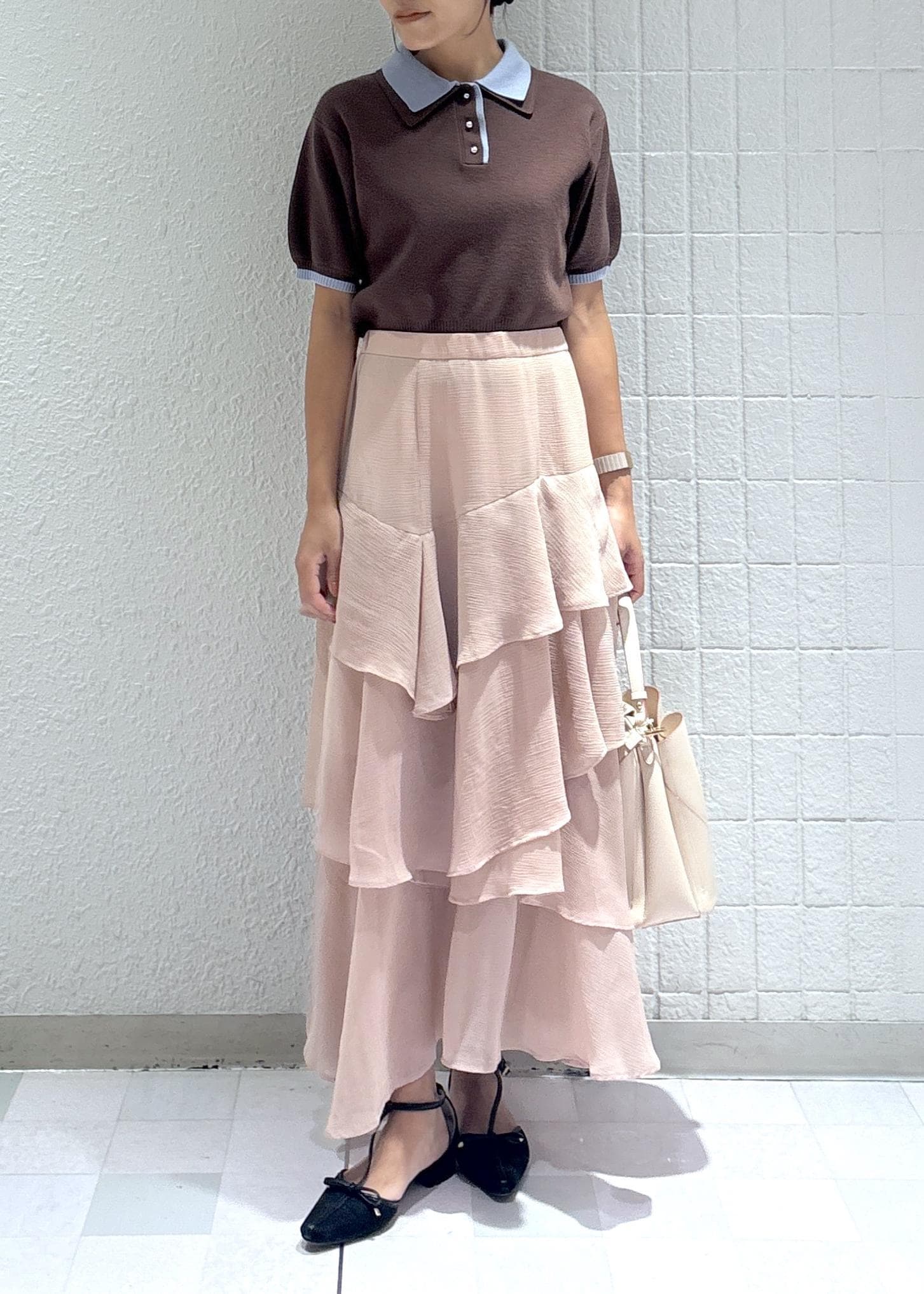 半袖ニットにティアードスカートを合わせて女性らしいコーデに、、、!