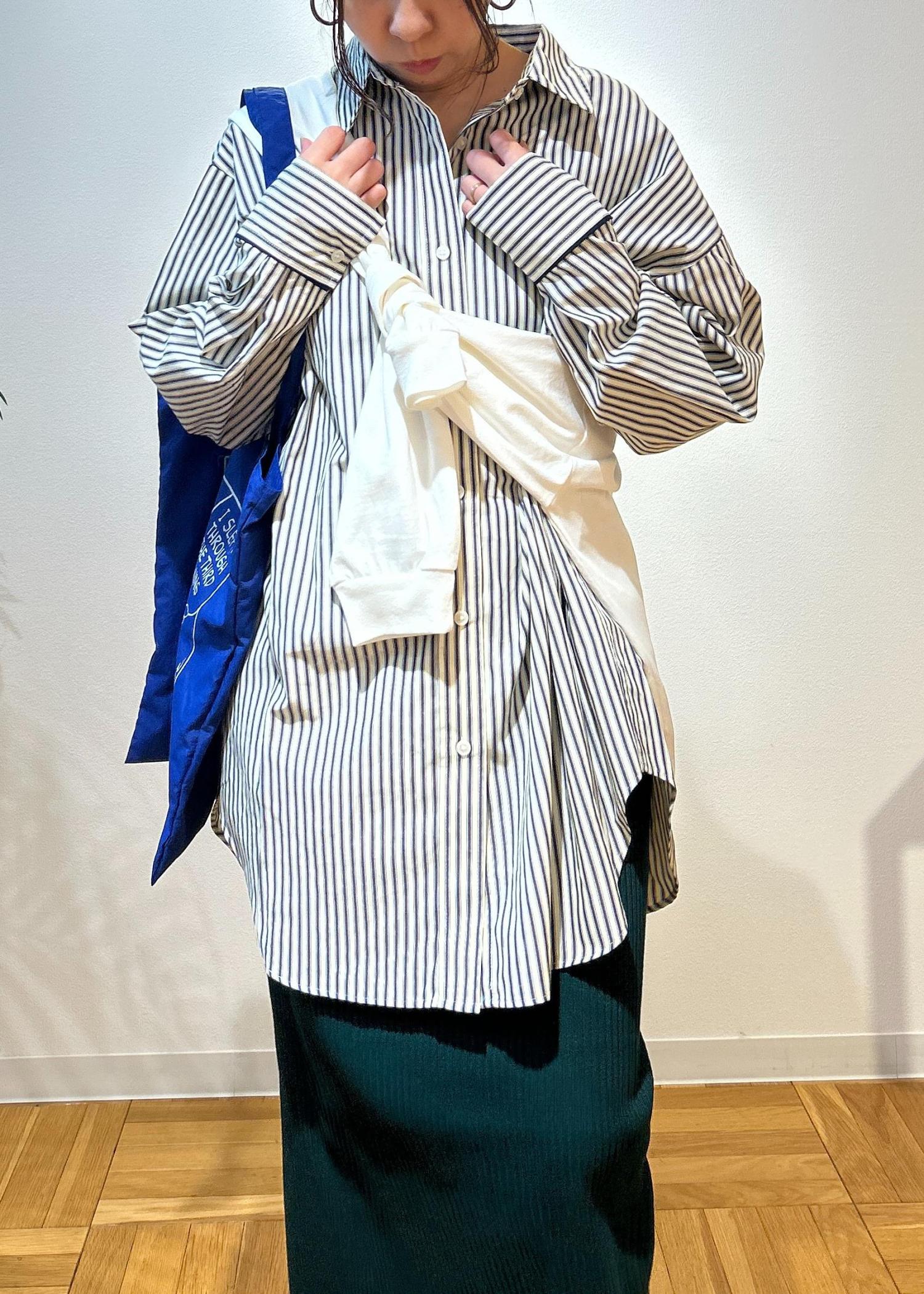 オーバーシルエットで、袖丈も長いですがカフスにとめるボタンが二箇所あるのでしっかり止まります。