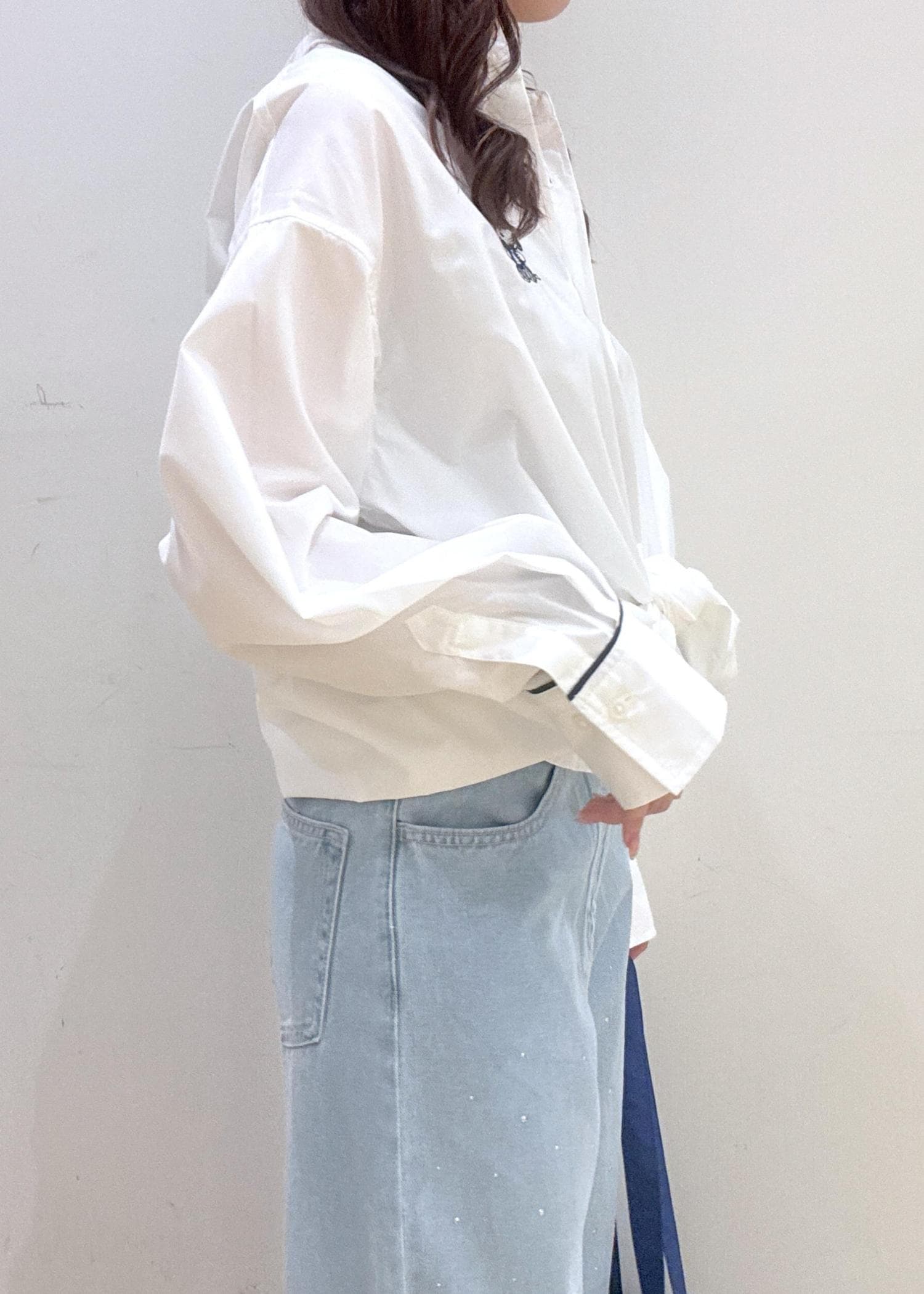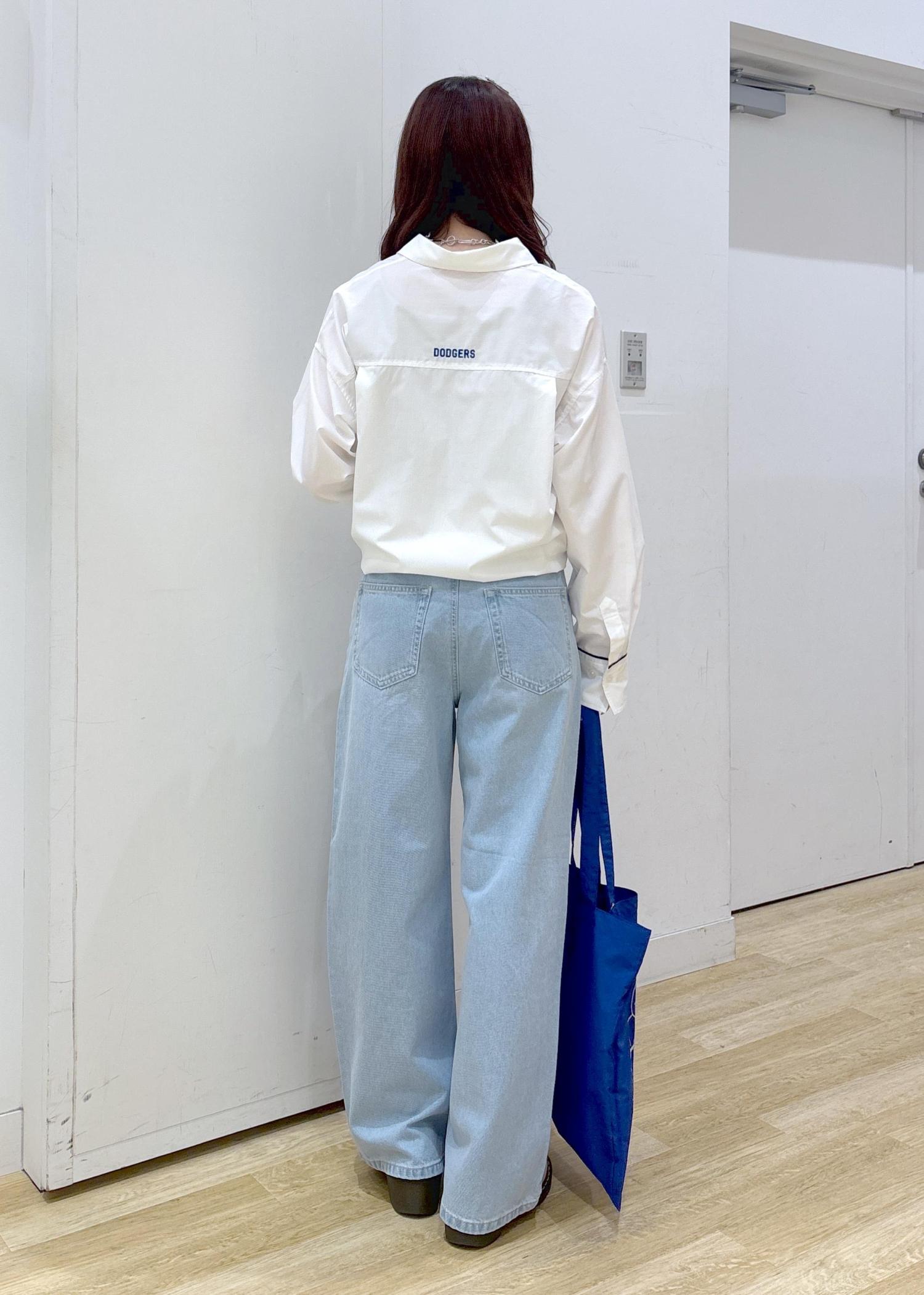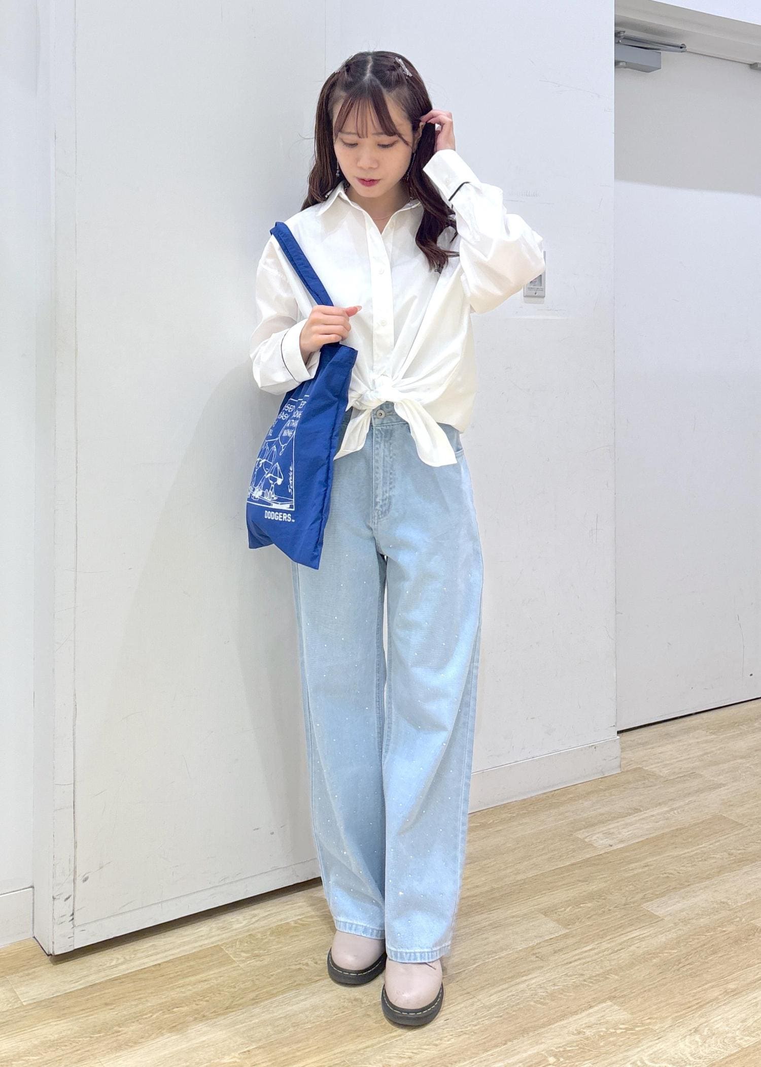 オーバーサイズのシャツをウエストで縛ることでスタイルアップ効果があります◎