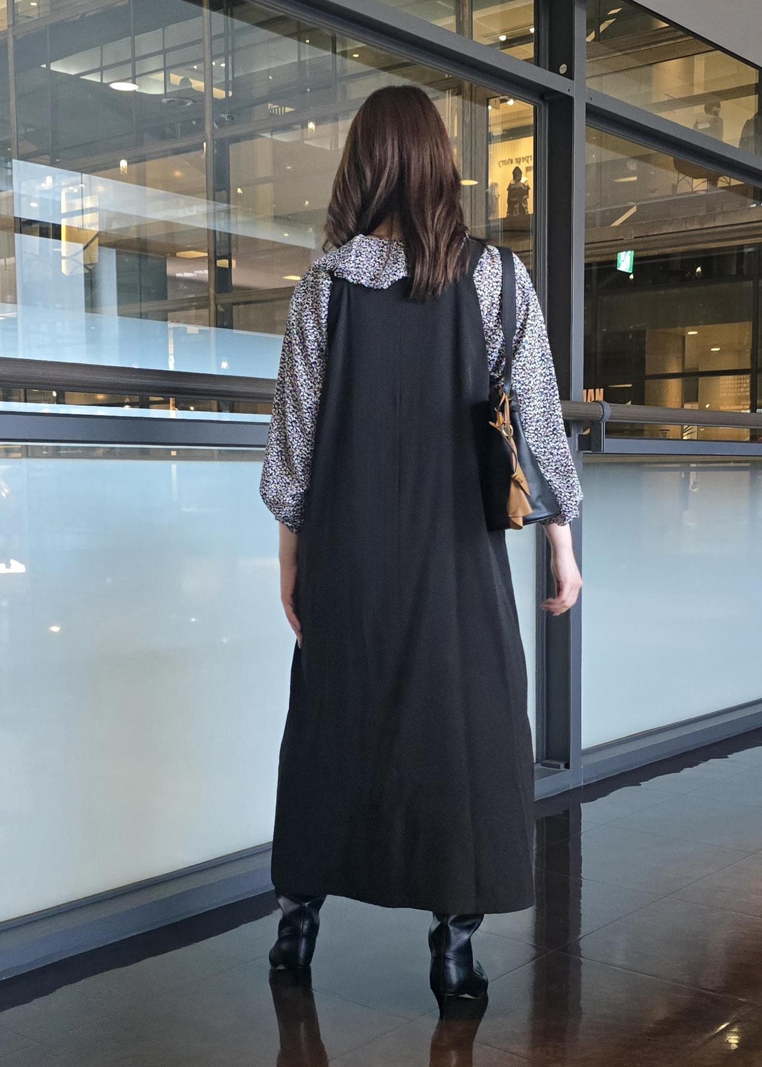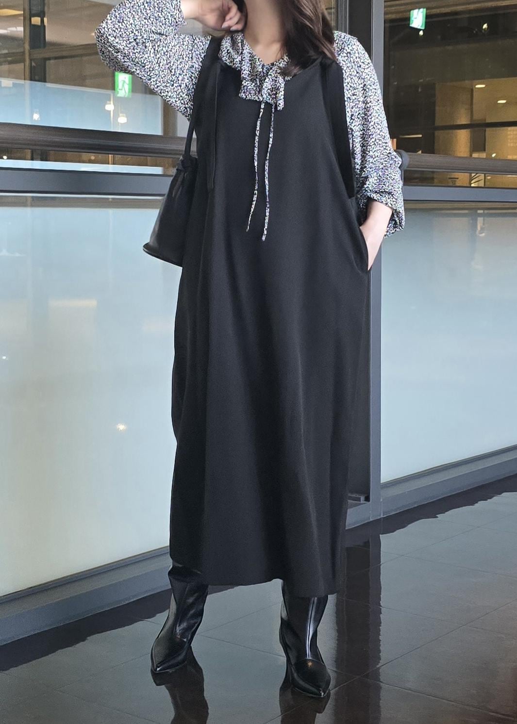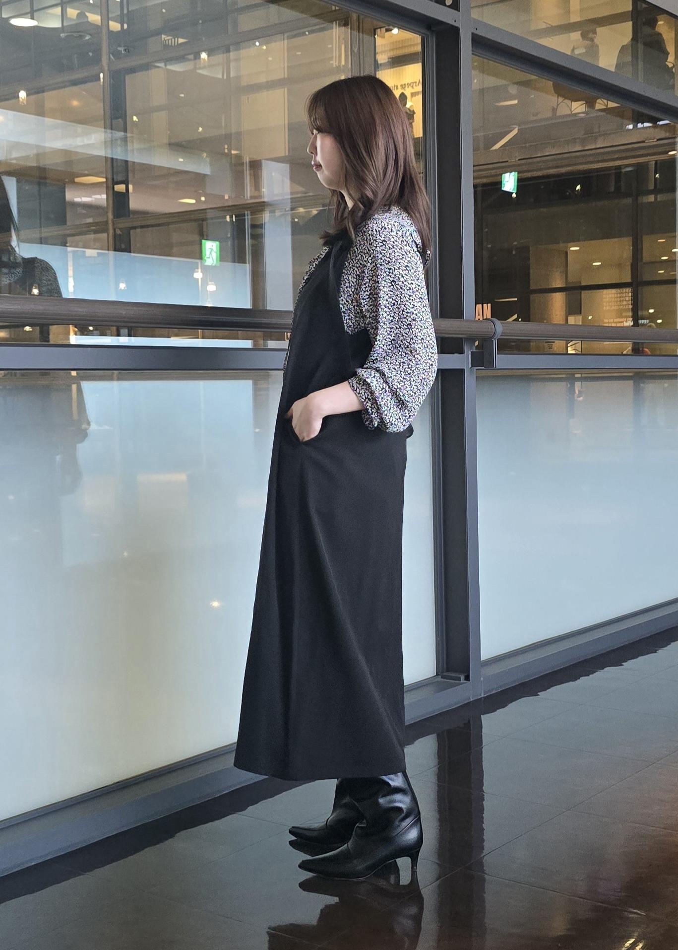 ジャンパードレスにロングブーツを合わせて秋を楽しく過ごせるスタイリングに○