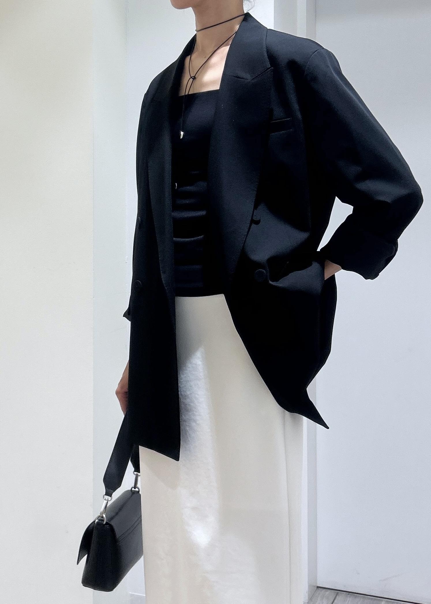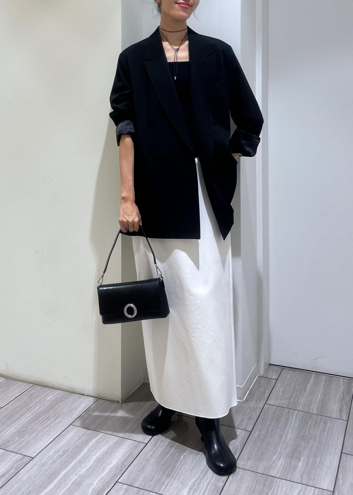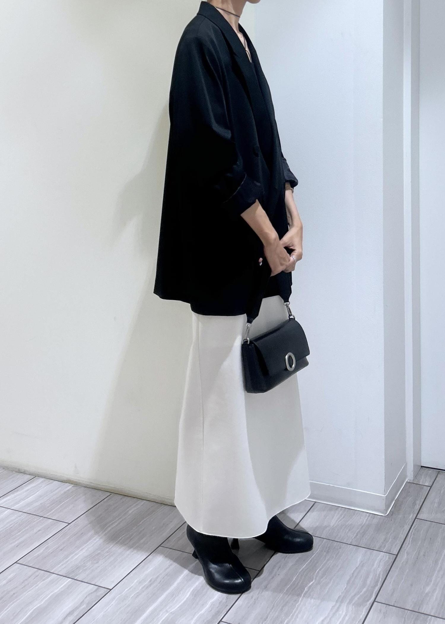 ジャケットの程よいオーバーサイズと、すっきりとしたスカートのラインがシックなシーンにもデイリーにも使える着こなしです◎