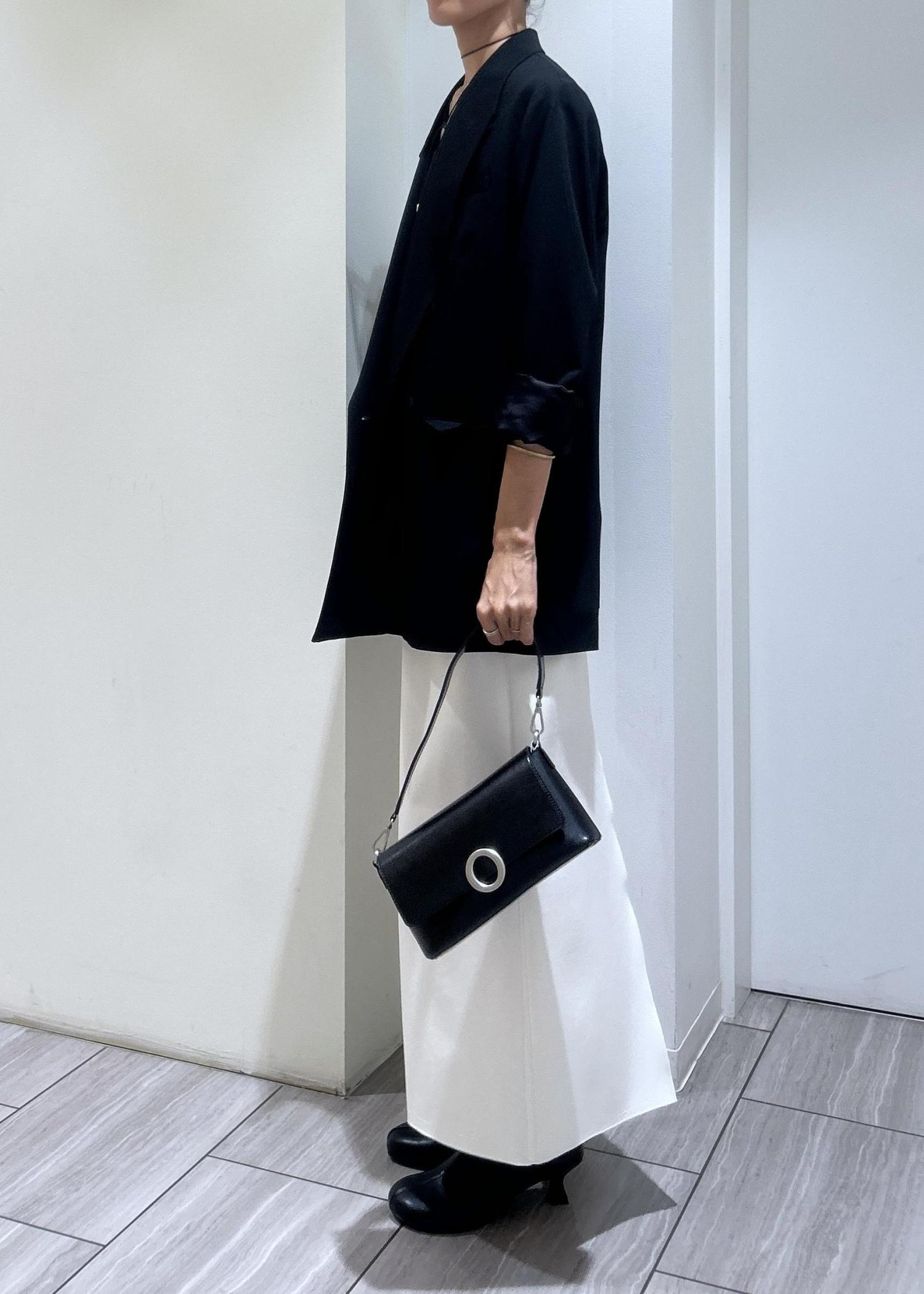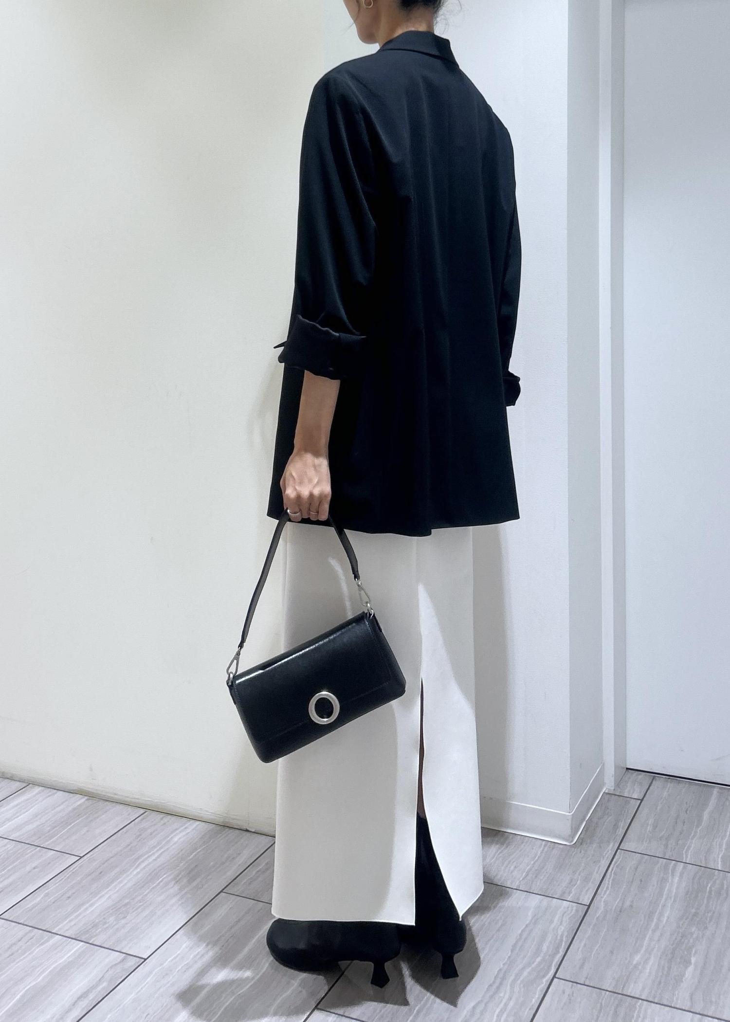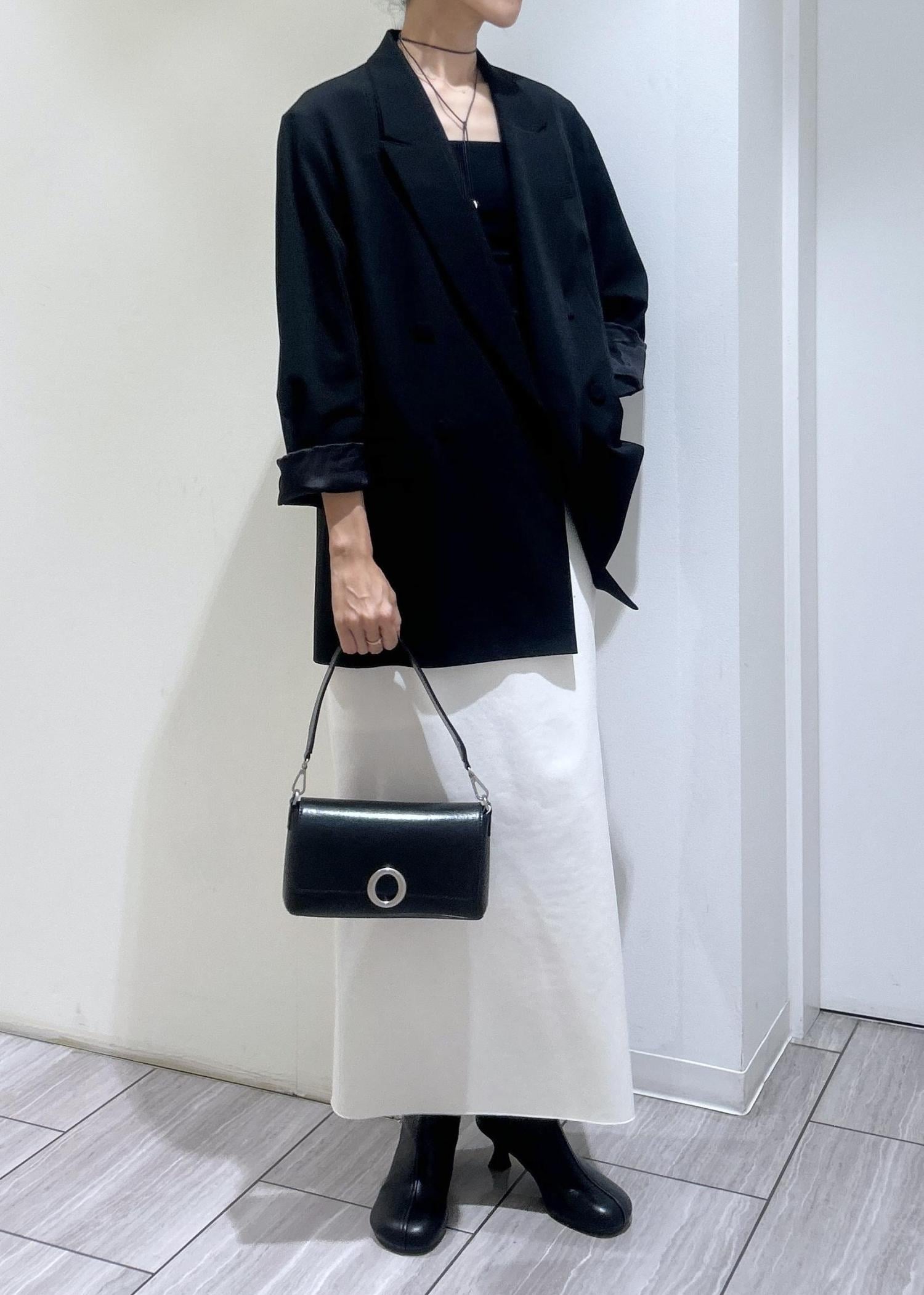 ジャケットの程よいオーバーサイズと、すっきりとしたスカートのラインがシックなシーンにもデイリーにも使える着こなしです◎