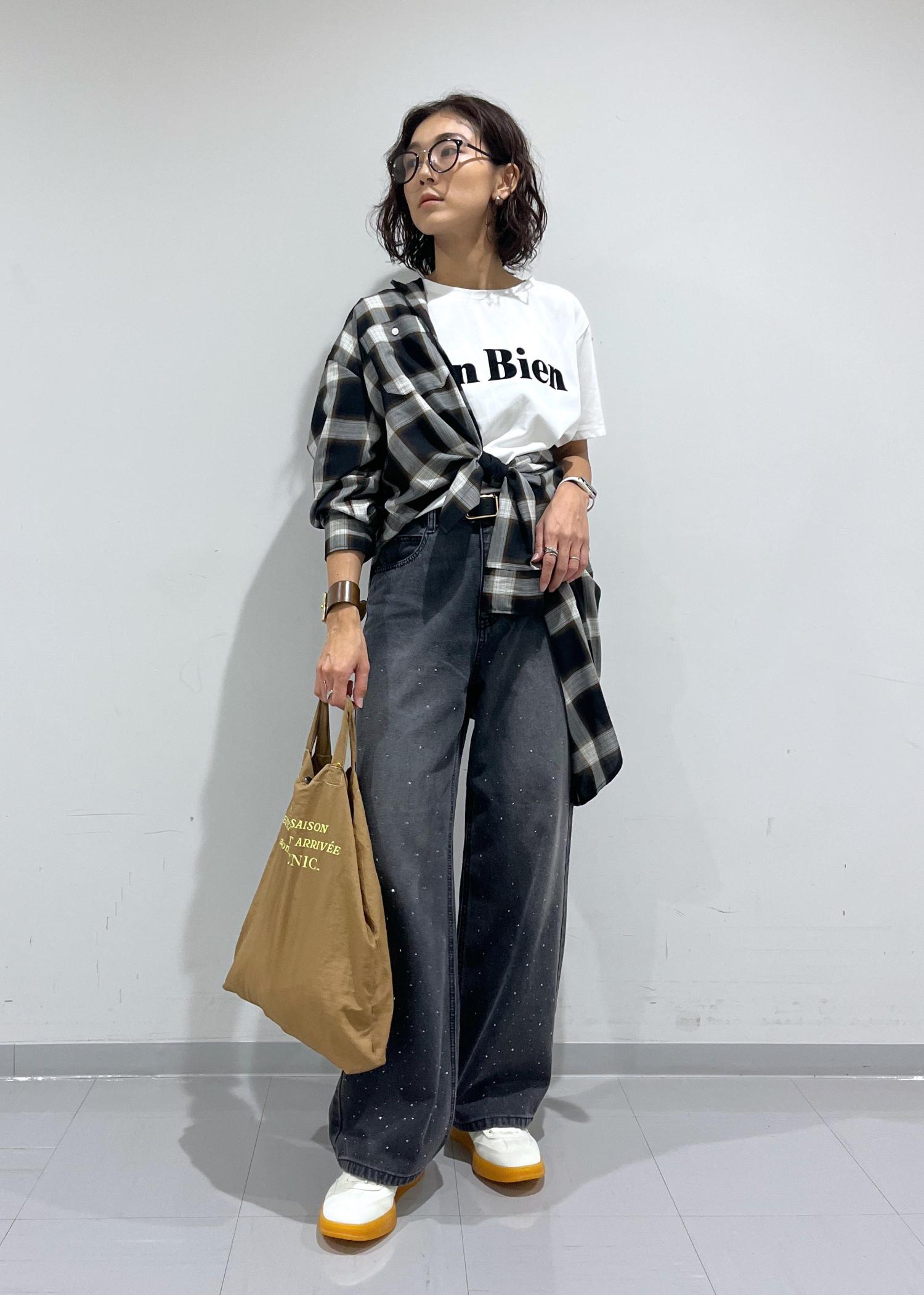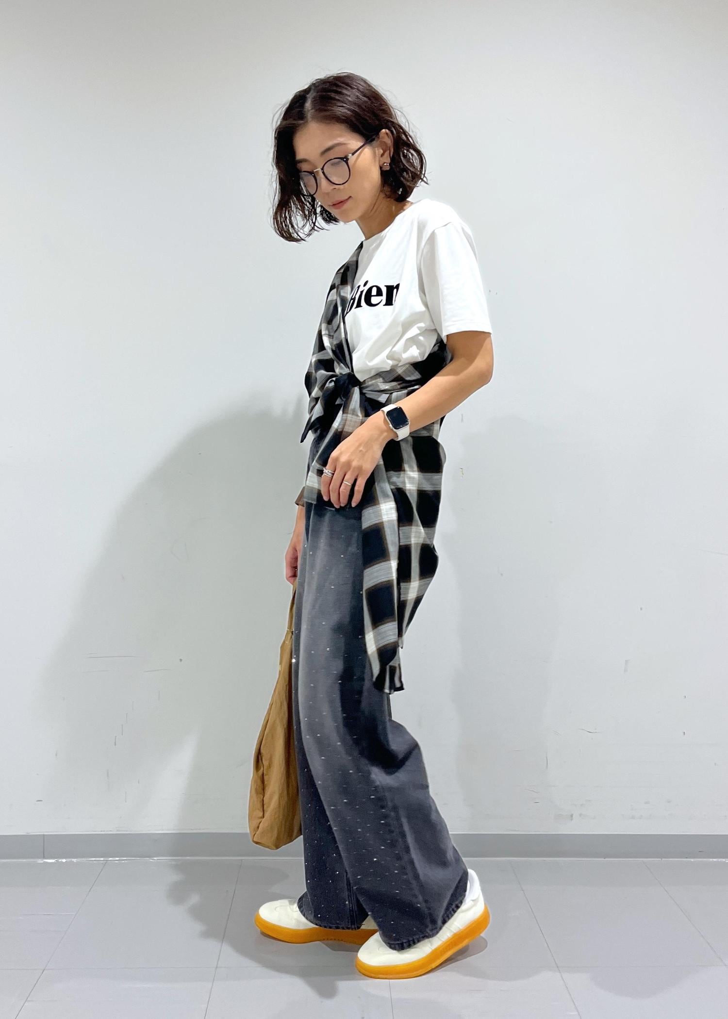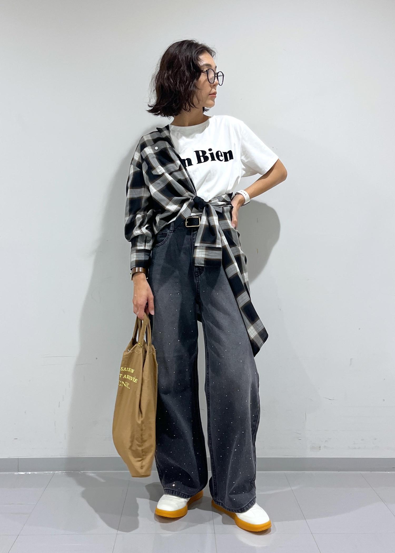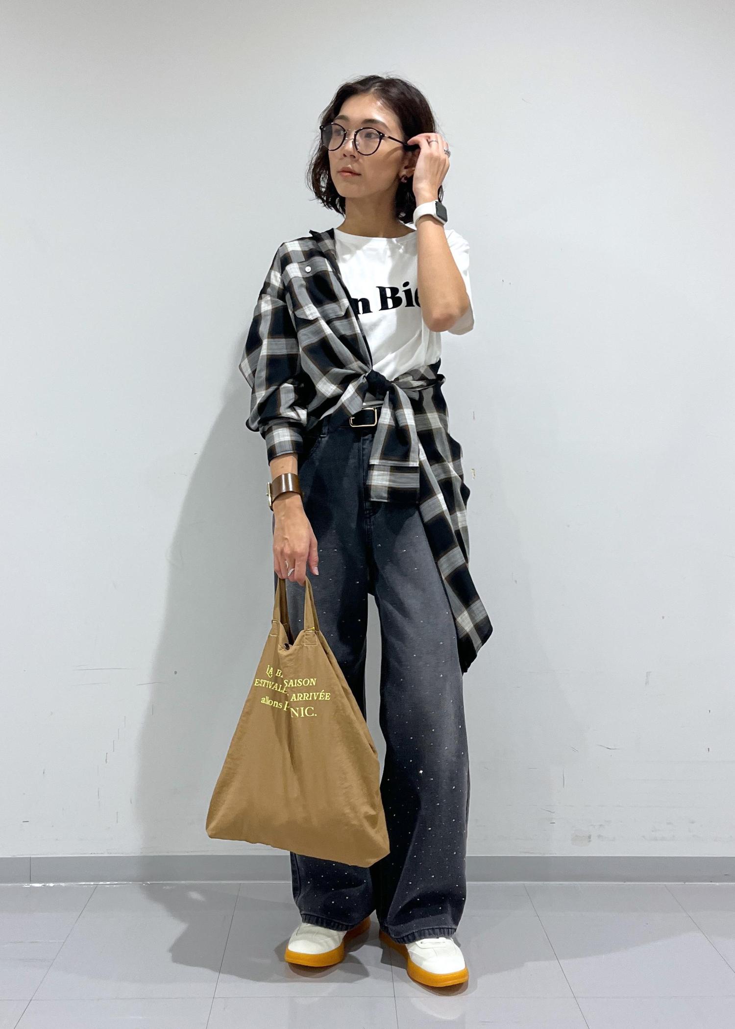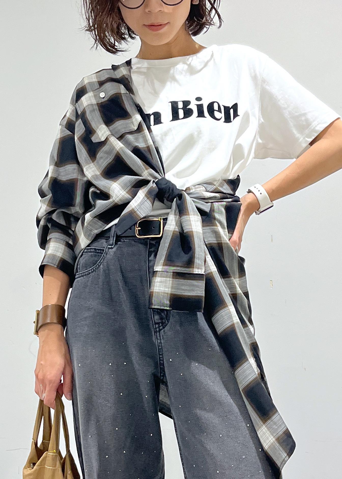 Tシャツ、デニム、チェックシャツのシンプルな組み合わせですが、シャツのアレンジで鮮度UP。