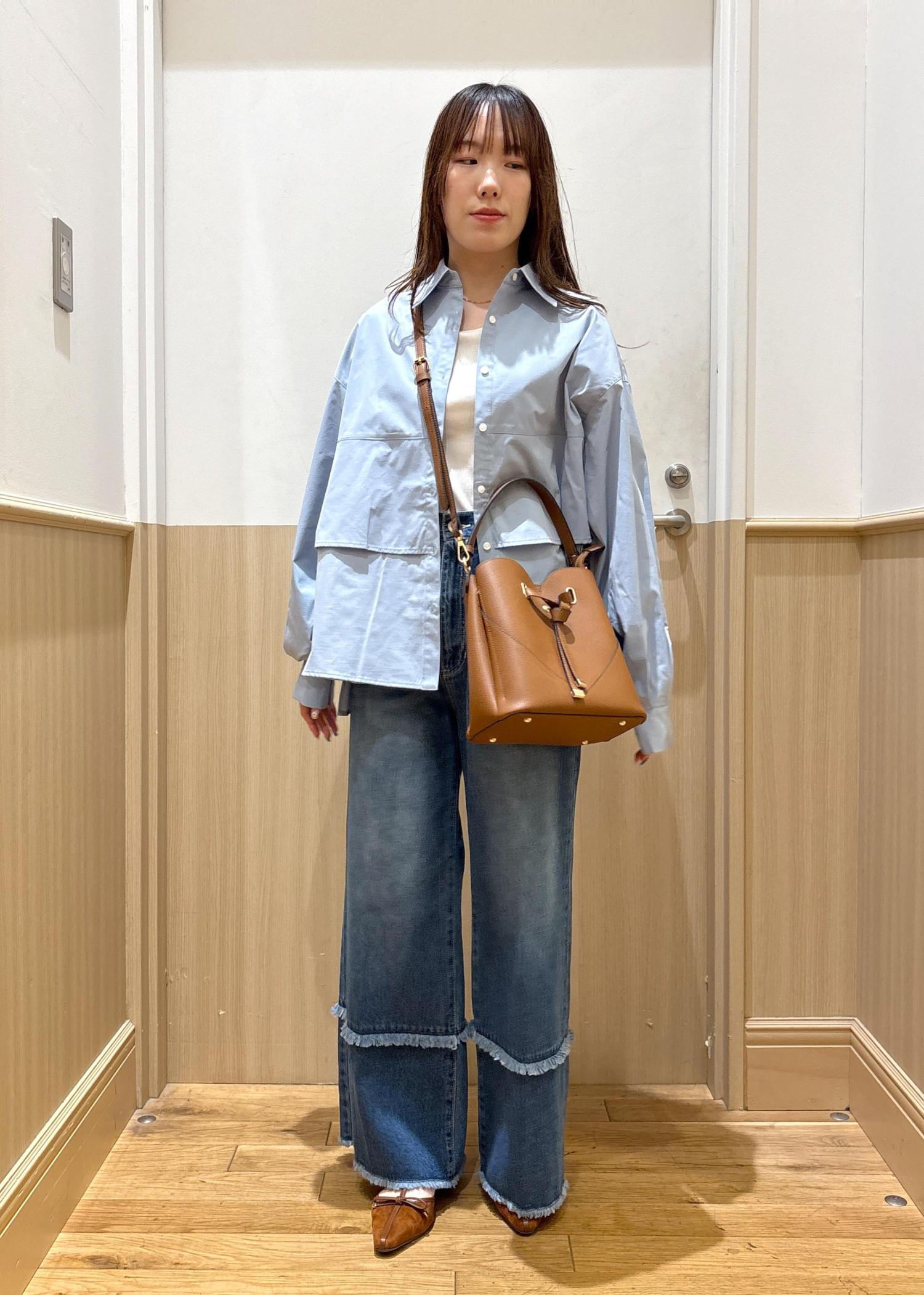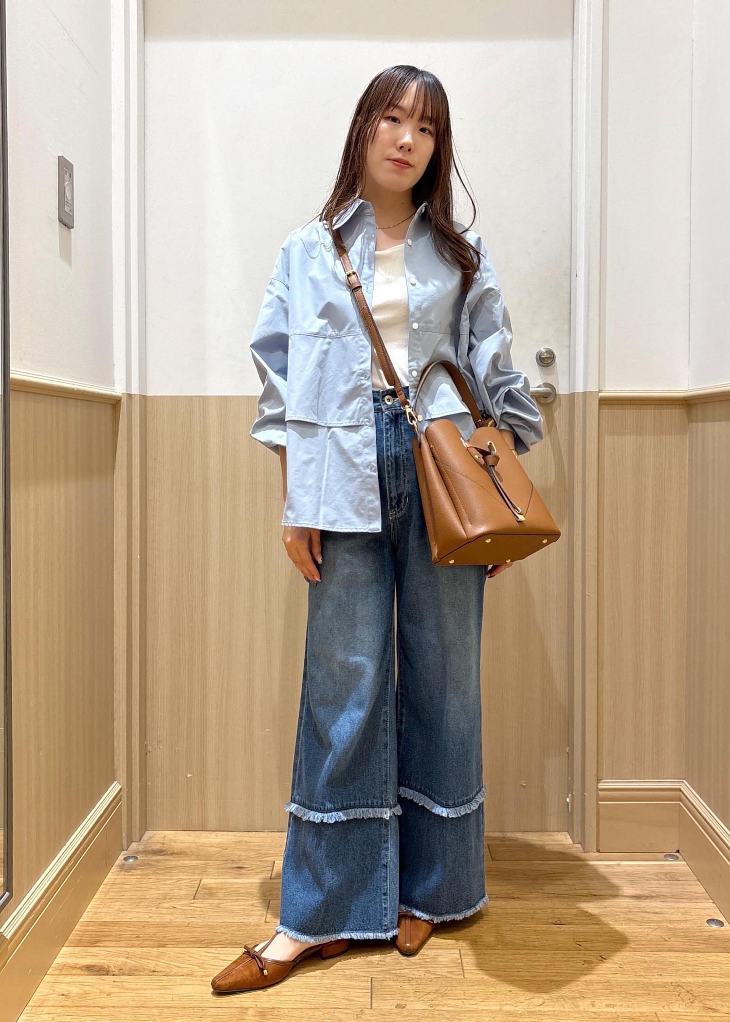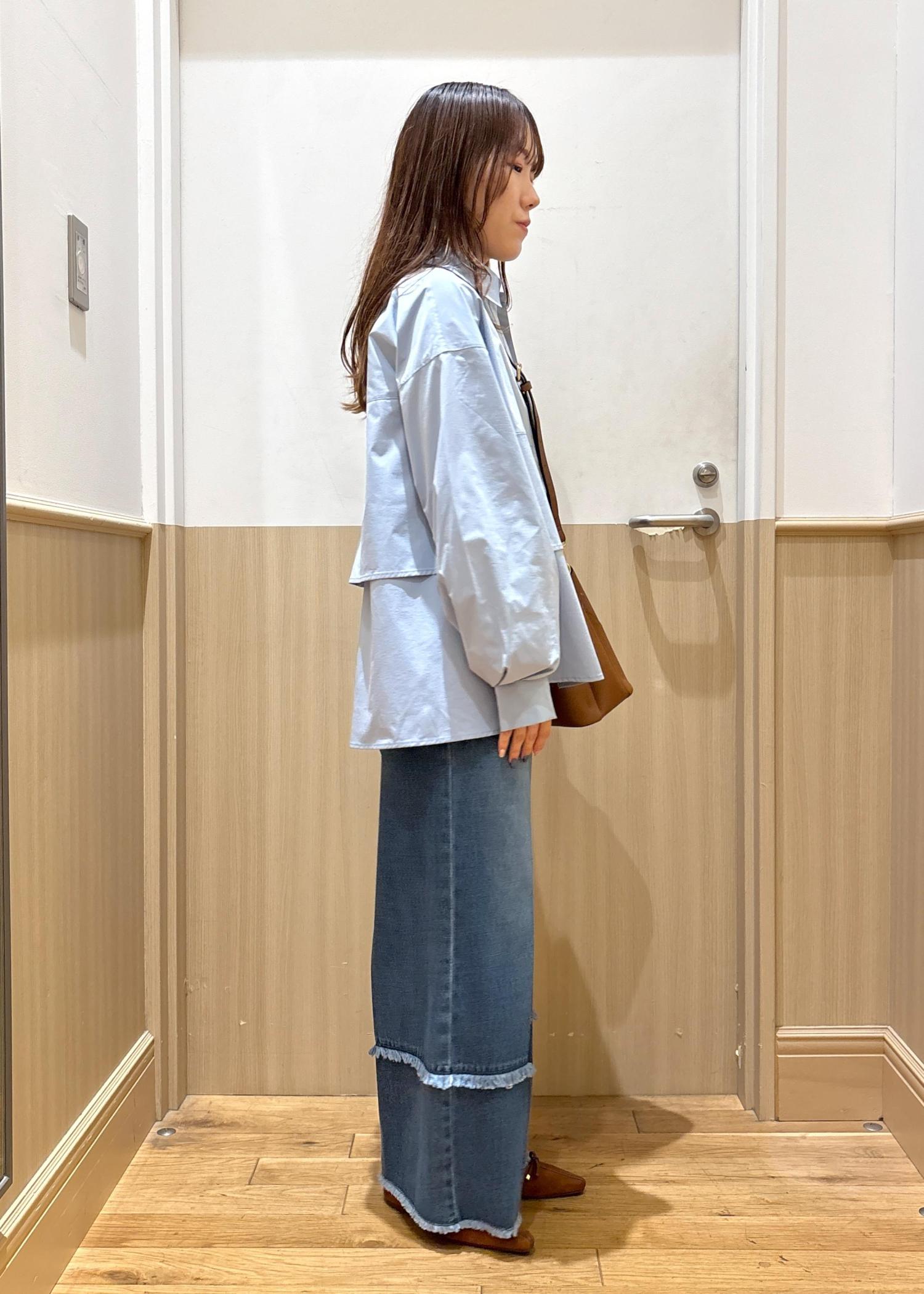 VIS裾ティアードオーバーシャツ/UVケア・イージーケアサックス / F¥3,557レビュー程よいハリ感なので、残暑が残る時期の羽織にも重宝します。