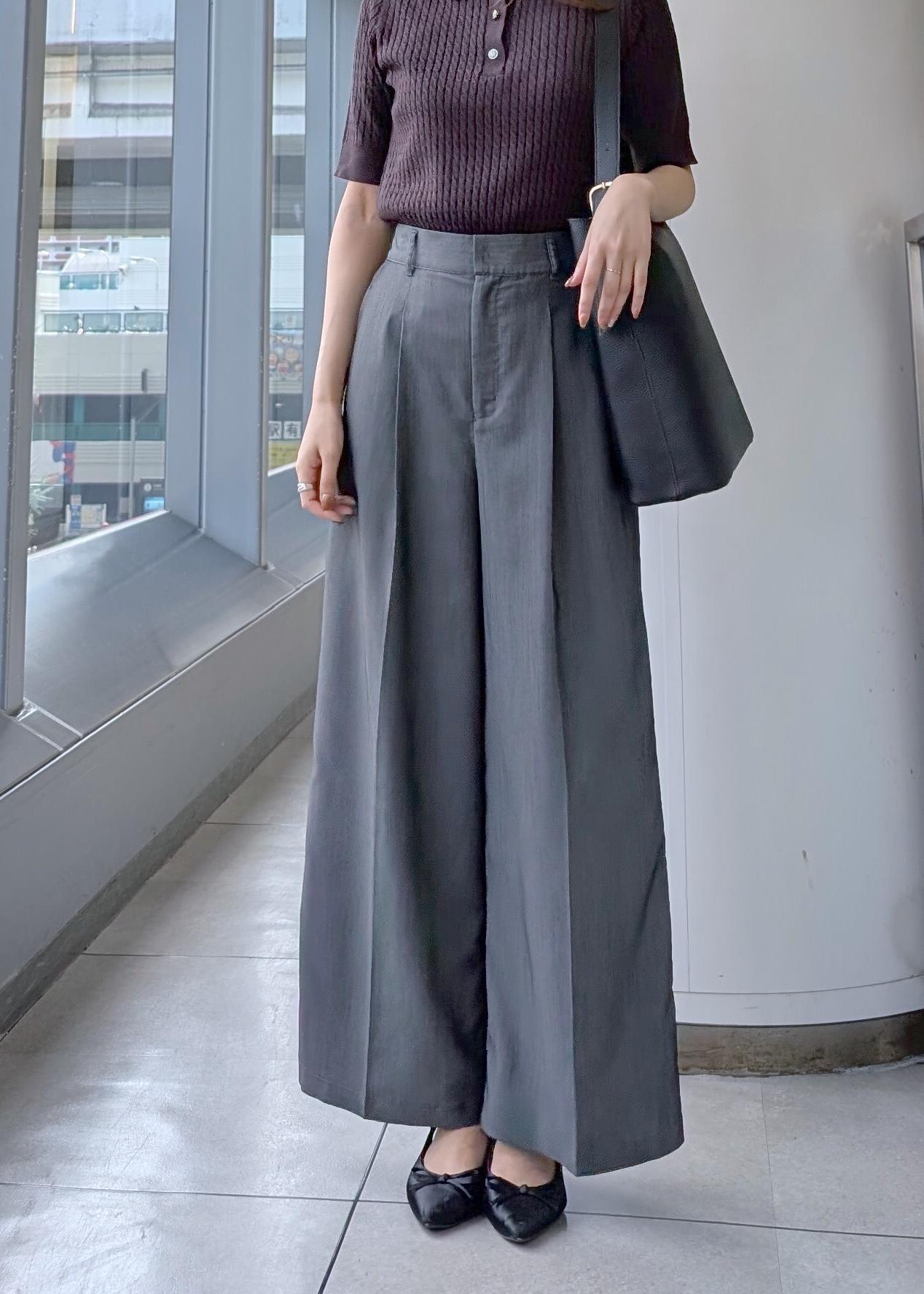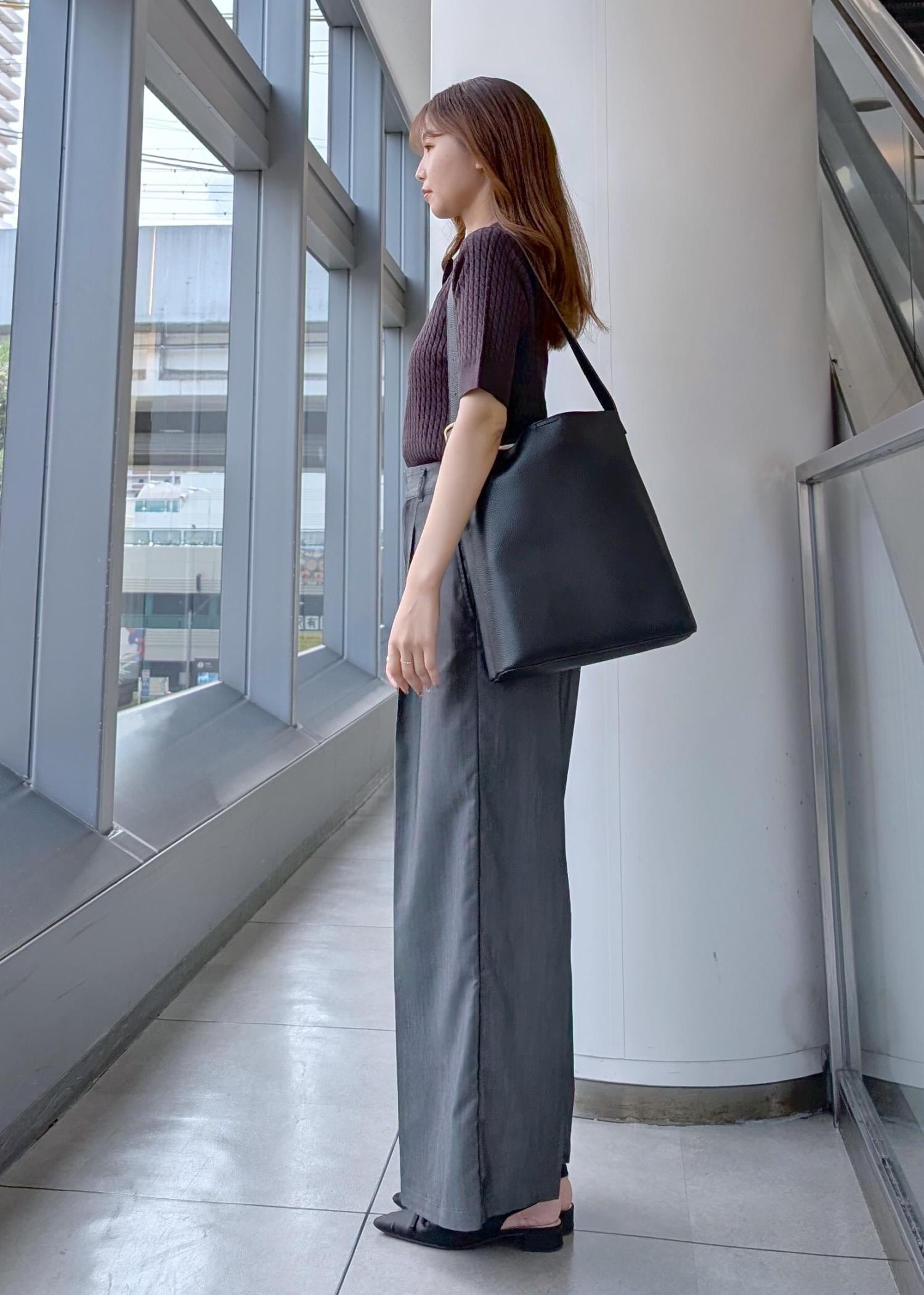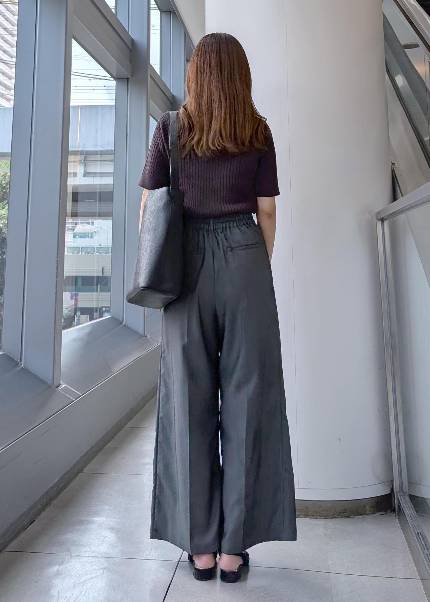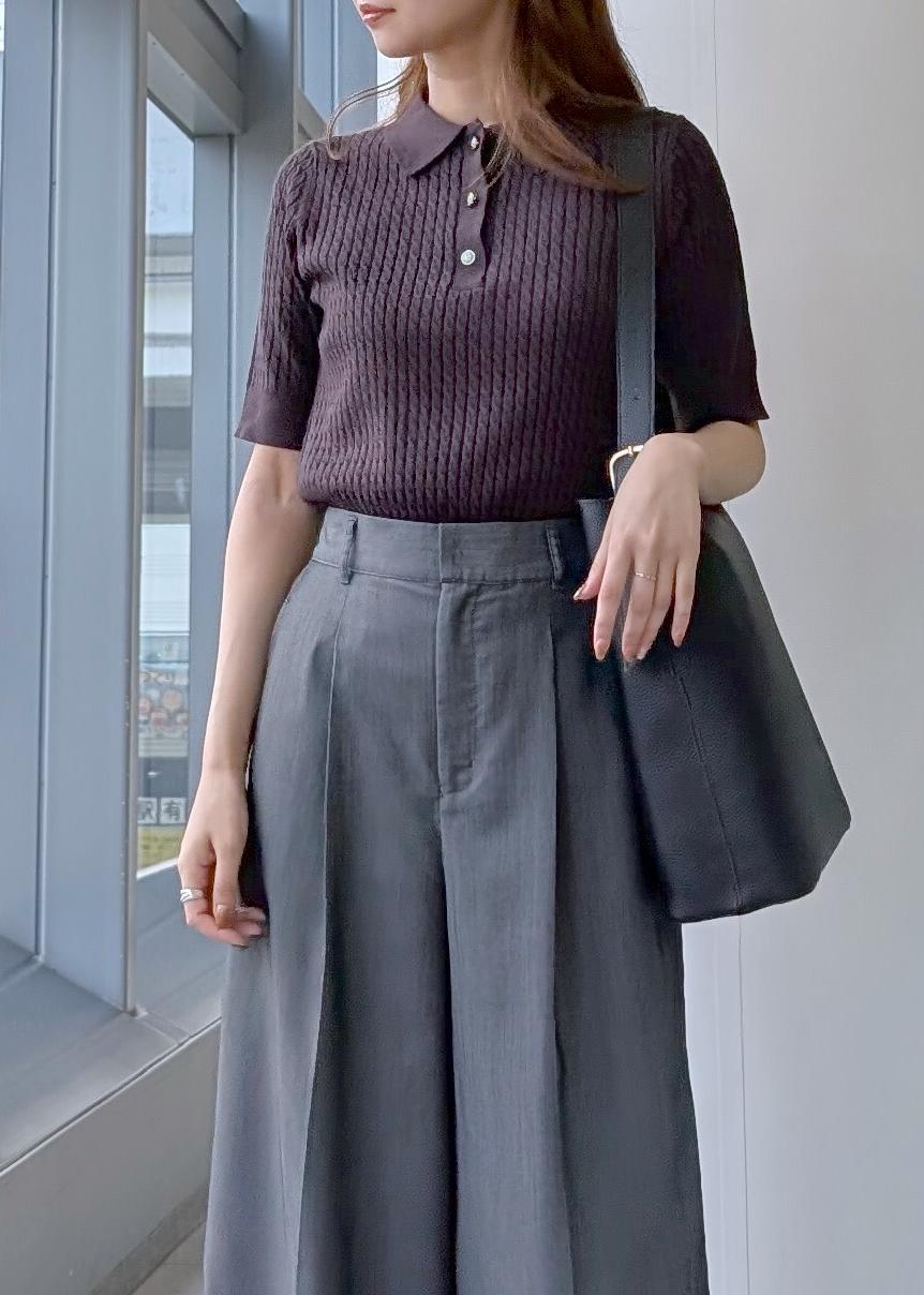襟付きニット×パンツのシンプルなキレイめスタイル。細かめのケーブルニットが秋っぽい雰囲気にしてくれます。生地が柔らかくチクチクしないので敏感肌な私でもストレスなく着用できました。ワイドパンツはサラッとした生地のため暑さが気になる時期におすすめです。