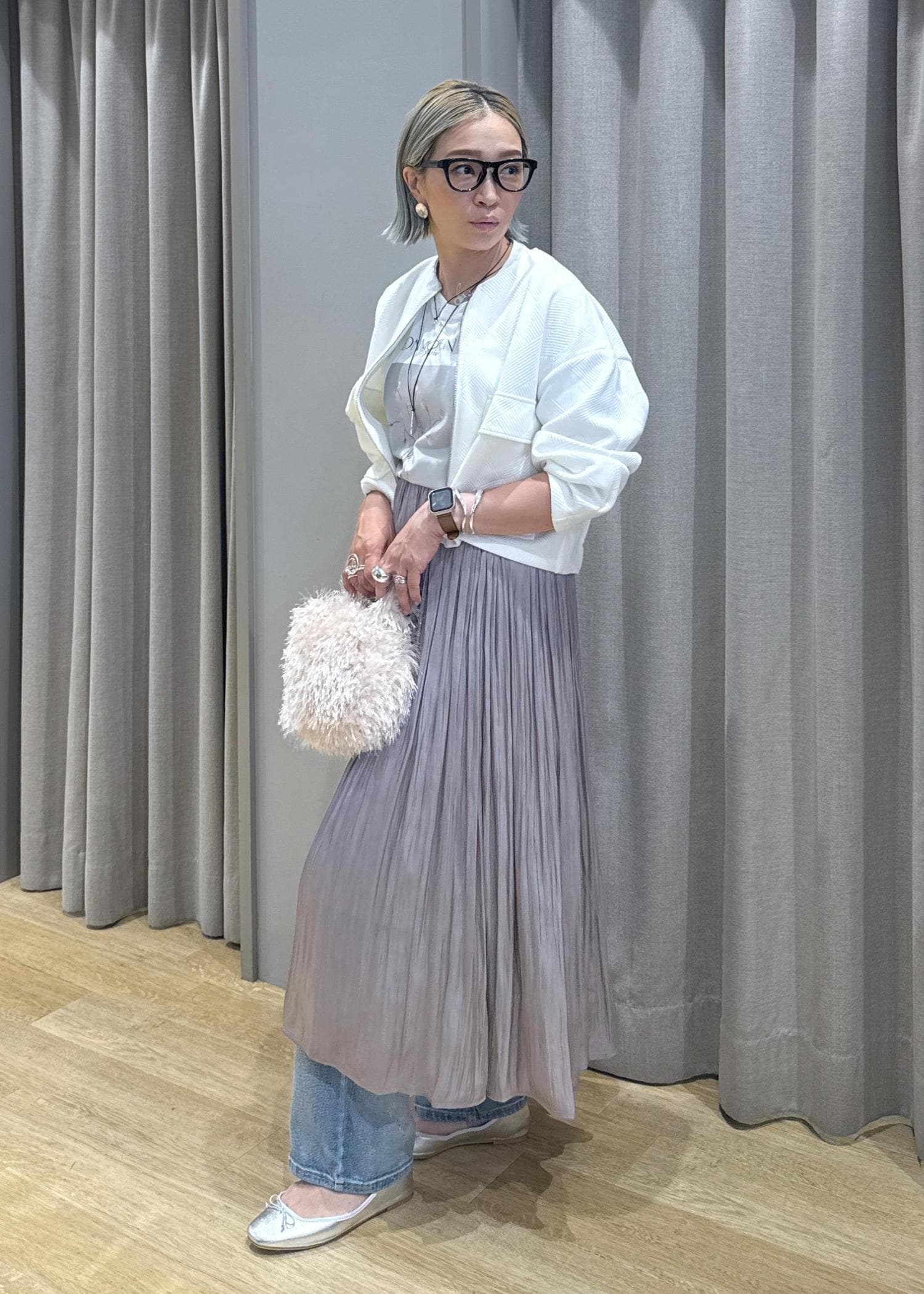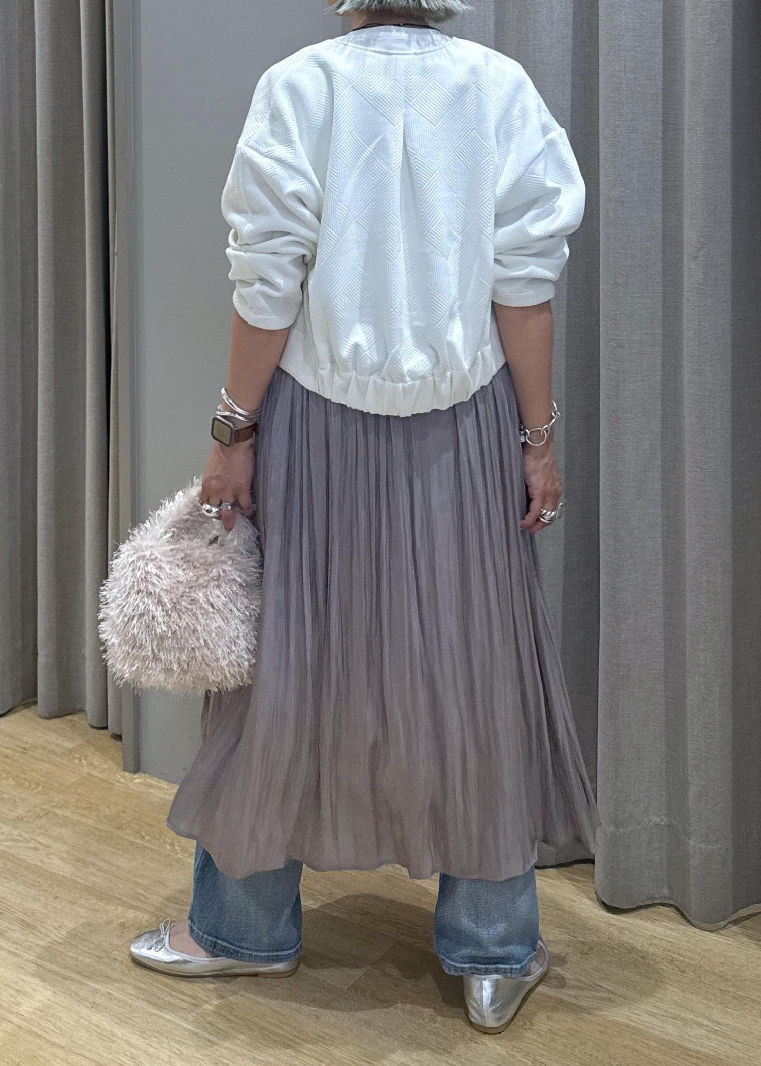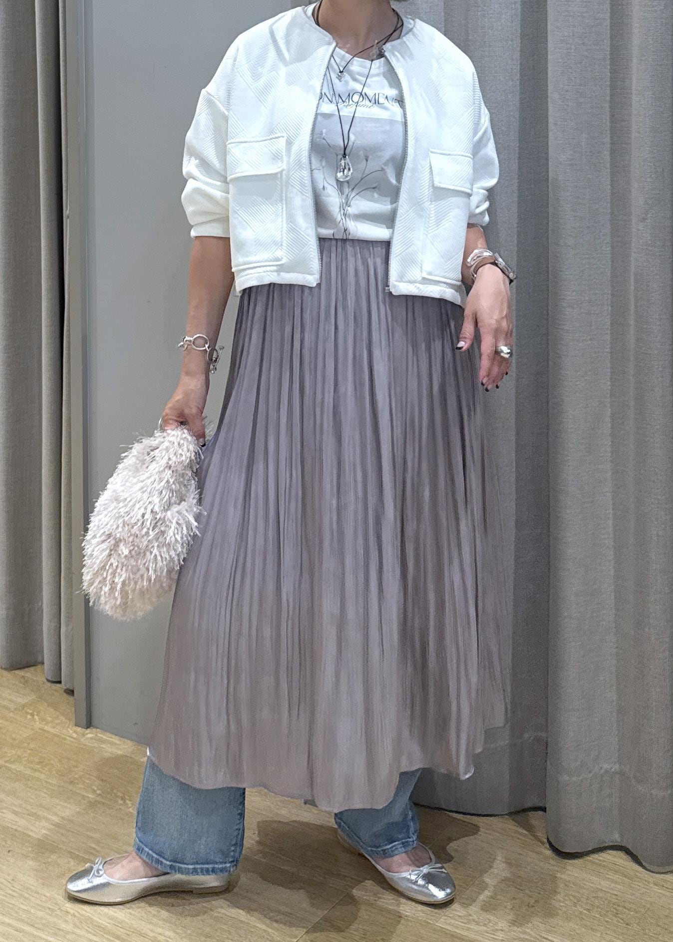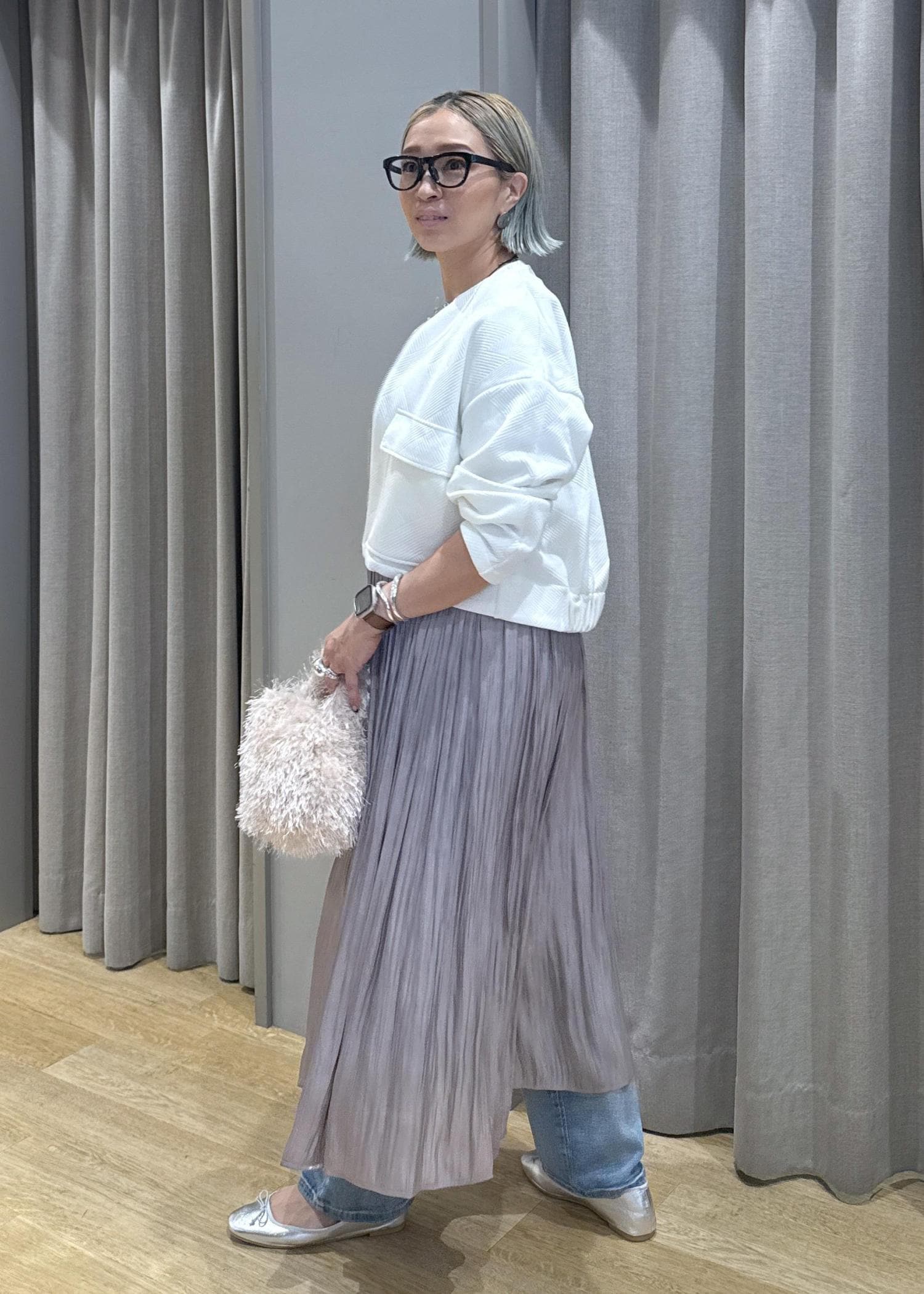 プリーツスカート単体だと、綺麗めになりすぎると思ったので、
