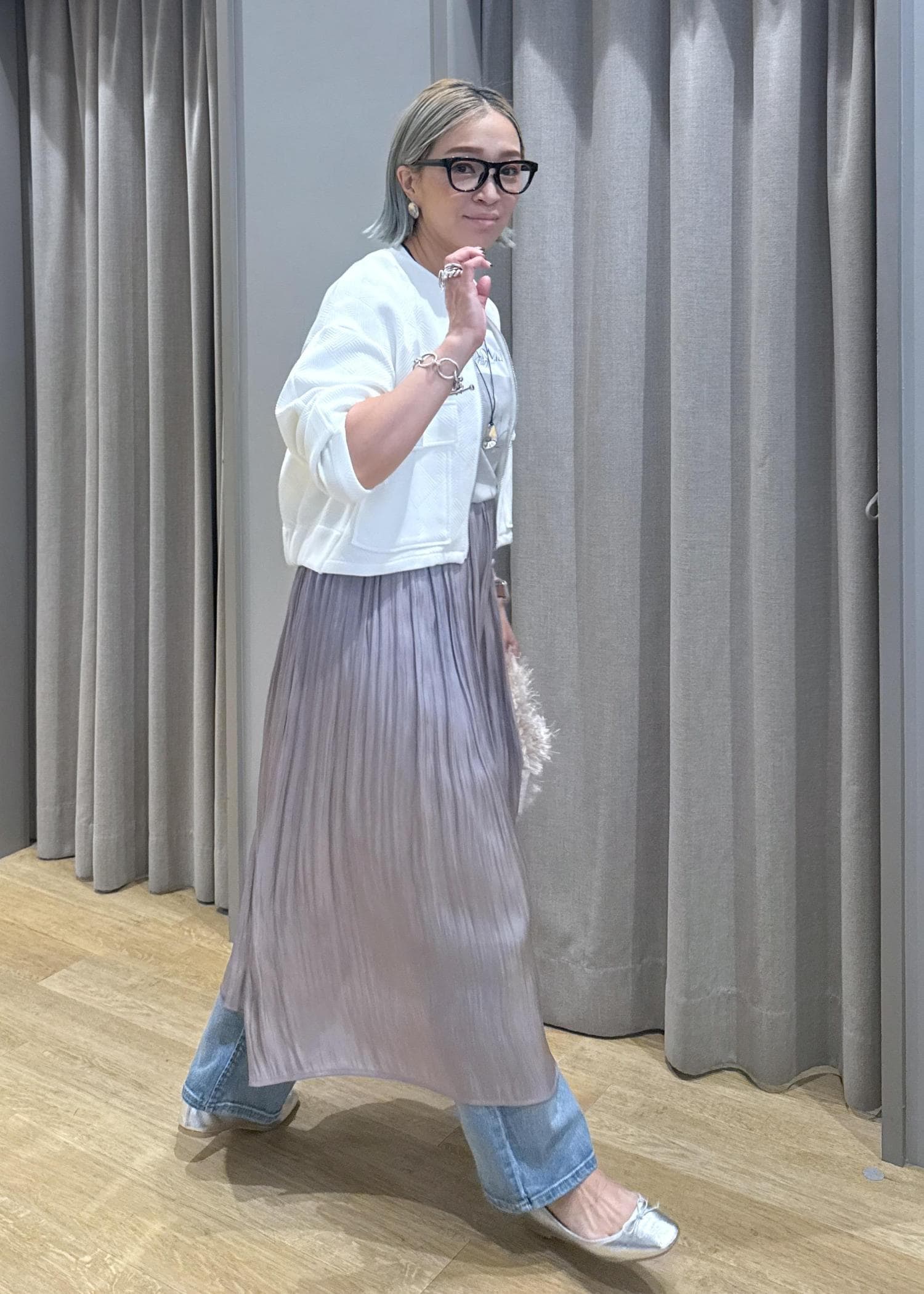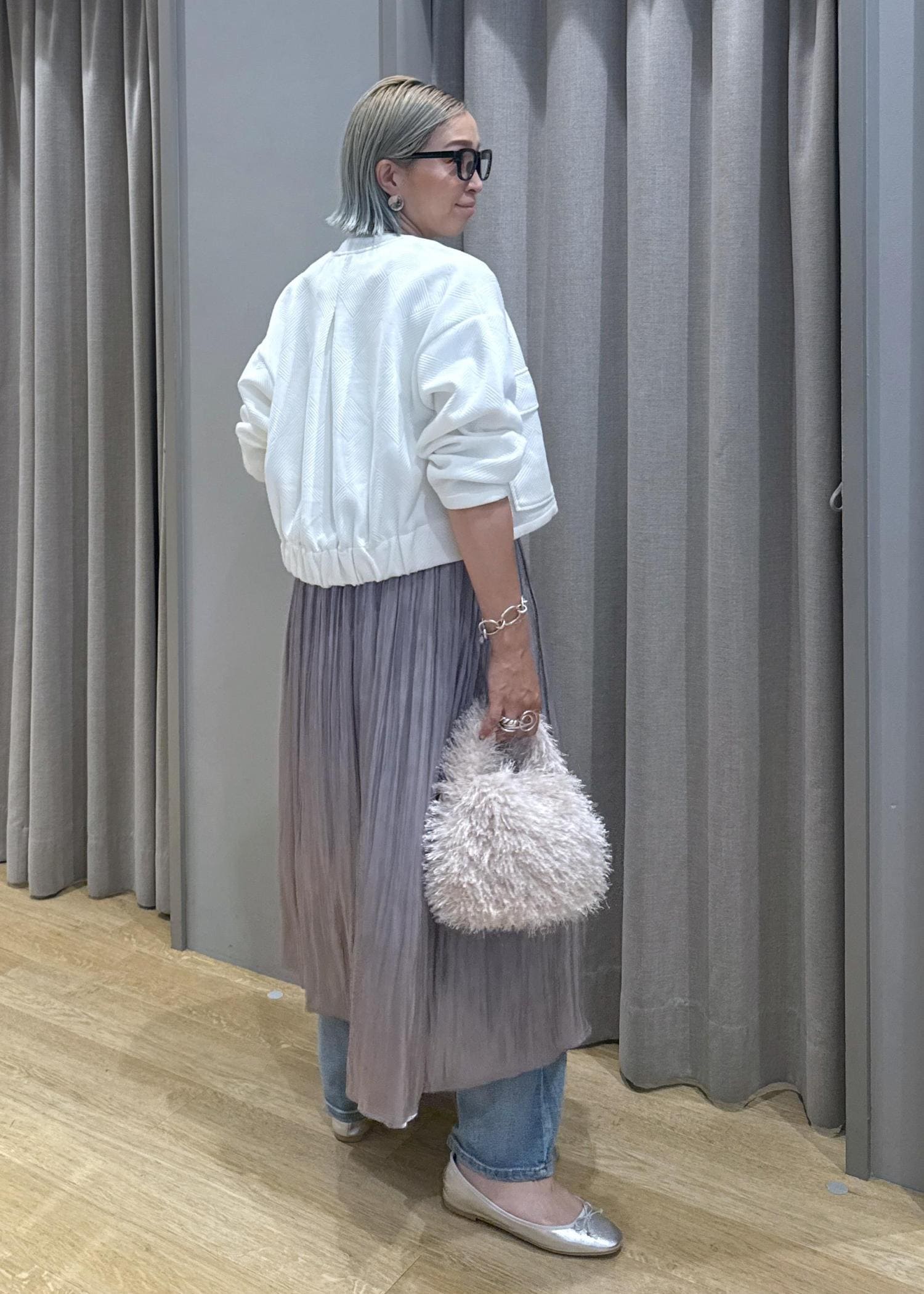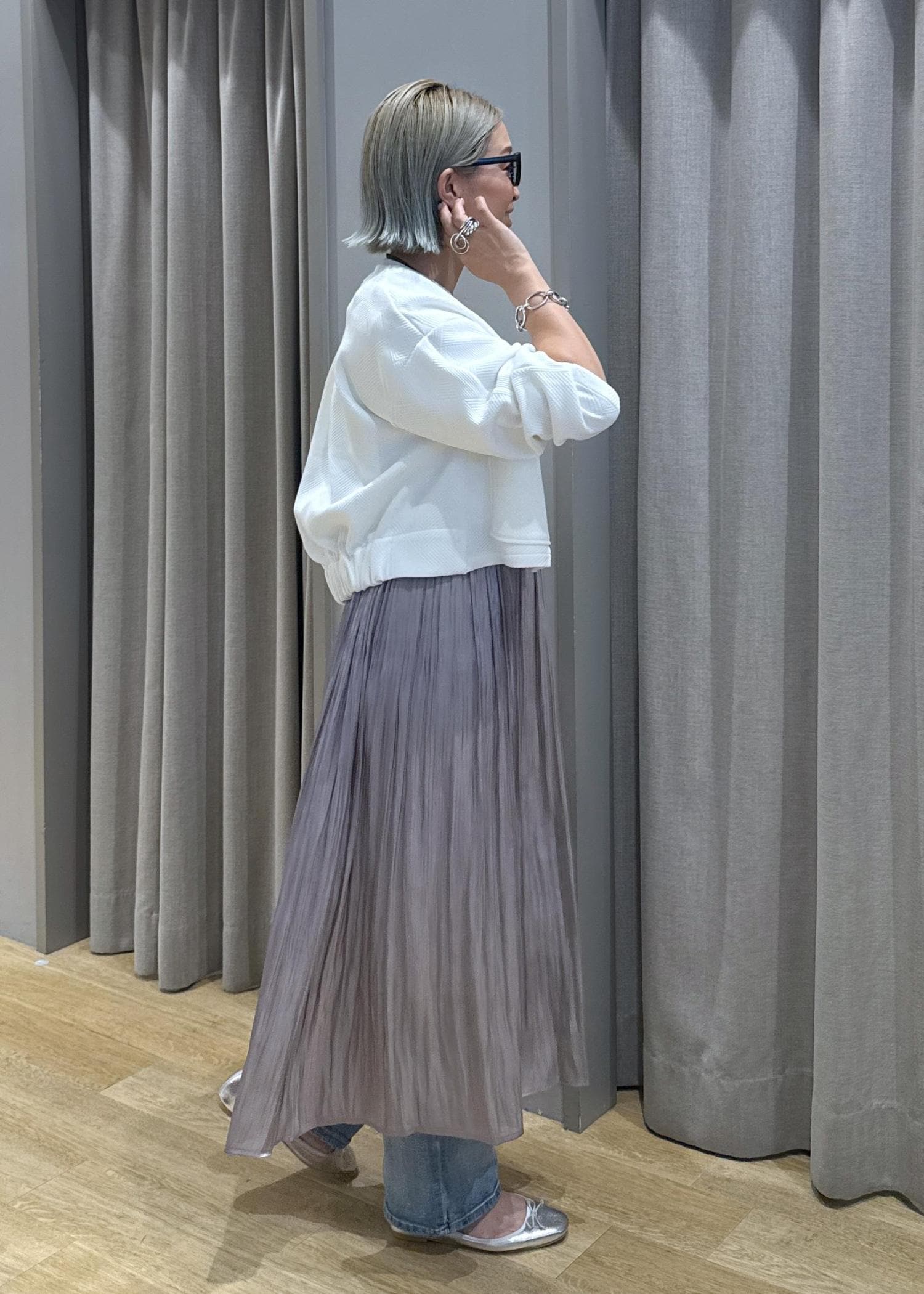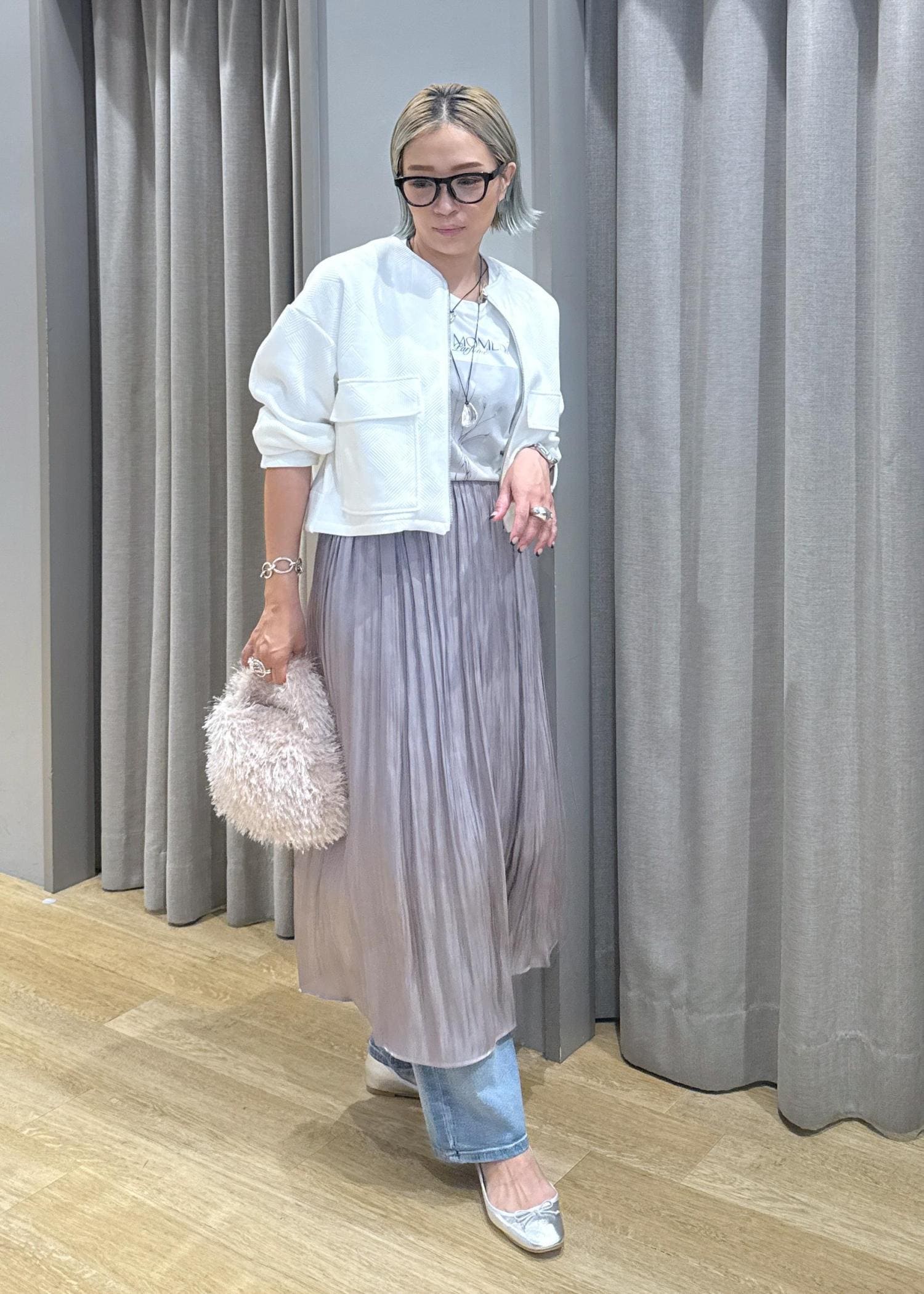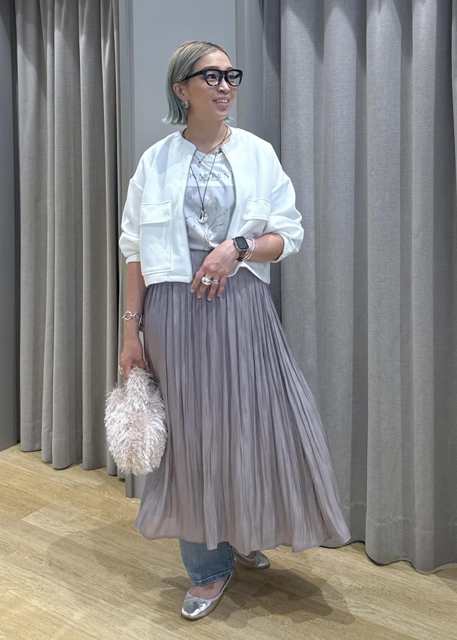 プリーツスカート単体だと、綺麗めになりすぎると思ったので、