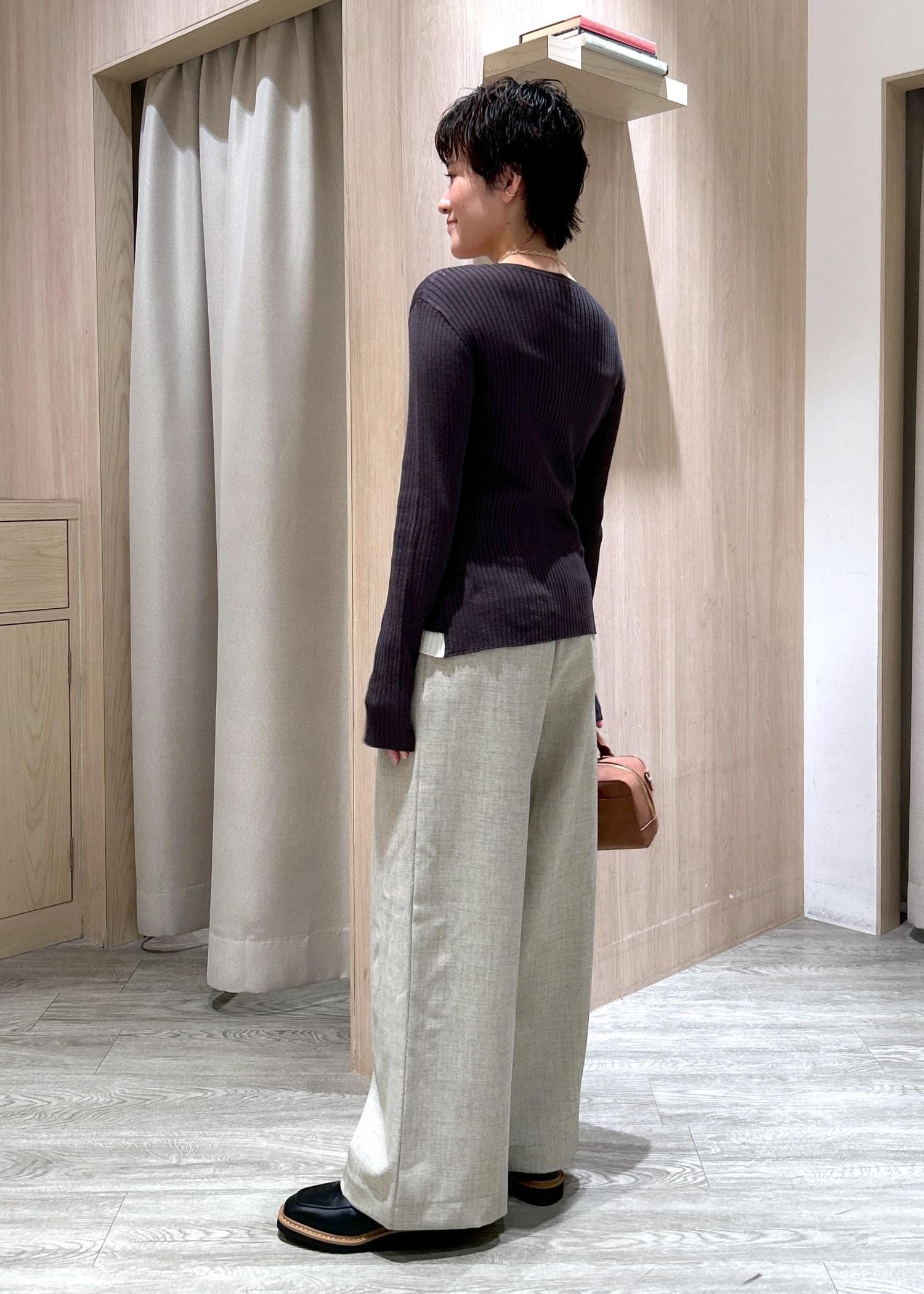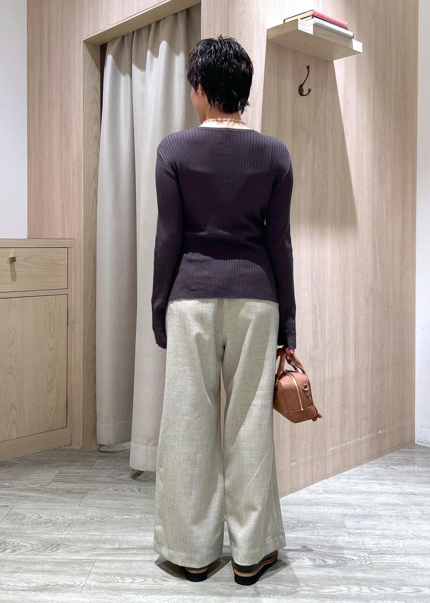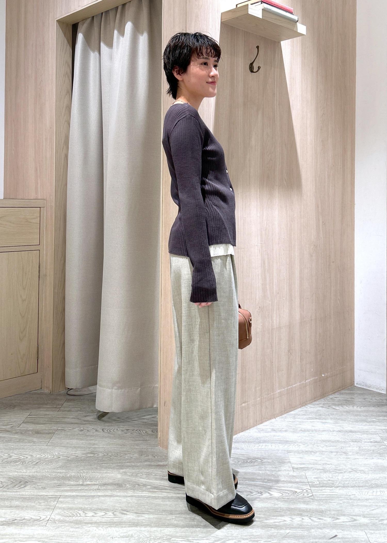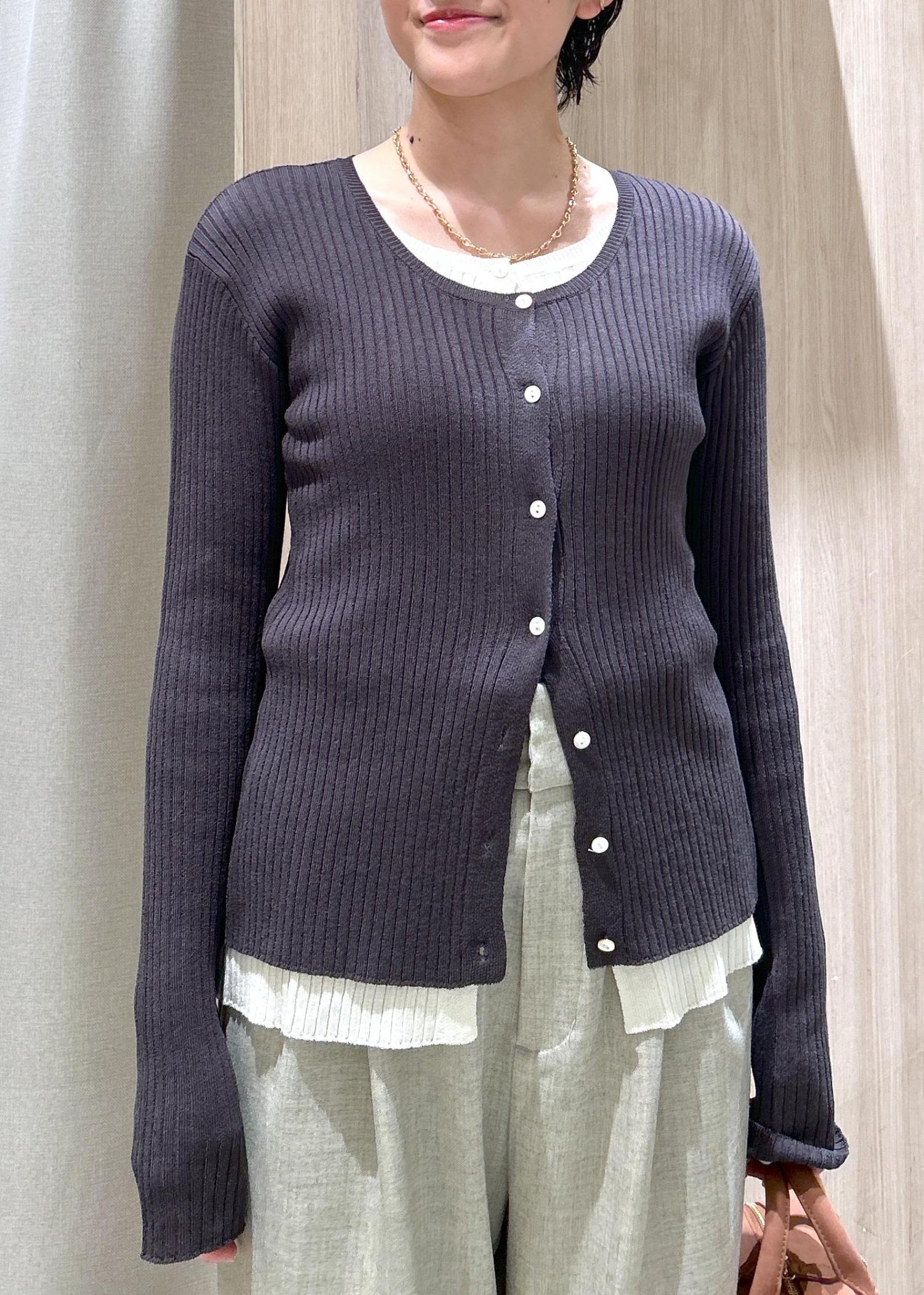 1枚でレイヤードしているように見えるカーディガンで、釦の開け具合を調節できます! -