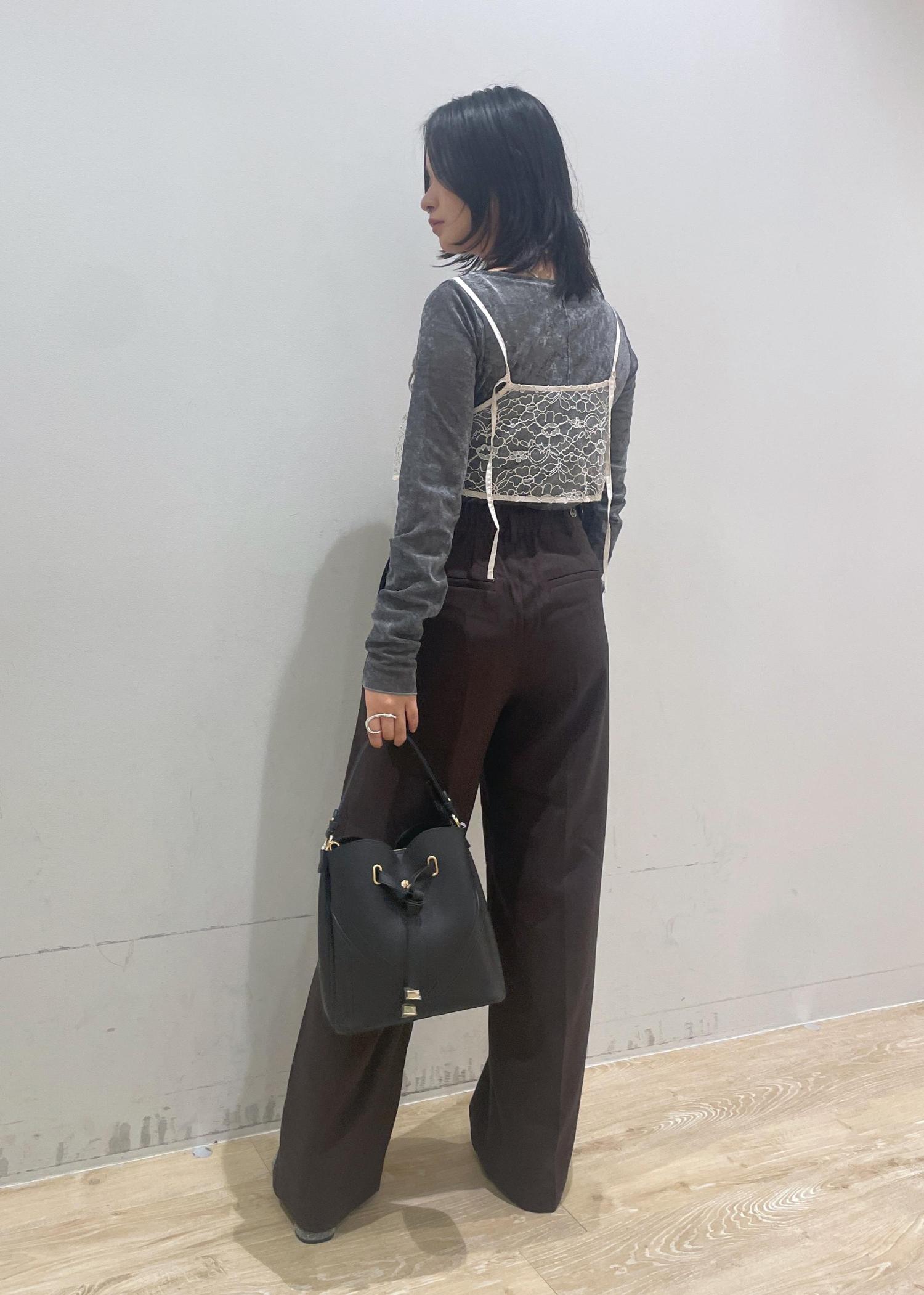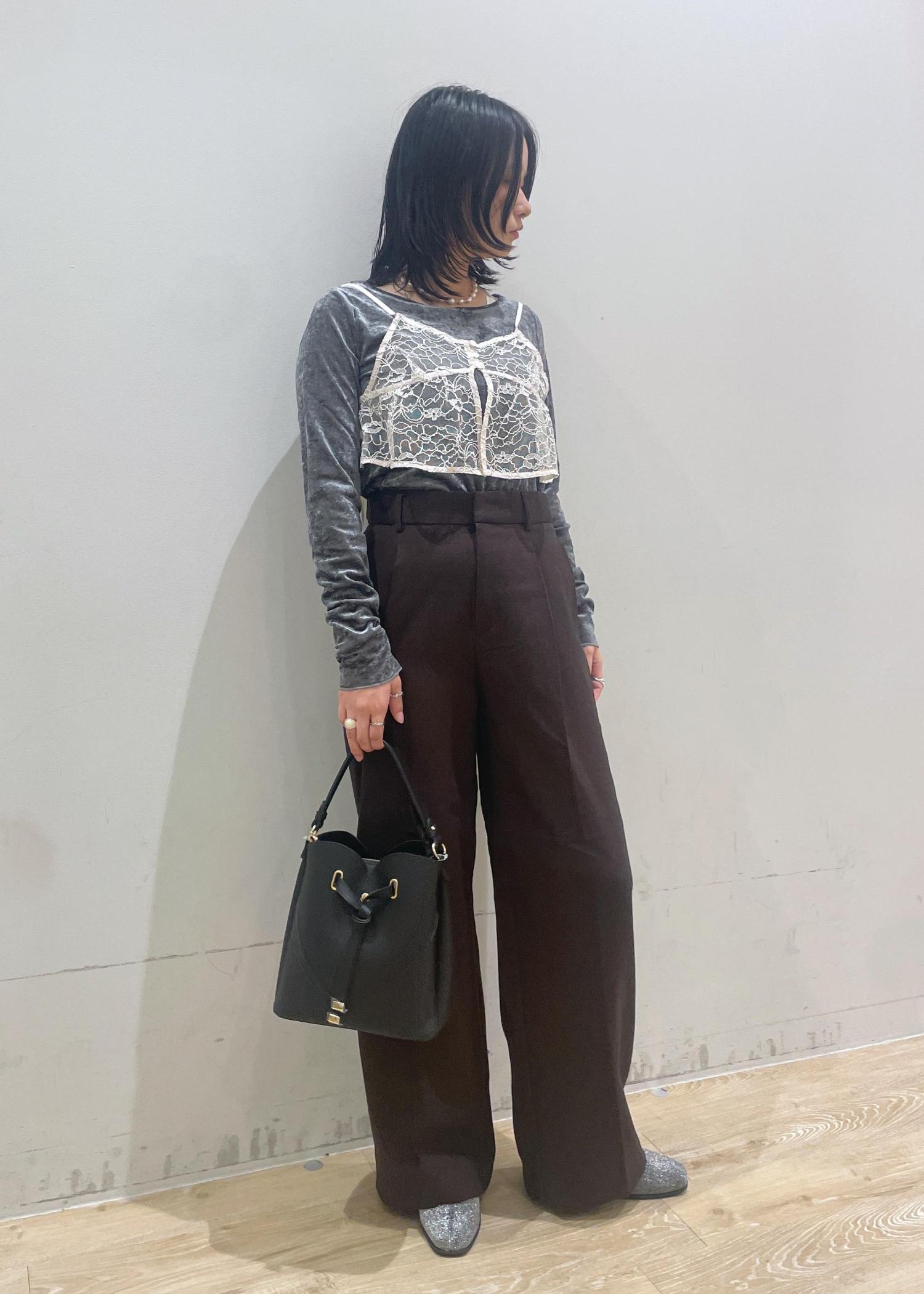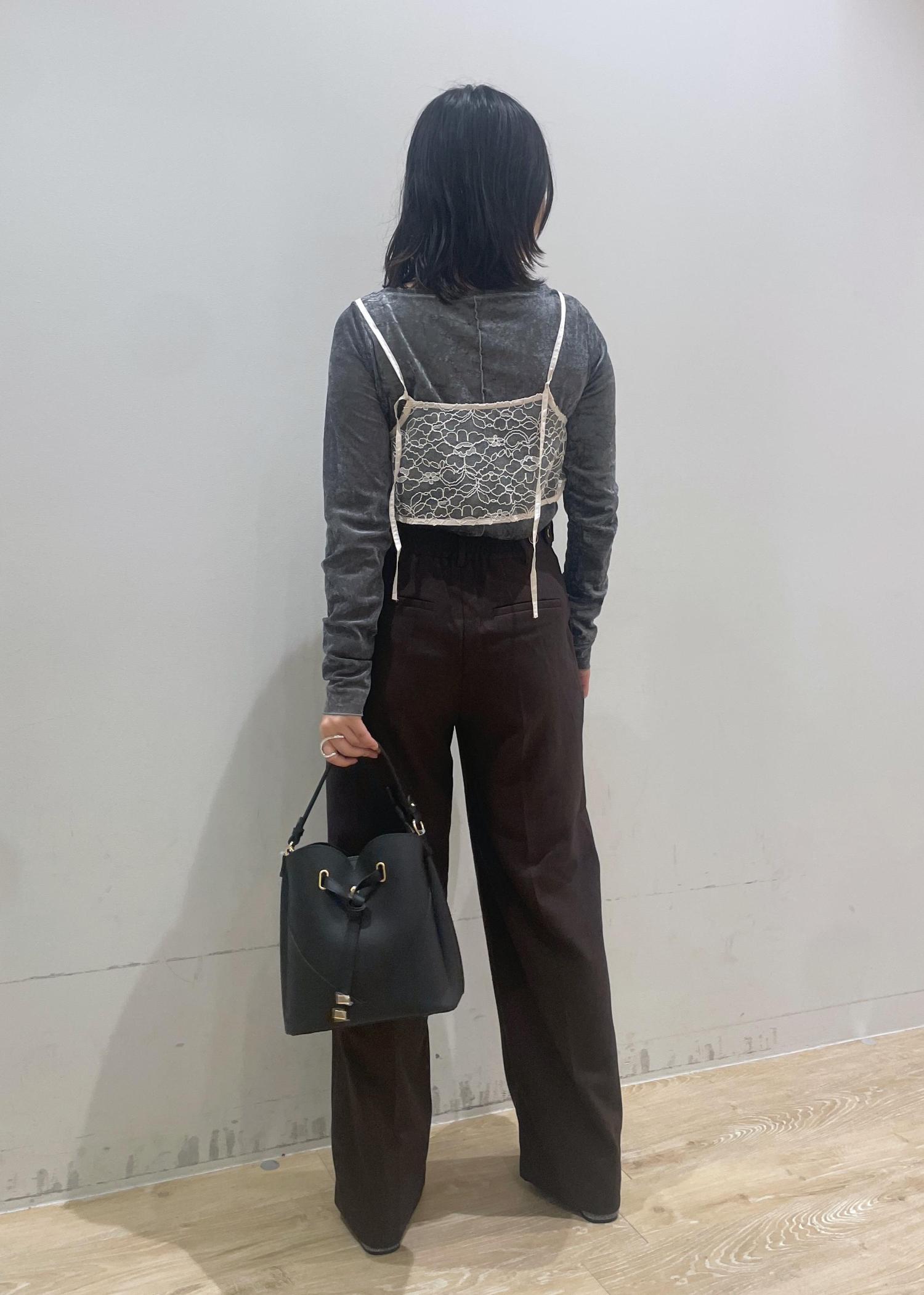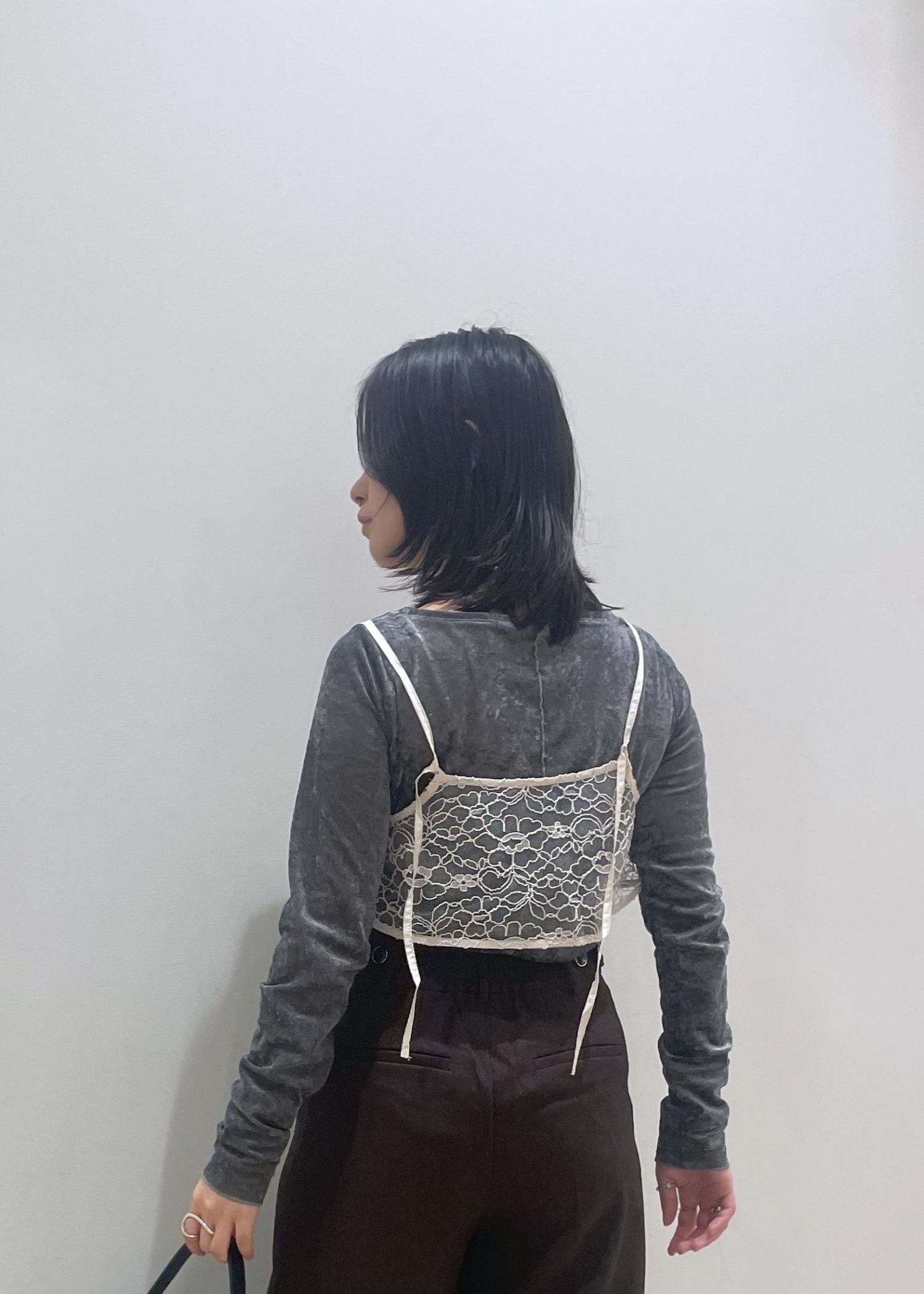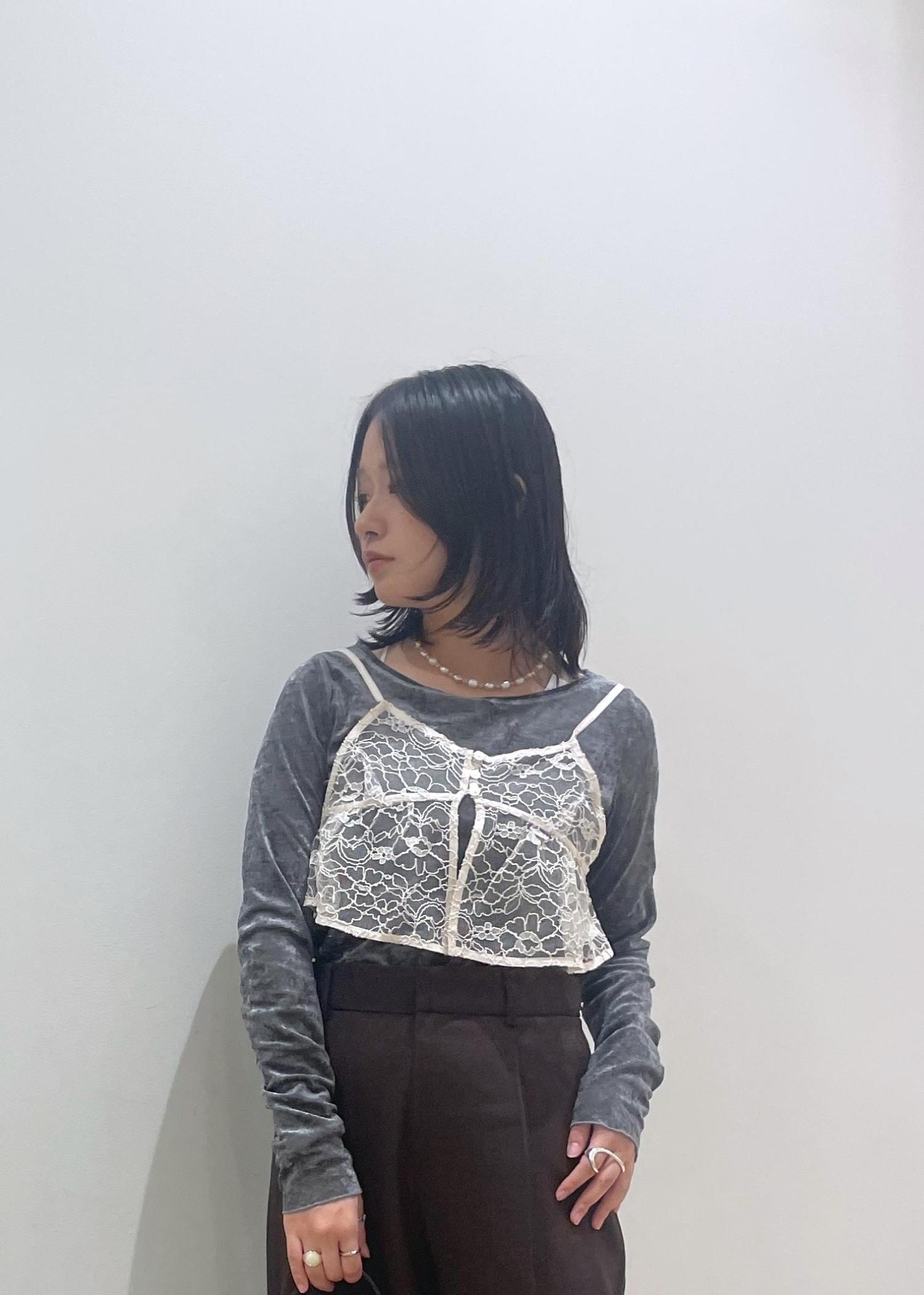 ヴィンテージ感のあるグレーのトップスに、ホワイトレースのキャミを重ねた甘辛ミックススタイルです!!