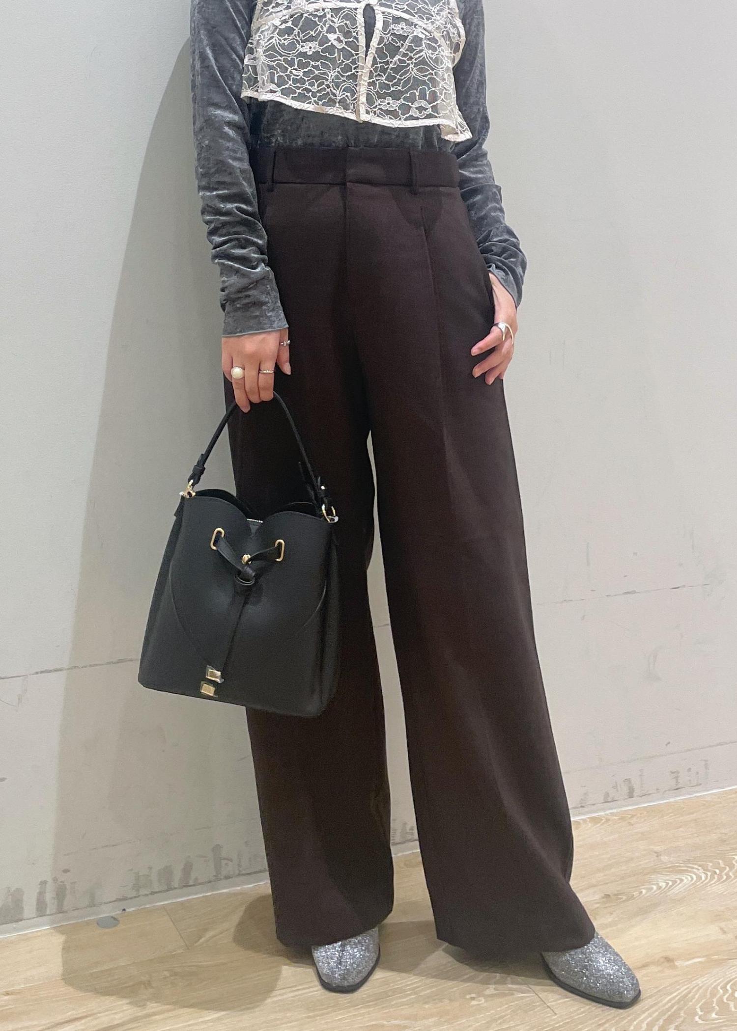 ボトムはダークブラウンで落ち着きを加え、大人っぽさをしっかりキープし、小物や靴の素材感で遊び心を入れた、バランスコーデです!!