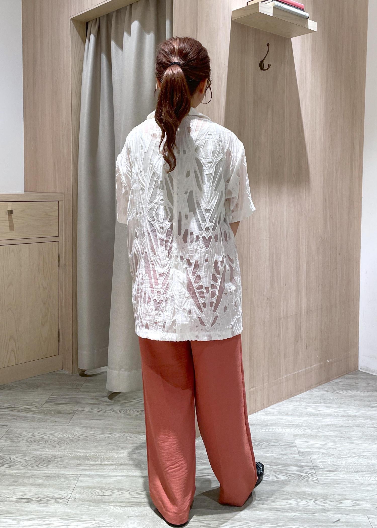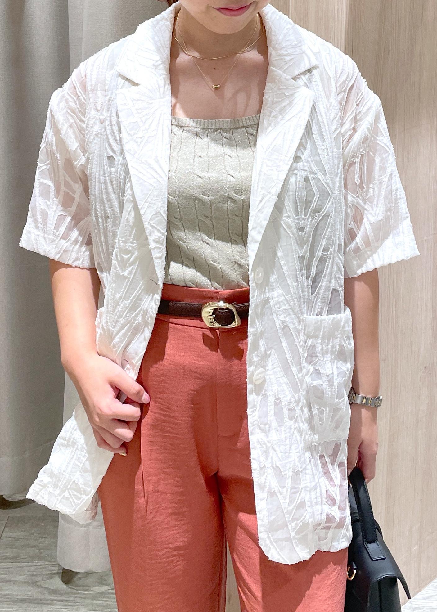 パキッとしたオレンジのカラーパンツにシアー素材のジャケットを合わせたキレイめコーデです♪