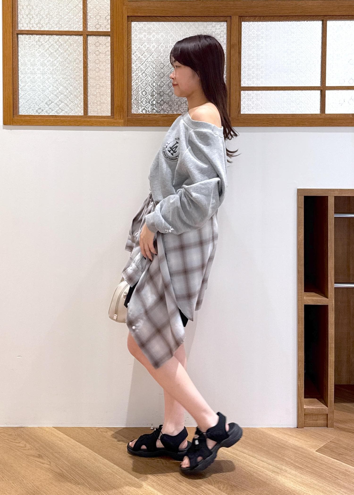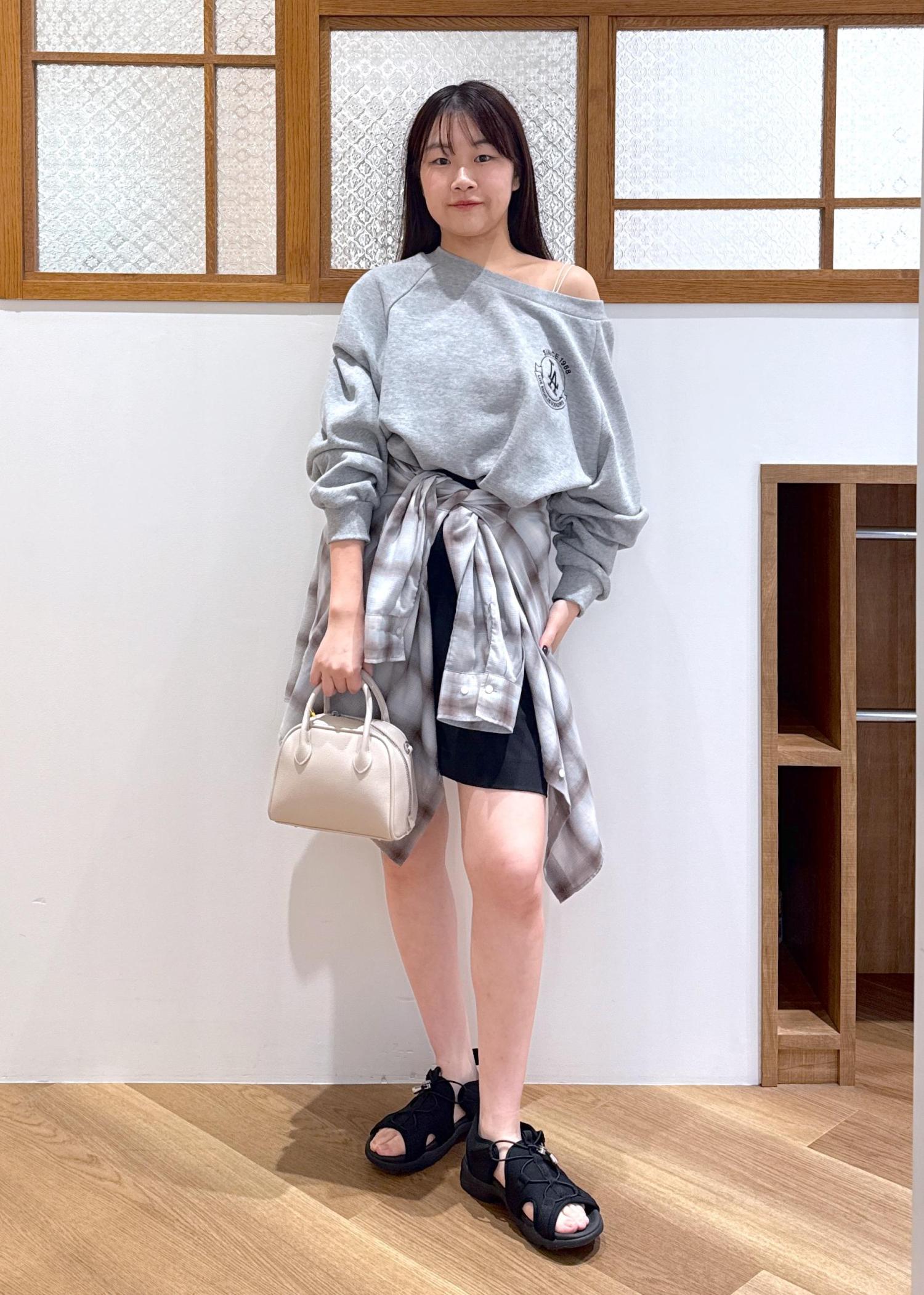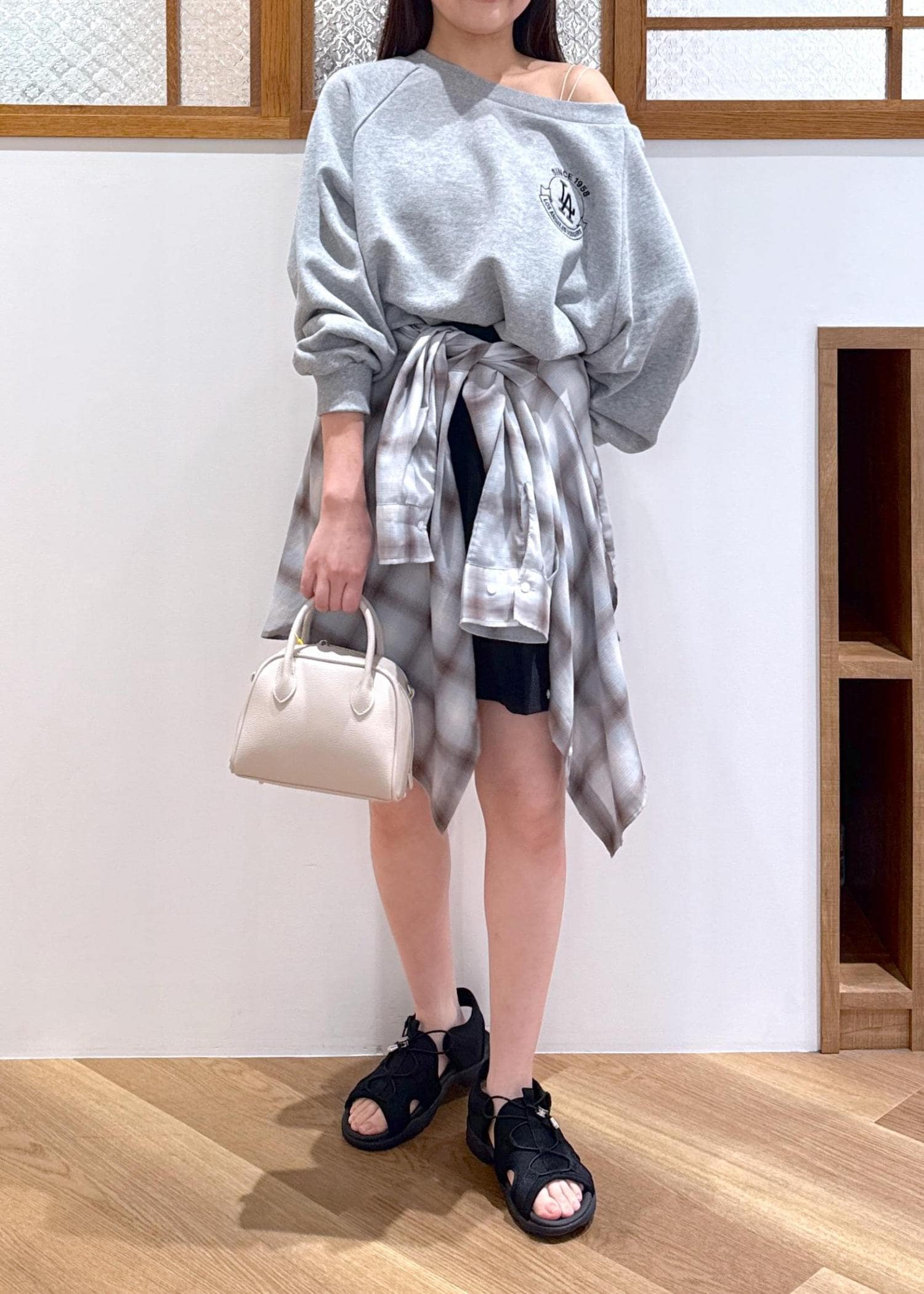肩出しで抜け感を作れるスウェットを主役にカジュアルなコーディネートを組みました。